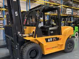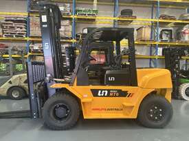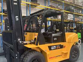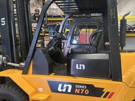 The UN N70 7.0T Diesel Forklift is a strong and reliable machine designed for heavy lifting. It can carry up to 7,000kg and lift loads up to 3 metres (9ft 10in). The diesel engine and automatic transmission make it easy to drive and well-suited for outdoor use. A tight turning radius of 3.1 metres helps in busy work areas, and 190mm of ground clearance allows it to handle uneven ground. With wide forks and strong hydraulics, this forklift is made to move big loads with ease.