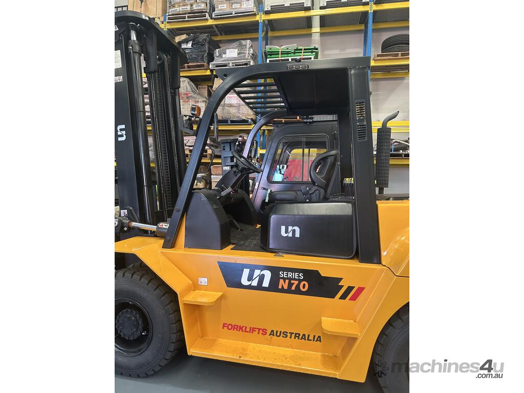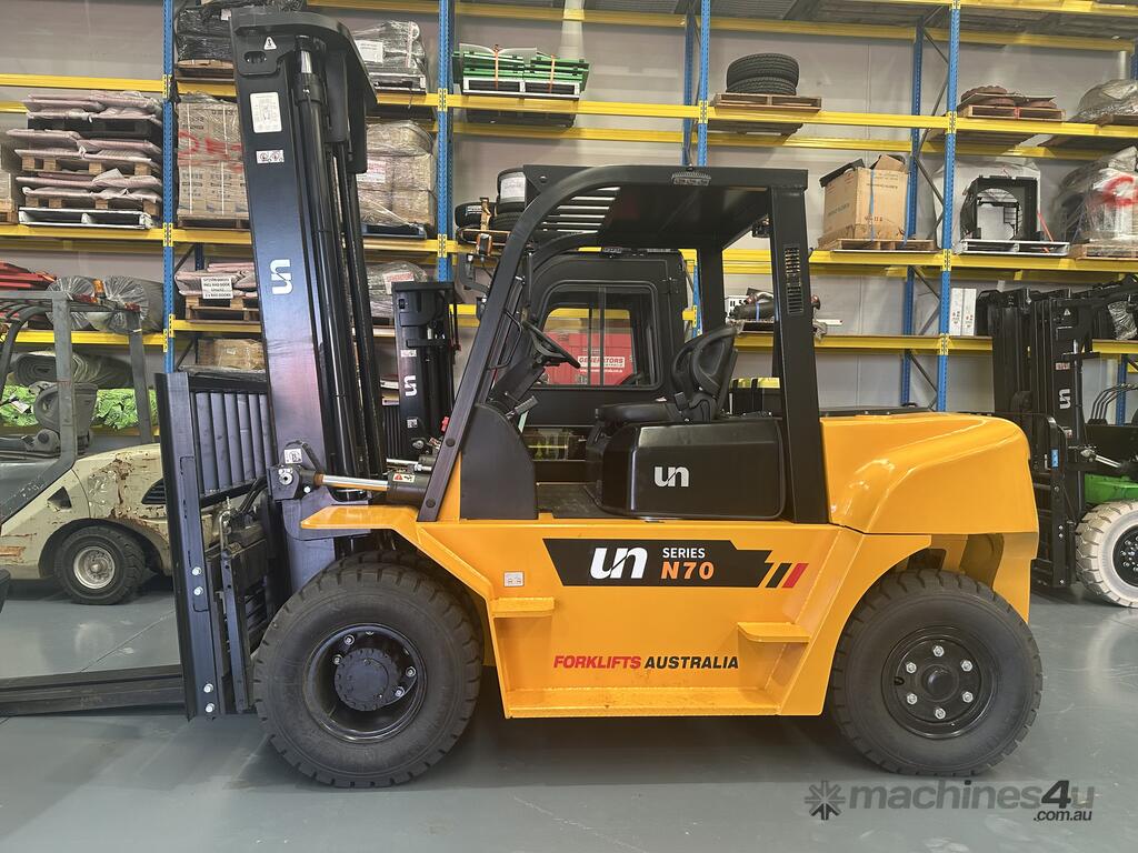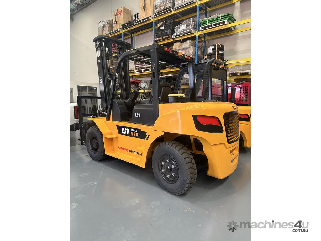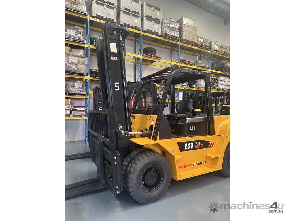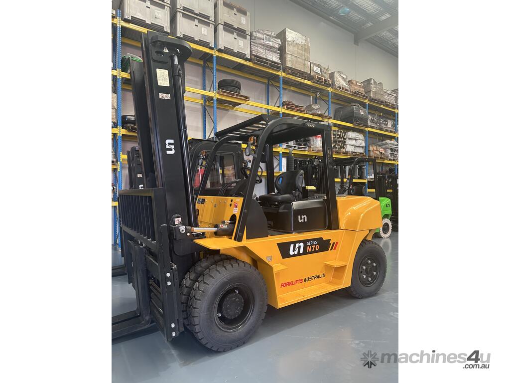 The UN N70 7.0T Diesel Forklift is a strong and reliable machine designed for heavy lifting. It can carry up to 7,000kg and lift loads up to 3 metres (9ft 10in). The diesel engine and automatic transmission make it easy to drive and well-suited for outdoor use. A tight turning radius of 3.1 metres helps in busy work areas, and 190mm of ground clearance allows it to handle uneven ground. With wide forks and strong hydraulics, this forklift is made to move big loads with ease.