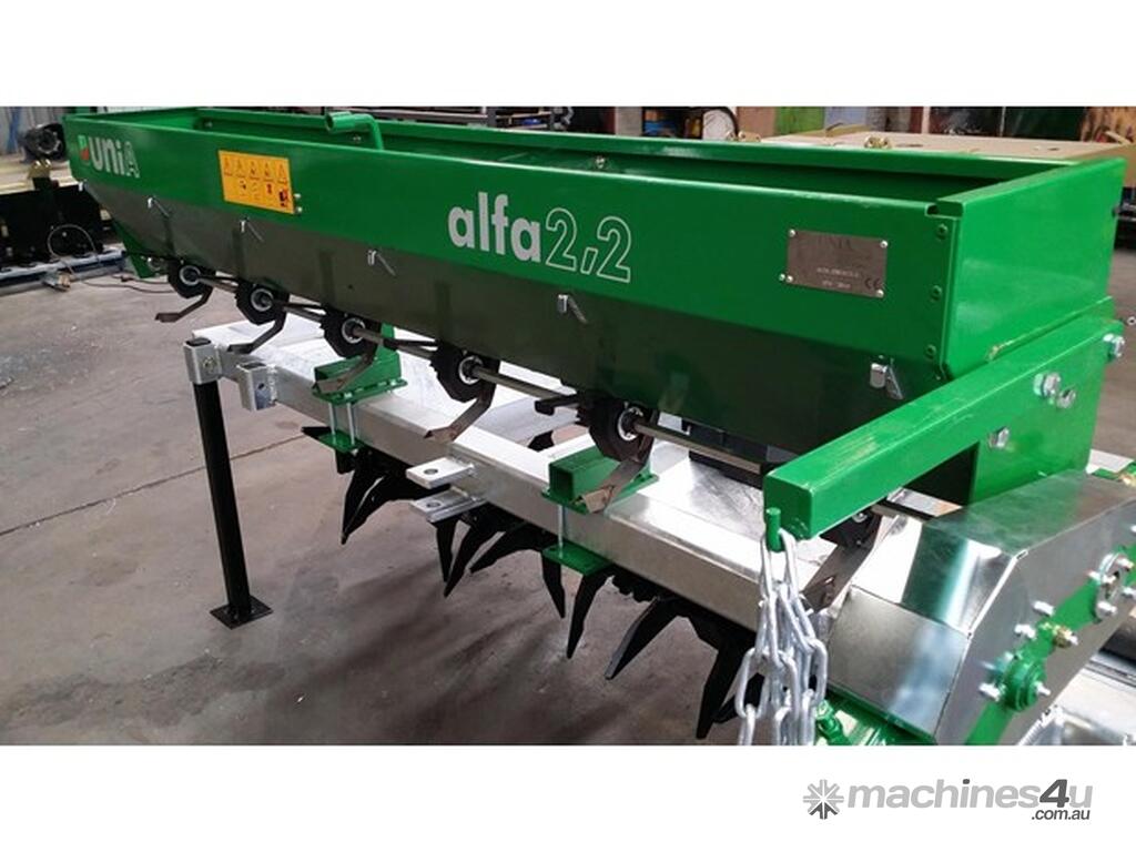 The Alfa seedbox is a seeder with a distributed sowing system, designed for sowing seeds simultaneously with stubble cultivation or after ploughing. Seeds are implemented into the soil by throwing between tillage section and packing section (roller) of the tillage machine. Material metering is made mechanically by the grooved sowing apparatus and material goes into the sowing lines connected with a spool installed before the roller.