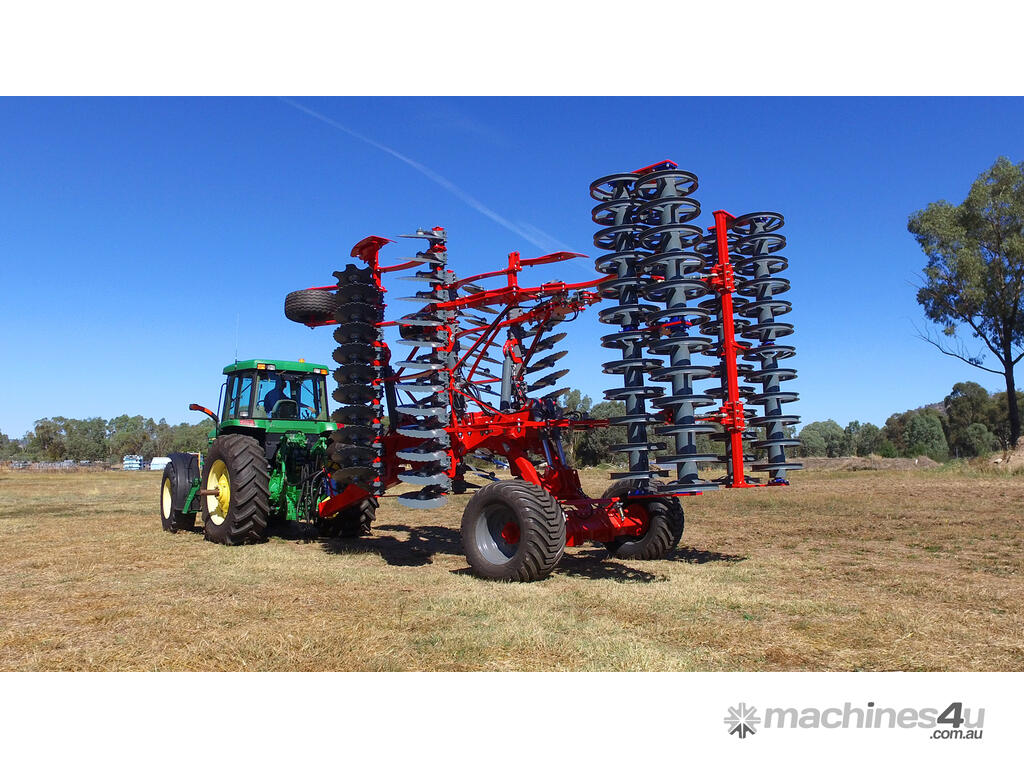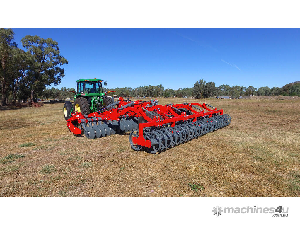 These machines come with two rows of corrugated discs angled in opposite directions from each other. These large-diameter discs enable aggressive cultivation and mixing of soil with large amounts of crop residues at a working depth of 15 cm.