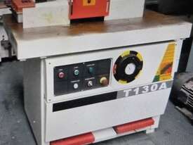 7. SCM T130NS L'INVINCIBILE SPINDLE MOULDER 5.5kw 7.5hp 415v SLIDING TABLE INCLUDING TENONING CLAMP, LATE MODEL, MADE IN ITALY, FOOT BRAKE / FOOT LOCK, 5-SPEEDS to 10,000rpm, FORWARD & REVERSE. HEAVY DUTY MODEL -THIS IS THE BIGGER MODEL THAN THE LIGHT DUTY T110, SET OF MANUALS / TOOLS. WELL ABOVE AVERAGE CONDITION, EX-GOVT. BETTER QUALITY THAN NEW SCM MODEL!! ADD THE HEAVY DUTY 4 x WHEEL POWER FEED MADE IN TAIWAN.