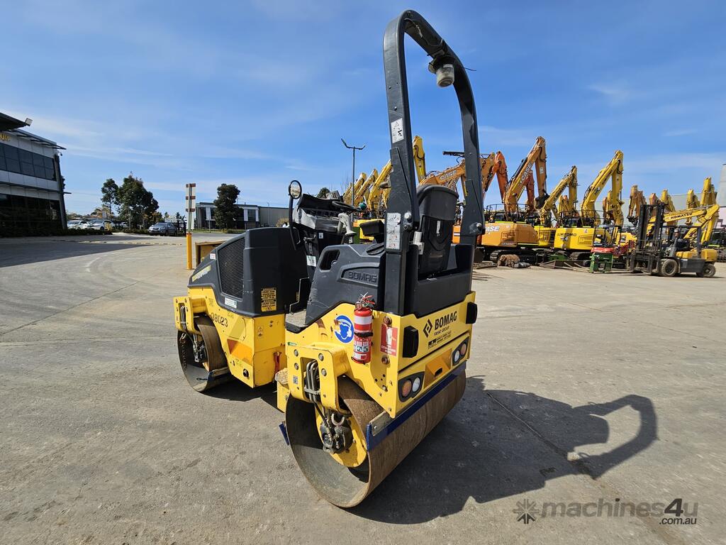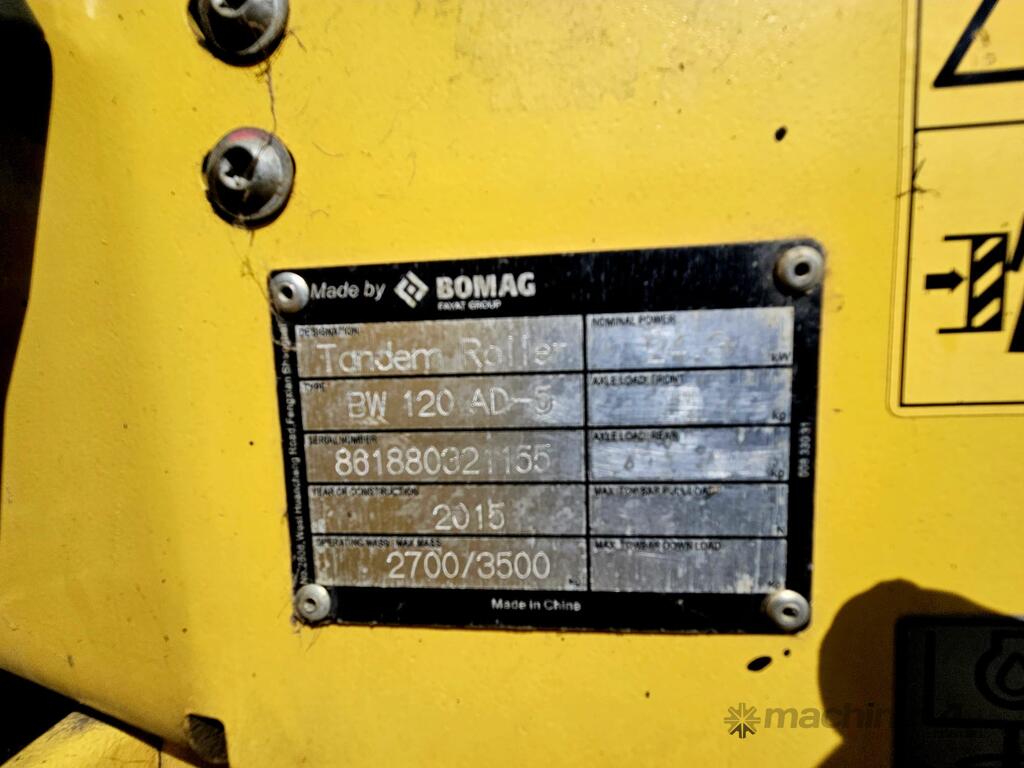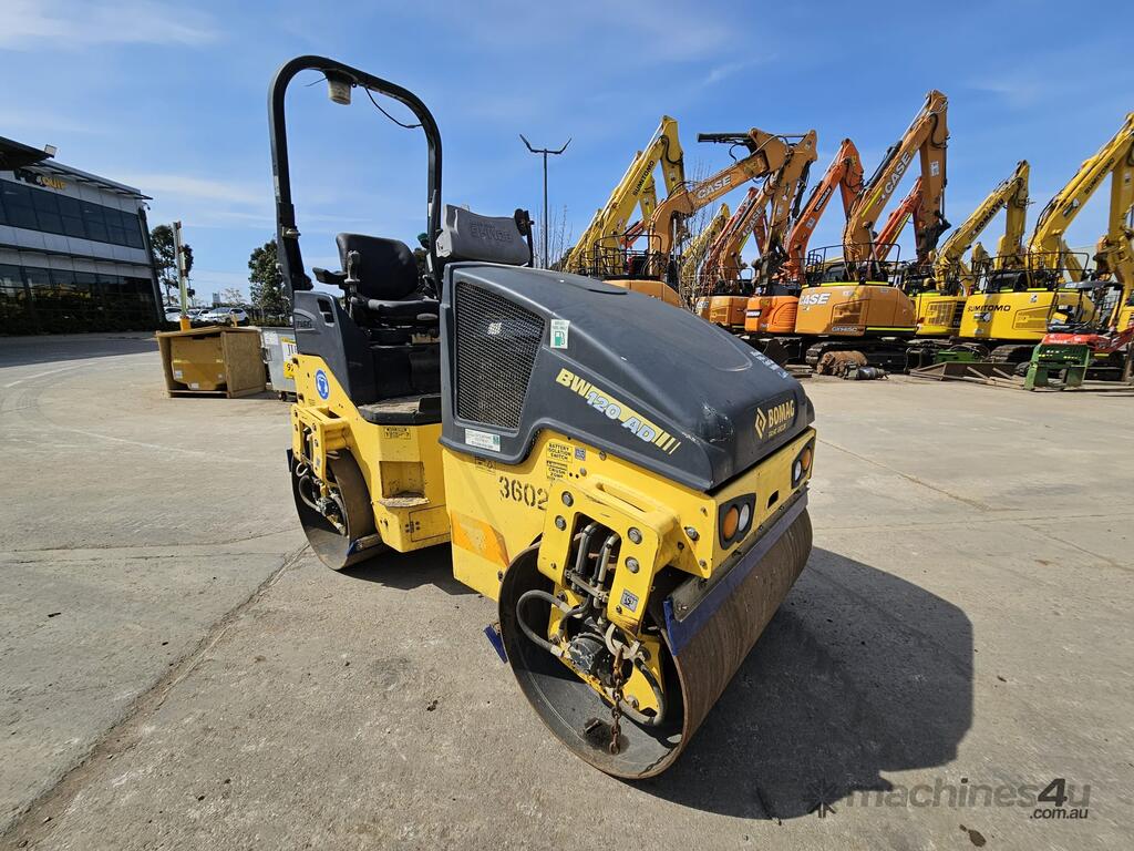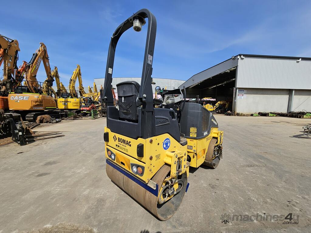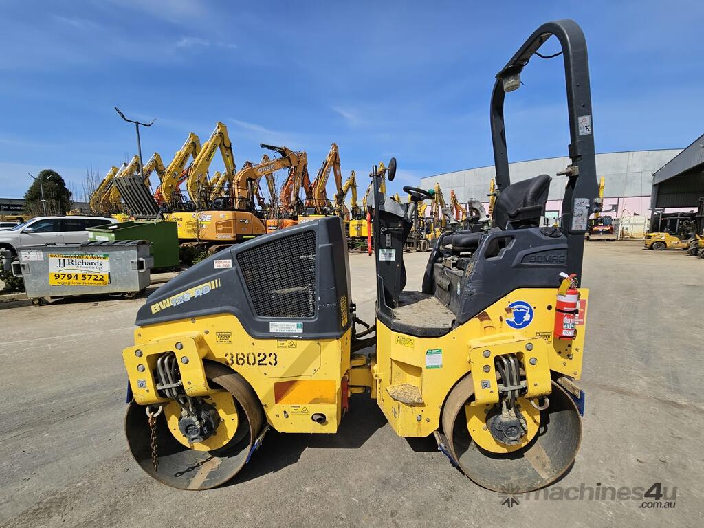 USED 2015 BOMAG BW120AD-5 3T TWIN SMOOTH DRUM ROLLER WITH 1015 HOURS, FOLDING ROPS CANOPY, ARTICULATED STEERING, SAFTEY BEACON, WATER SPRAYERS, SCRAPERS, DUAL FREQUENCY AND APLITUDE VIBRATION, 1200mm WIDE DRUMS. FULLY SERVICED AND READY FOR WORK WITH RISK ASSESSMENT. AVAILABLE NOW FOR SALE, RENTAL OR RENT-TO-BUY OPTIONS.