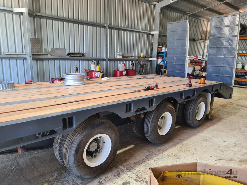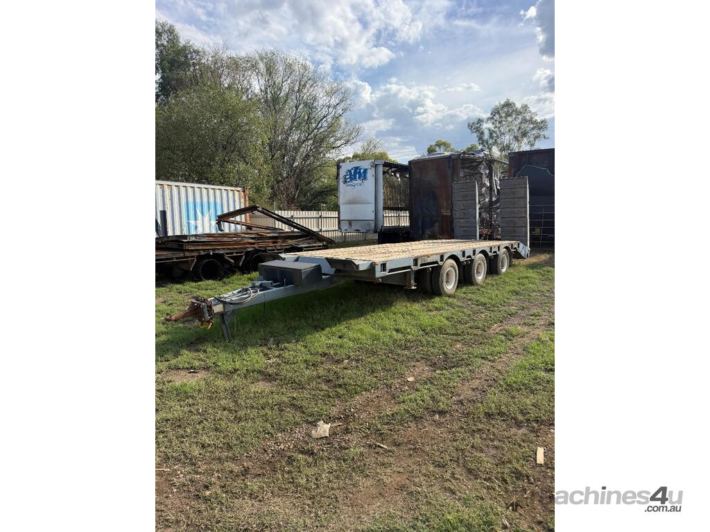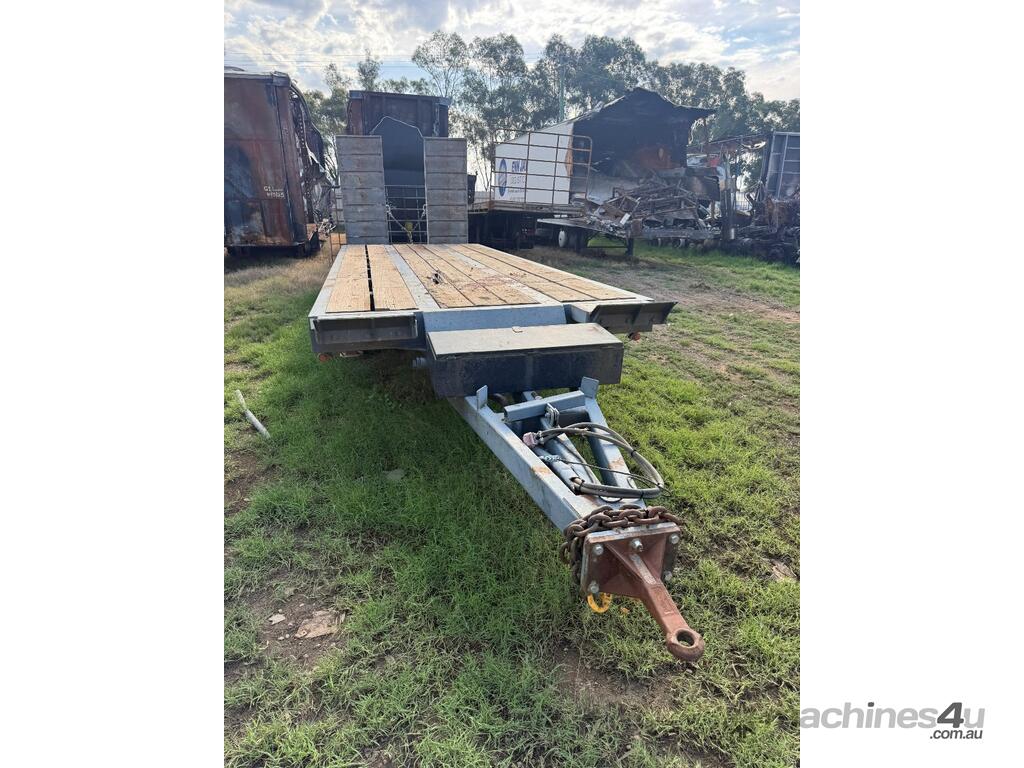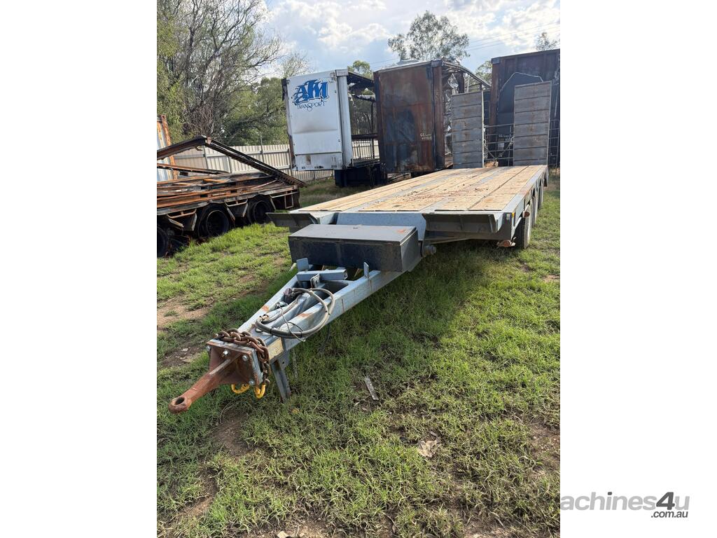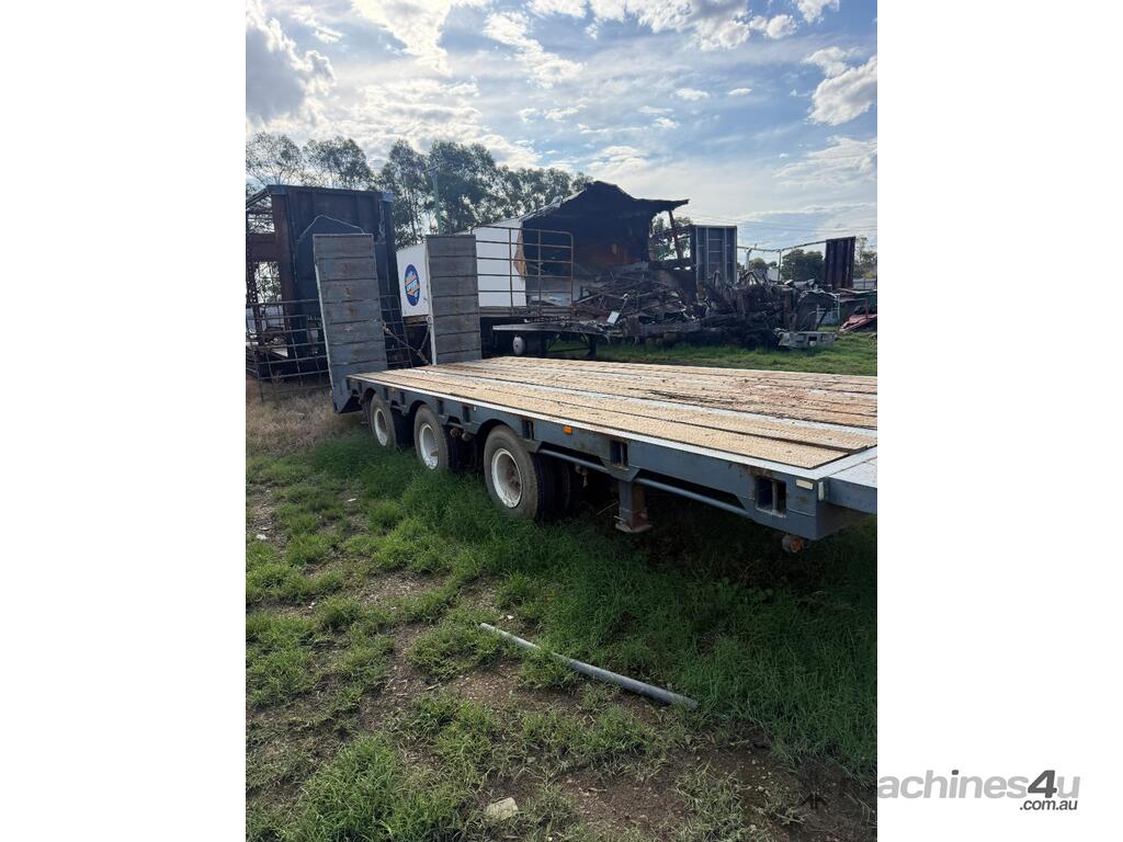 USED 1989 LUSTY TRI-AXLE PLANT TRAILER WITH RING FEDER HITCH, TIMBER DECKING, SOLID CHAIN POINTS IN COMBING RAILS, HYDRAULIC RAMPS, LOW DECK HEIGHT FOR EASY LOADING, VERY STRONG TRAILER. 45,000kg ATM RATED