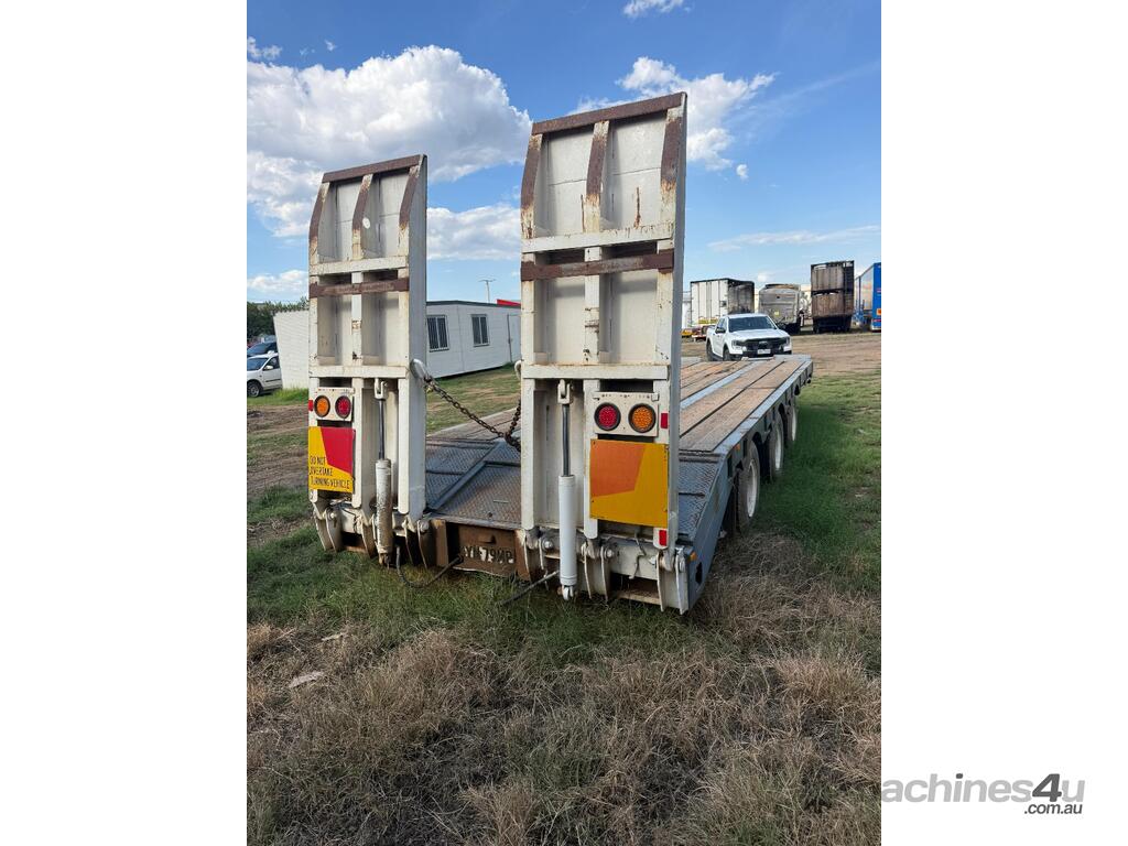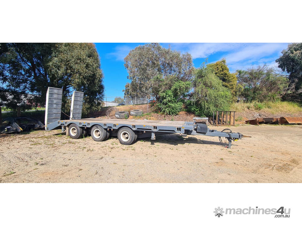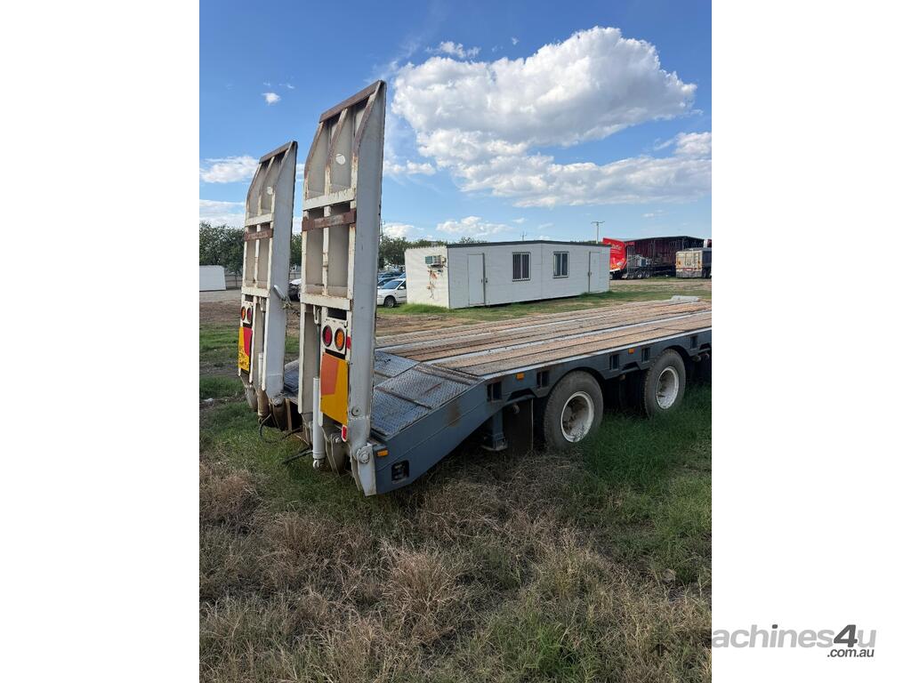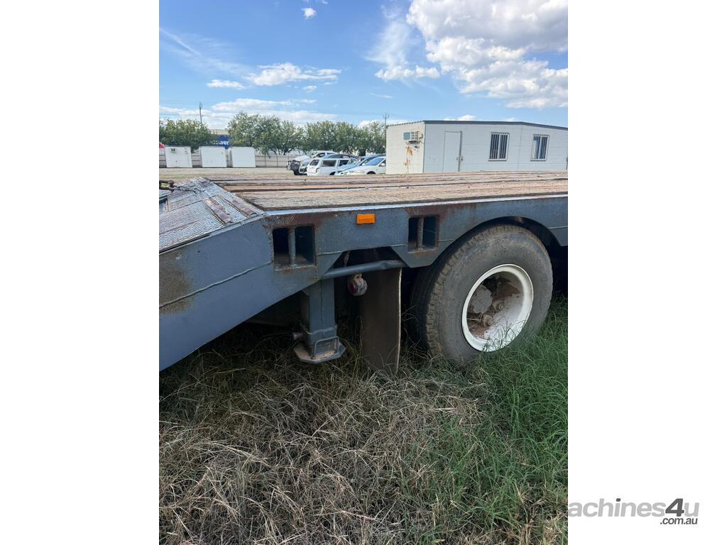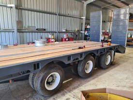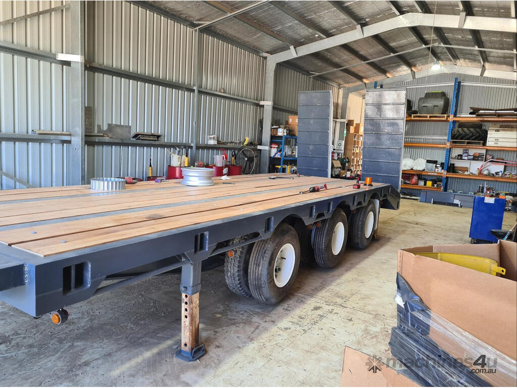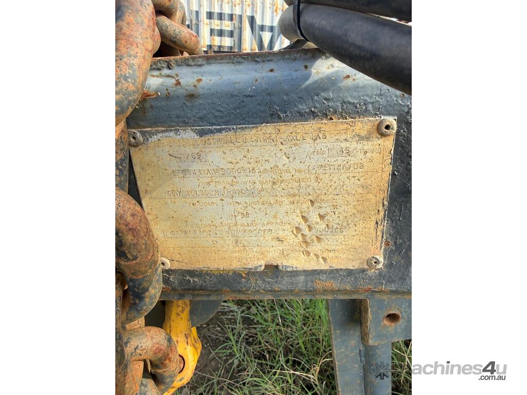 USED 1989 LUSTY TRI-AXLE PLANT TRAILER WITH RING FEDER HITCH, TIMBER DECKING, SOLID CHAIN POINTS IN COMBING RAILS, HYDRAULIC RAMPS, LOW DECK HEIGHT FOR EASY LOADING, VERY STRONG TRAILER. 45,000kg ATM RATED