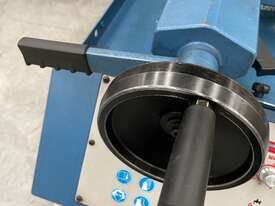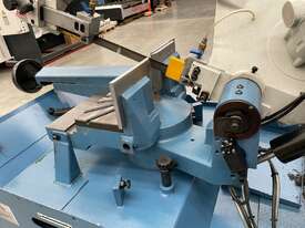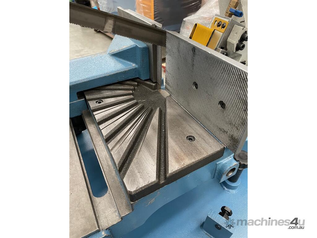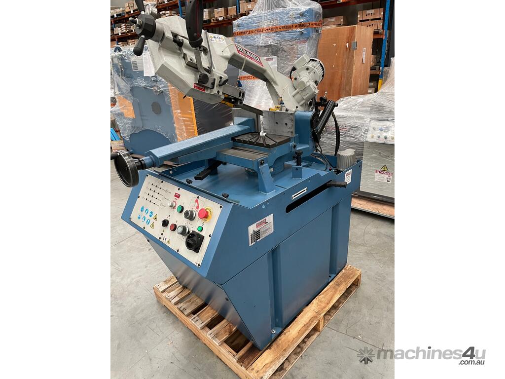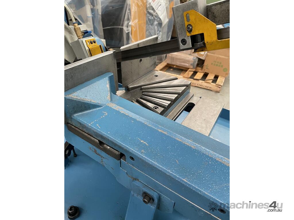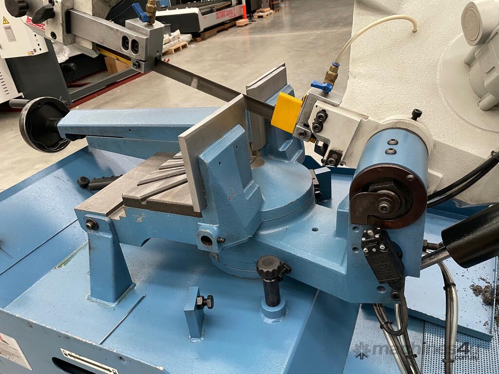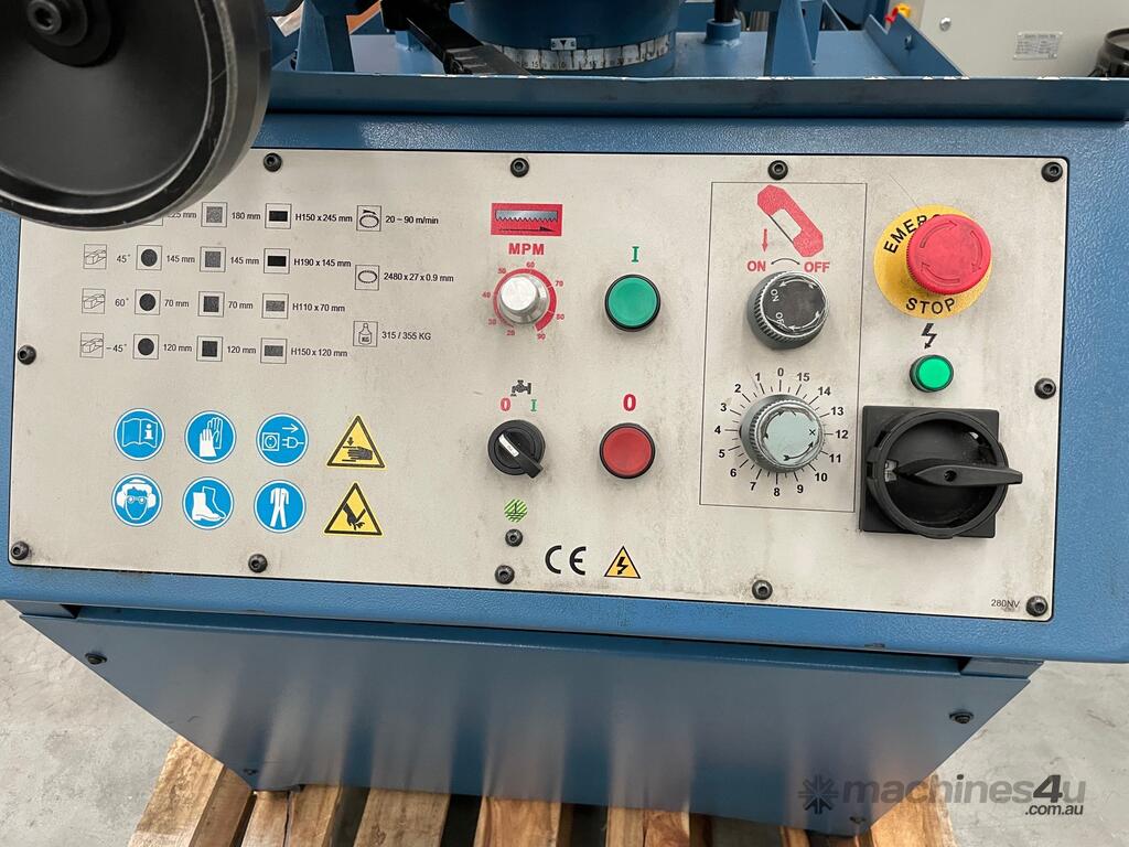 USED - Late model SM-HBS280V - Volt Bandsaw Double Mitre. 245mm x 150mm Capacity, 20 ~ 90 Vari Speed, Coolant,Hydraulic Down feed, Trigger Switch, Blade Tension, Integrated Stand, Quick Set Angle & Vice.