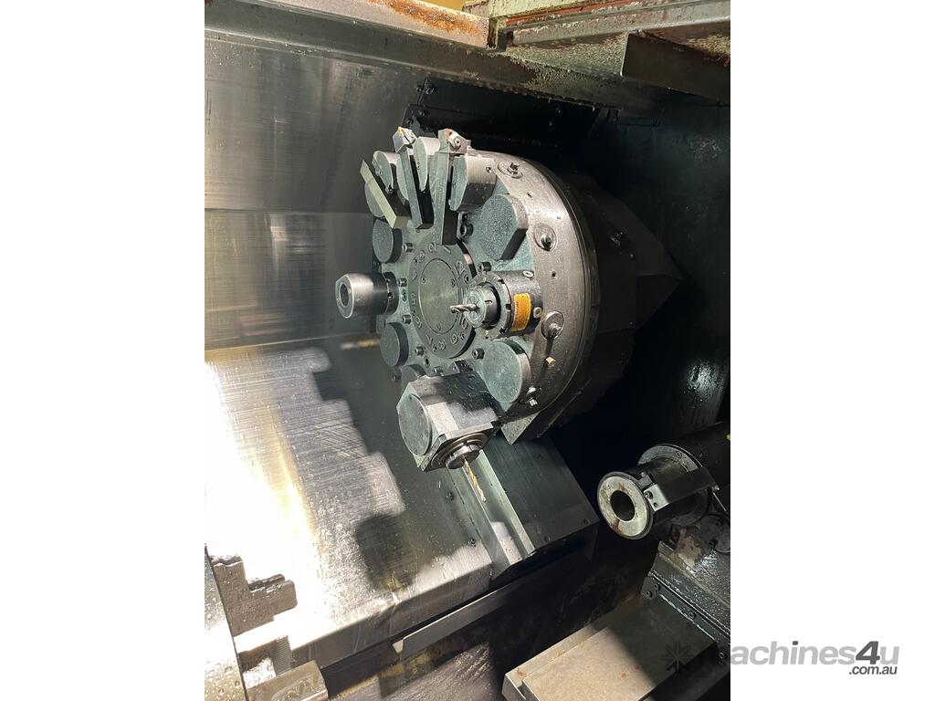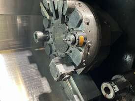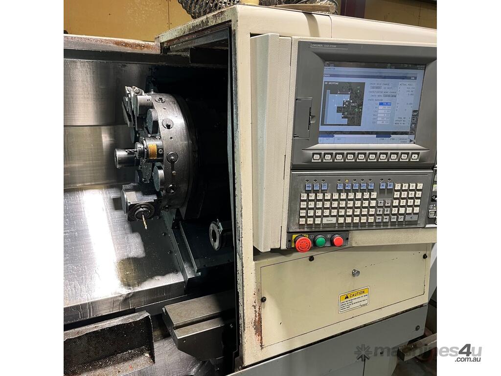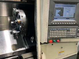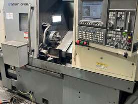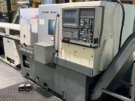 Used Okuma CNC Soarer Model L300M with OSP-P20L Controller and QLS-80 Quick Load Servo 80 Bar loader with 12,243 running hrs.
