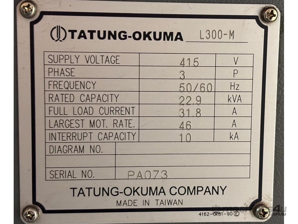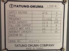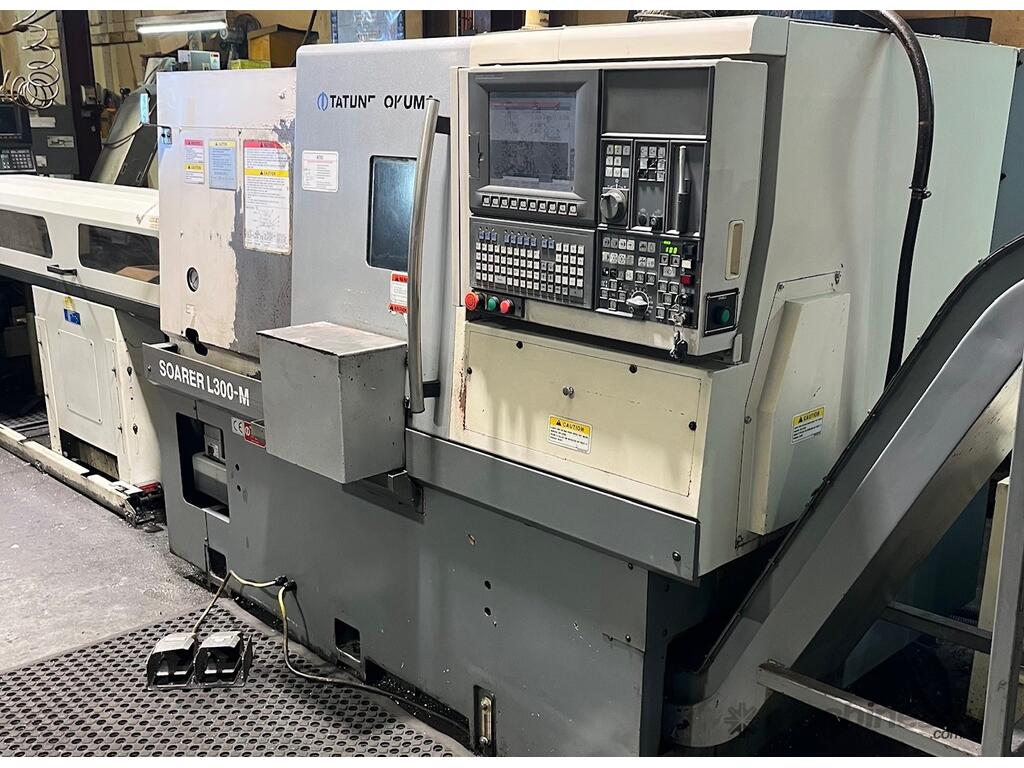 The Okuma L300-M "Soarer" CNC lathe from 2010 features a 12-position turret, a 3.15" spindle bore with an A2-8 spindle nose, a maximum turning diameter of 11.18" and length of 17.7", X/Z axis travel of 9.05"/20.47", and a spindle speed of 25-3000 RPM with a 10-20 HP main motor.