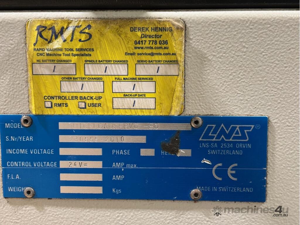 The QLS80 bar loader is an LNS Quick Load Servo bar feeder, designed for short bar stock, with specifications including a maximum bar diameter of 80 mm (though the "+” version supports 100 mm and larger), a 1605 mm bar length capacity in its original configuration, and the ability to accommodate round, hex, square, and odd-shaped materials. It features high feed rates (up to 4,000 IPM), quick changeovers (15 seconds), and a servo-driven system for precise bar positioning.