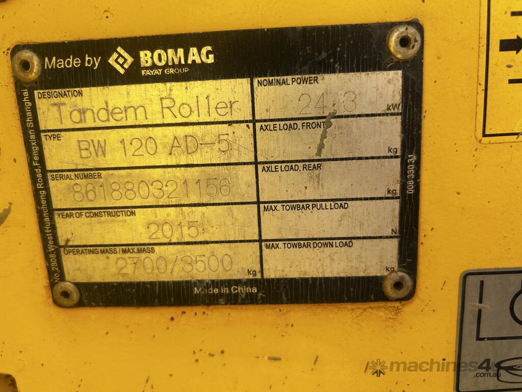 Great Condition Bomag AW-120. Recently traded for a new machine, this is ready for work and priced to sell. Come with road light Kit, fire extinguisher and ready for immediate work.