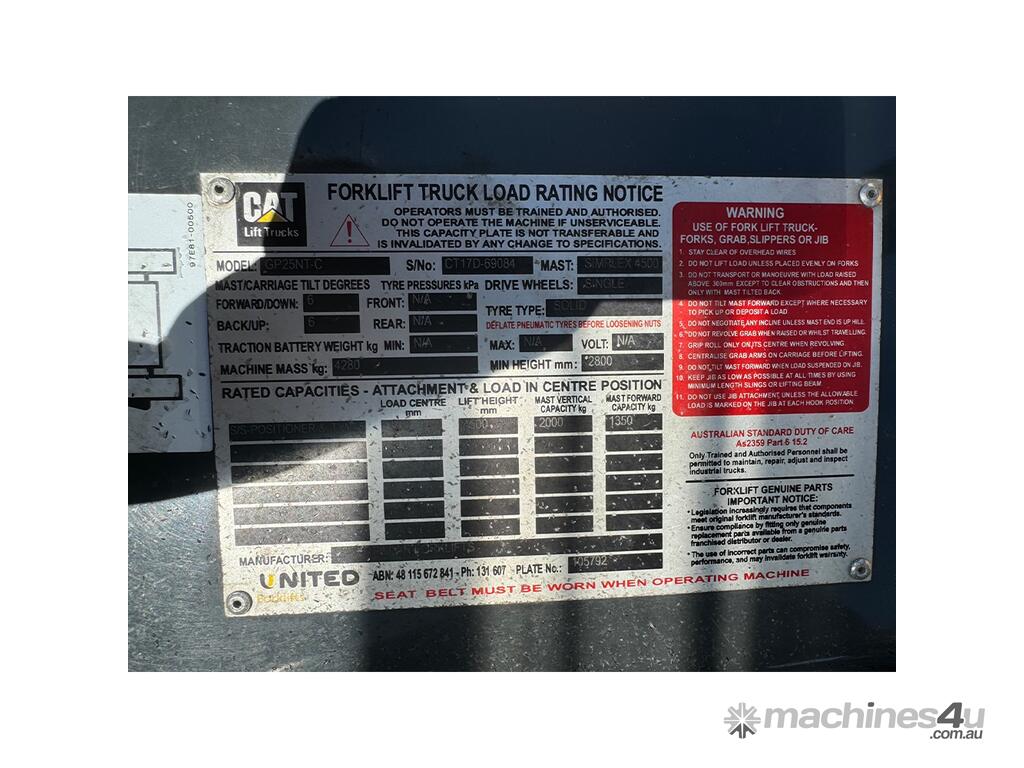 Used Cat 2.5T LPG Forklift - GP25N (Sydney NSW) :      $18,000 AUD($19,800 Inc. GST)