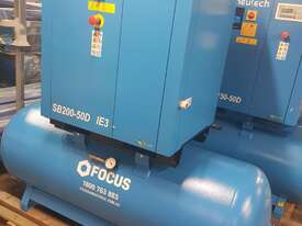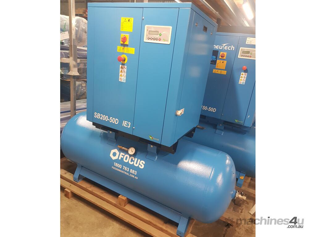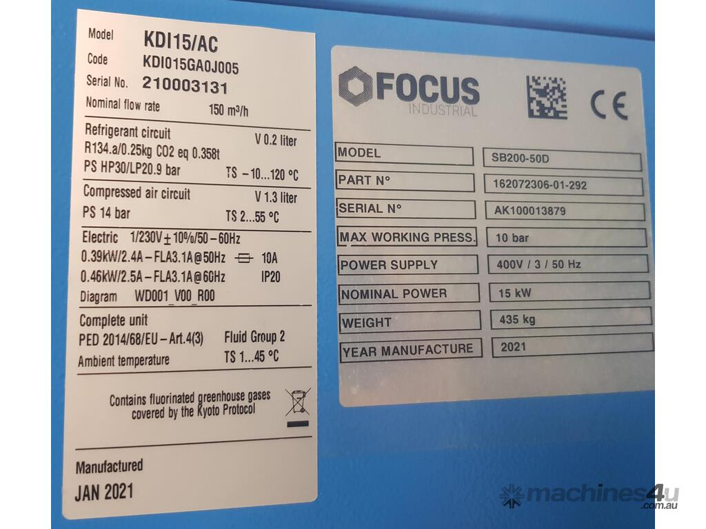 3). FOCUS SB200-50D IE3 15kw 20hp 415v 10 BAR 71CFM 3-IN-1 FULLY FEATURED ROTARY SCREW COMPRESSOR Year 2021 MADE IN ITALY, INCLUDING BUILT-IN REFRIGERATED AIR DRYER 240v MOUNTED ON 500 LITRE AIR RECEIVER TANK, FILTERS, AUTO DRAIN 240v, GENUINE EXTREMELY LOW 1,000 RUN HOURS, DECEASED ESTATE. EXTREMELY QUIET 68dba, PREMIUM QUALITY. AS NEW. REFER ATTACHED BROCHURE. SAVE $ 000's! NEW PRICE $ 13,935 + GST ($ 15,330 INCLUDING GST).