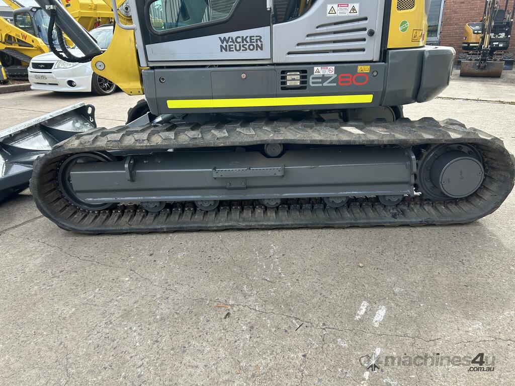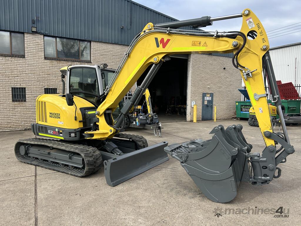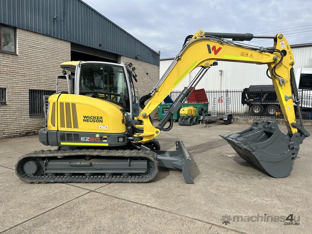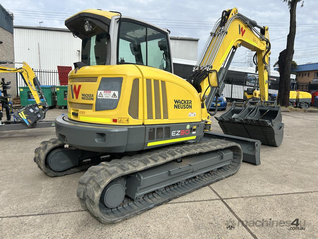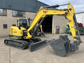 Excellent Condition Wacker Neuson EZ80 with hydraulic Tilt Hitch. This is the most powerful 8tonner on the market with outstanding bucket breakout force. Everything you would expect from a German Engineered excavator with LUDV load-sensing hydraulics from Bosch-Rexroth. The most comfortable cab on the market with an air-ride heated high-back seat and full climate control. This machine is ready for immediate work, fitted with a tilt Hitch and full set of buckets.