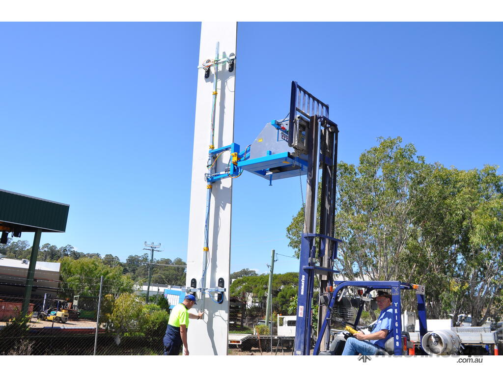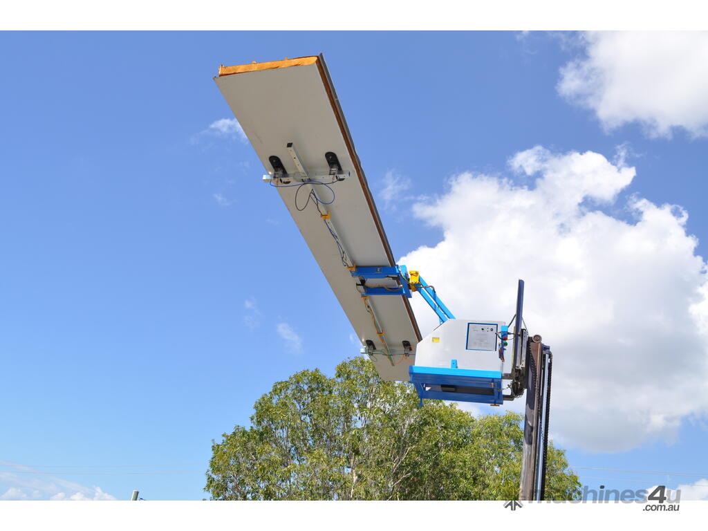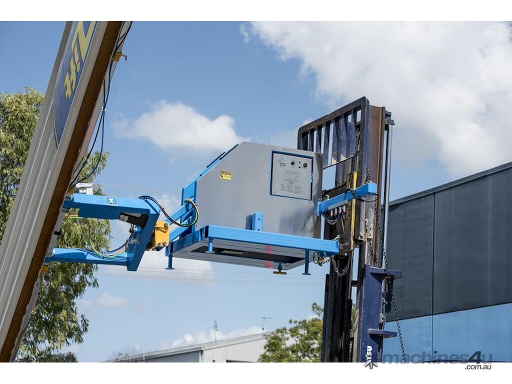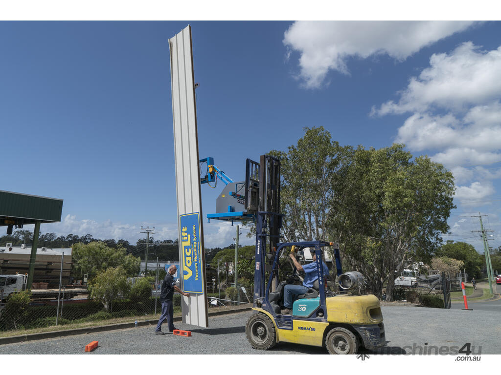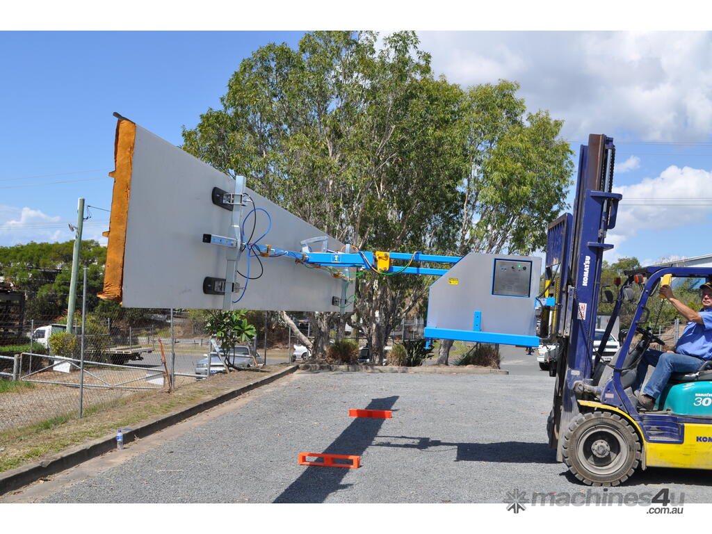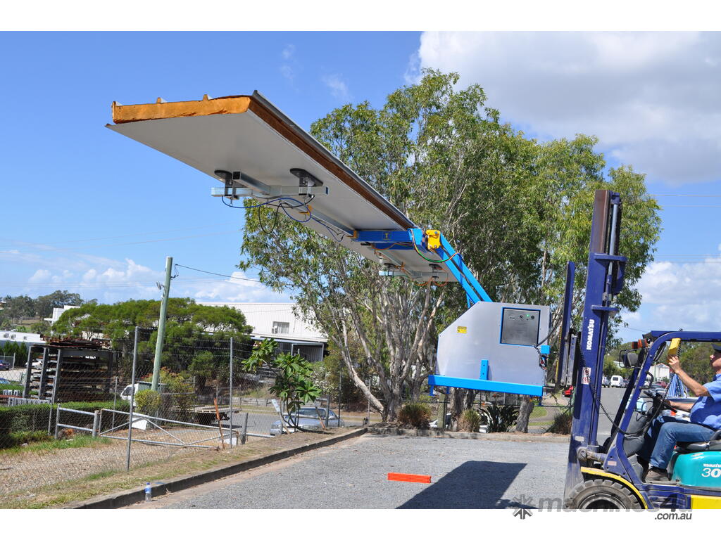Vaclift vacuum lifter - FVL350-R180CMS Forklift unit. Fully self contained battery powered Vaclift unit for installation of interior/exterior wall cladding and ceiling panels. High overhead hydraulic power lift, battery powered actuator for 180 degree panel rotation and manual slew function plus 180 degree powered vertical panel rotation. Saves time and increases safety during panel installation. Supplied with Vaclift standard contour pads designed to fit the majority of composite panel profiles.