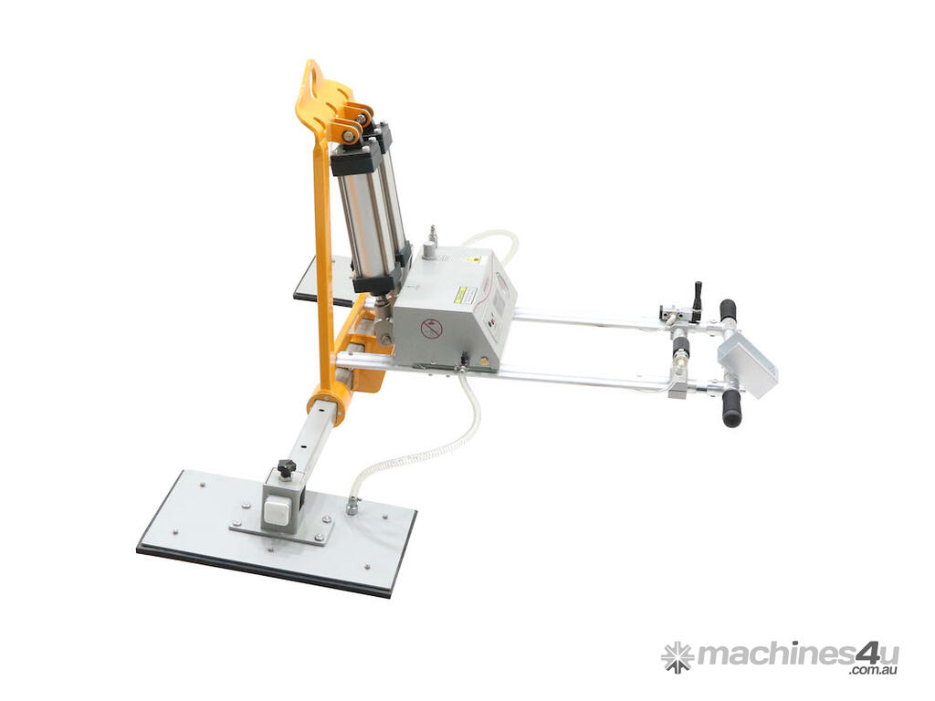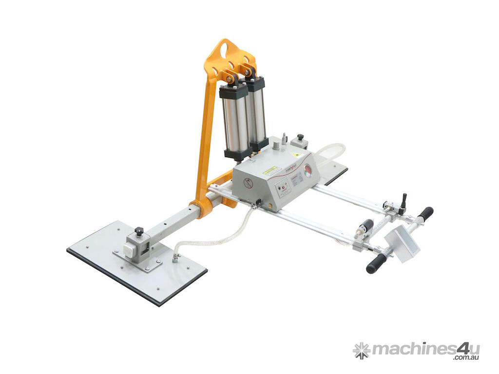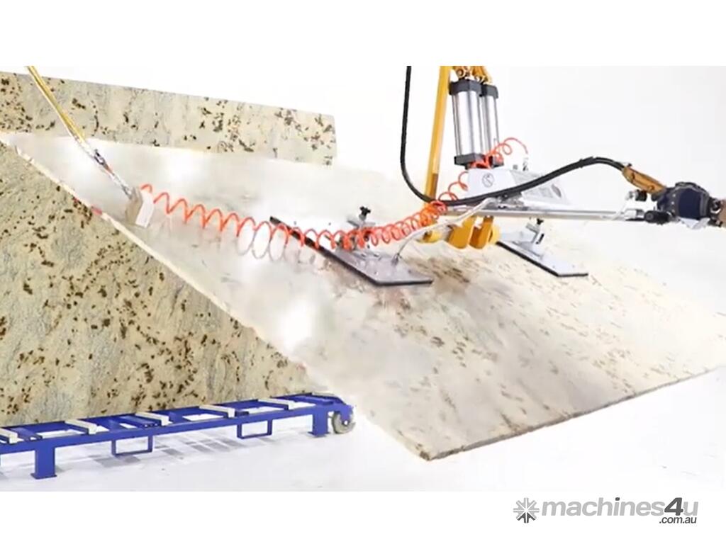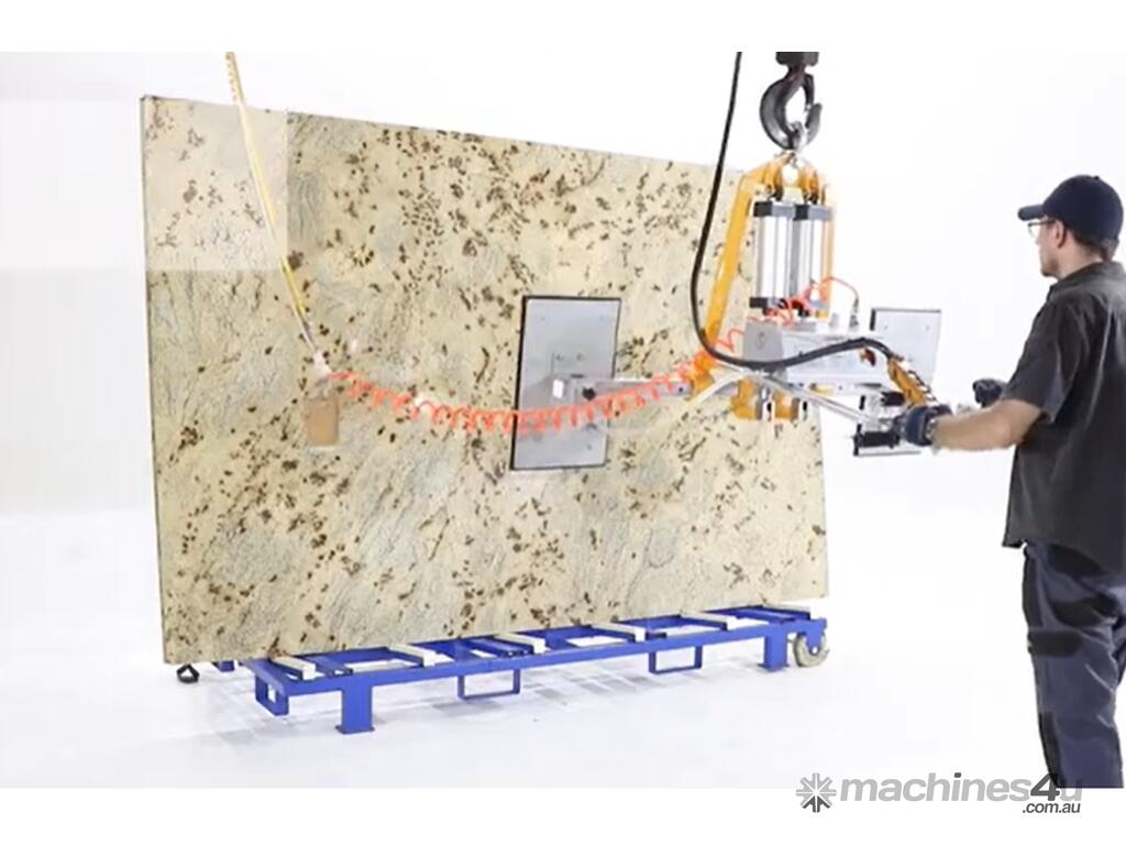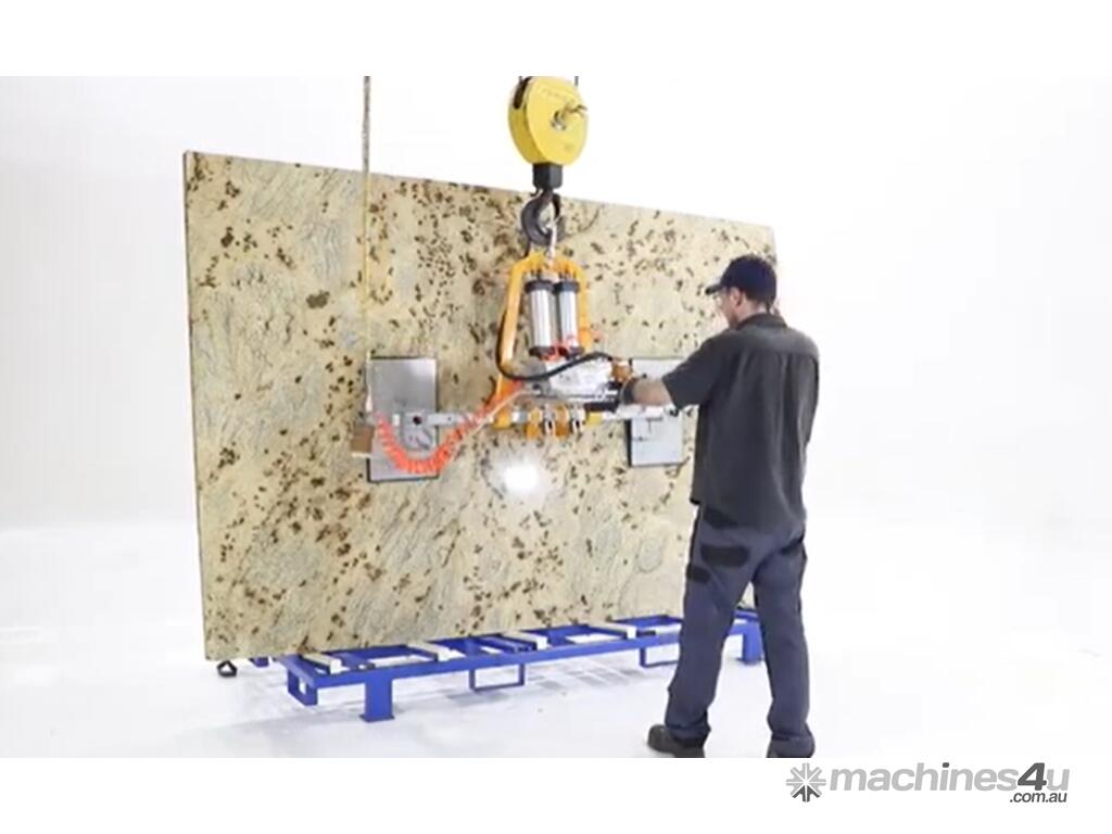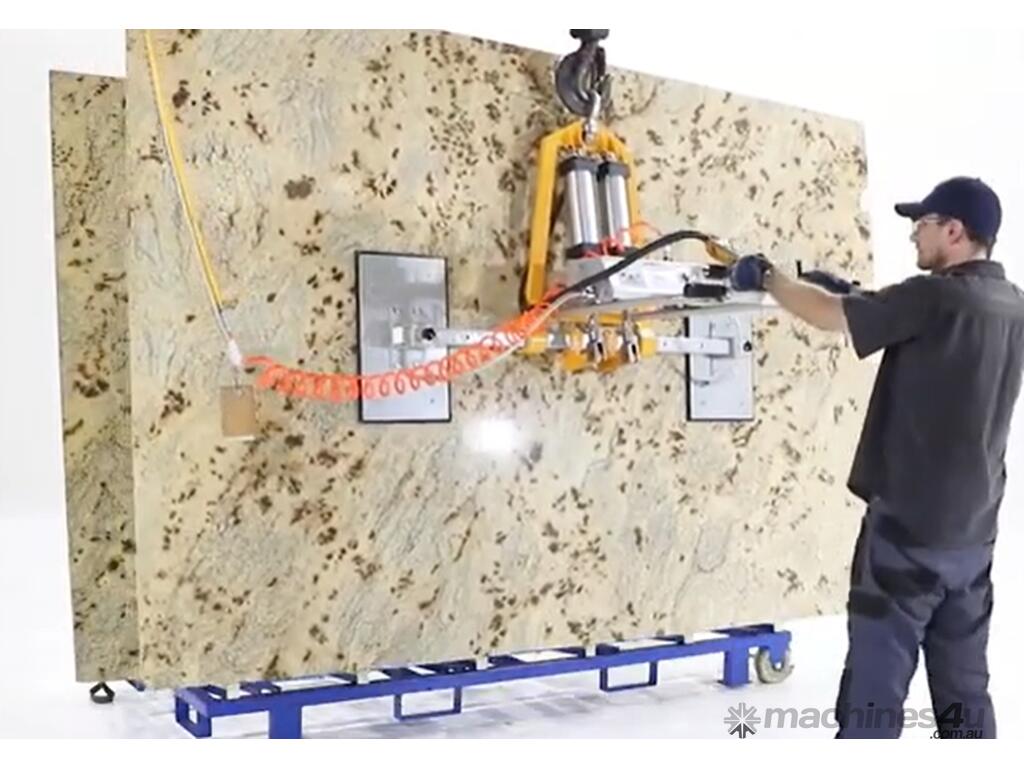 This vacuum lifter is designed to lift smooth or rough marble and granite slabs. Featuring rugged construction with the ability to lift and tilt materials. Powered by compressed air.