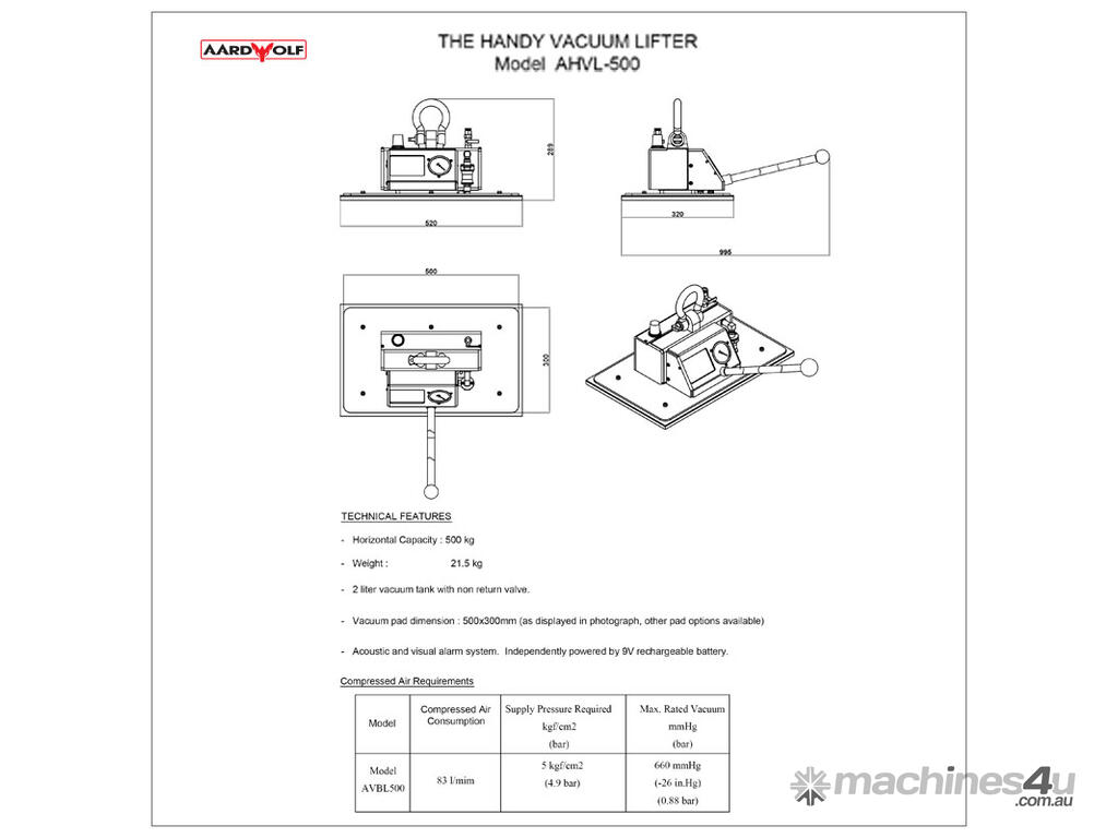 The AHVL500 is powered by a venturi vacuum generator, which needs a source of compressed air in order to function, but requires no electricity. The vacuum generator has no moving parts and therefore no lubrication is required.