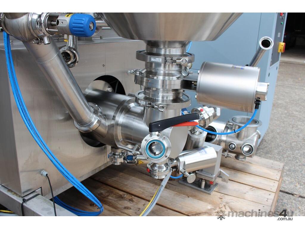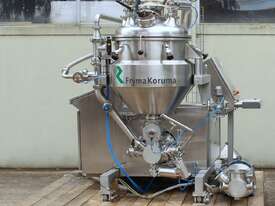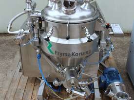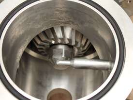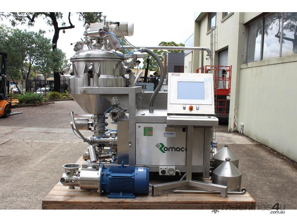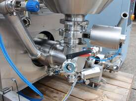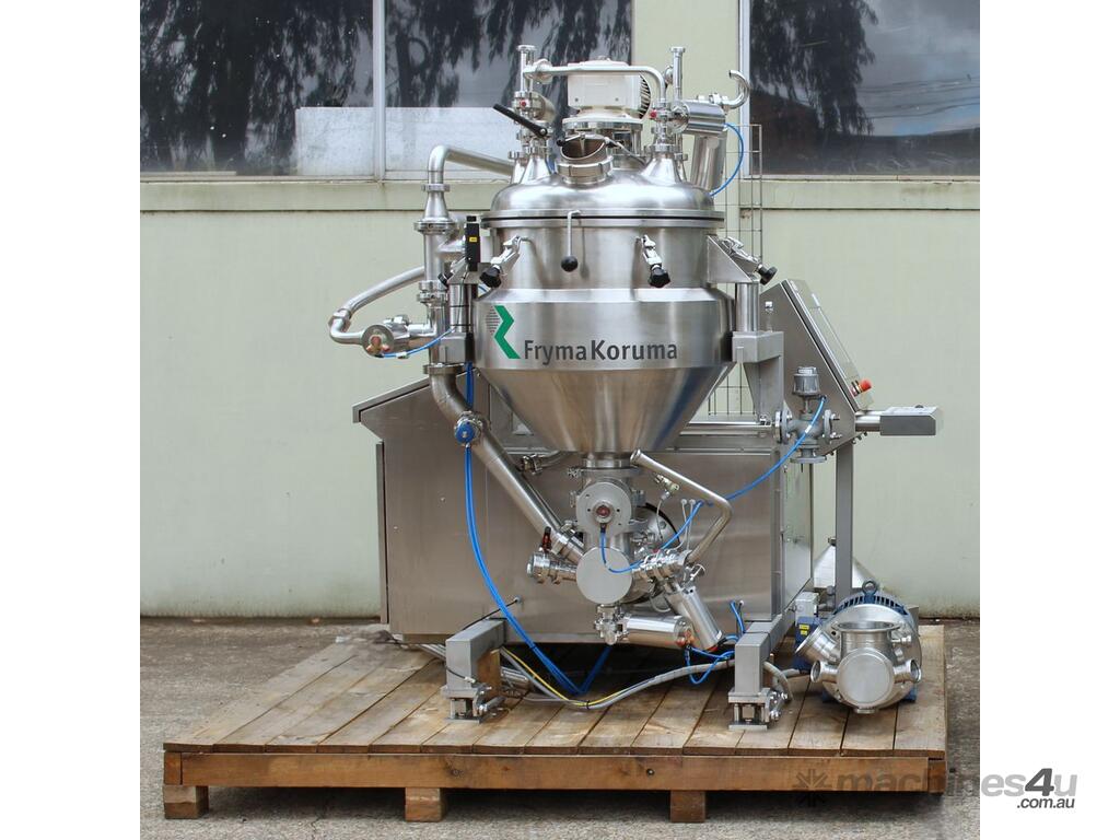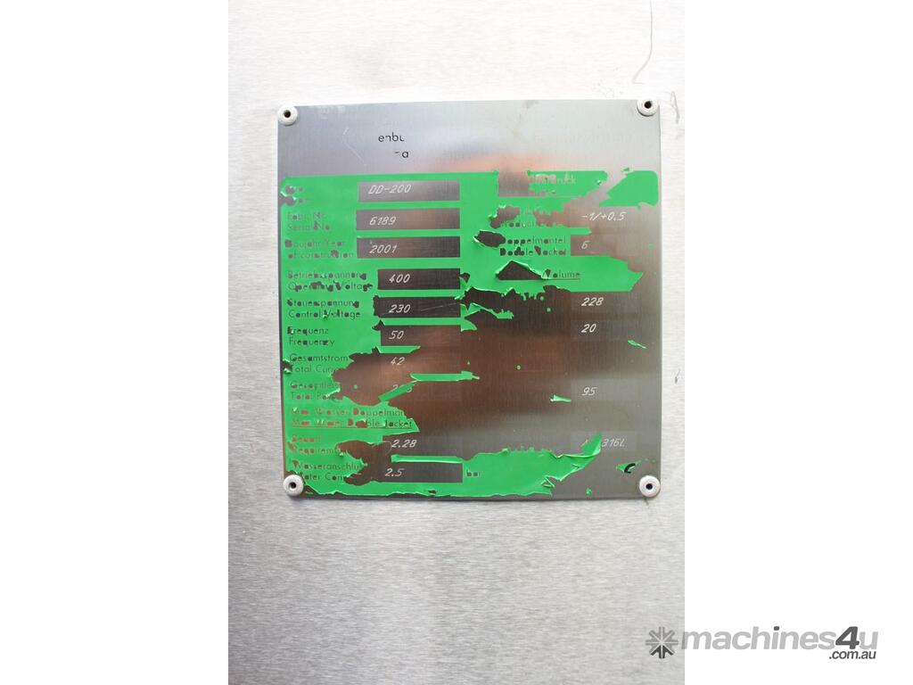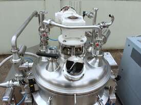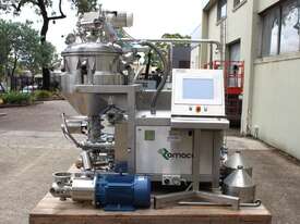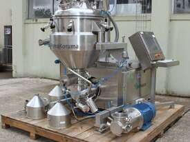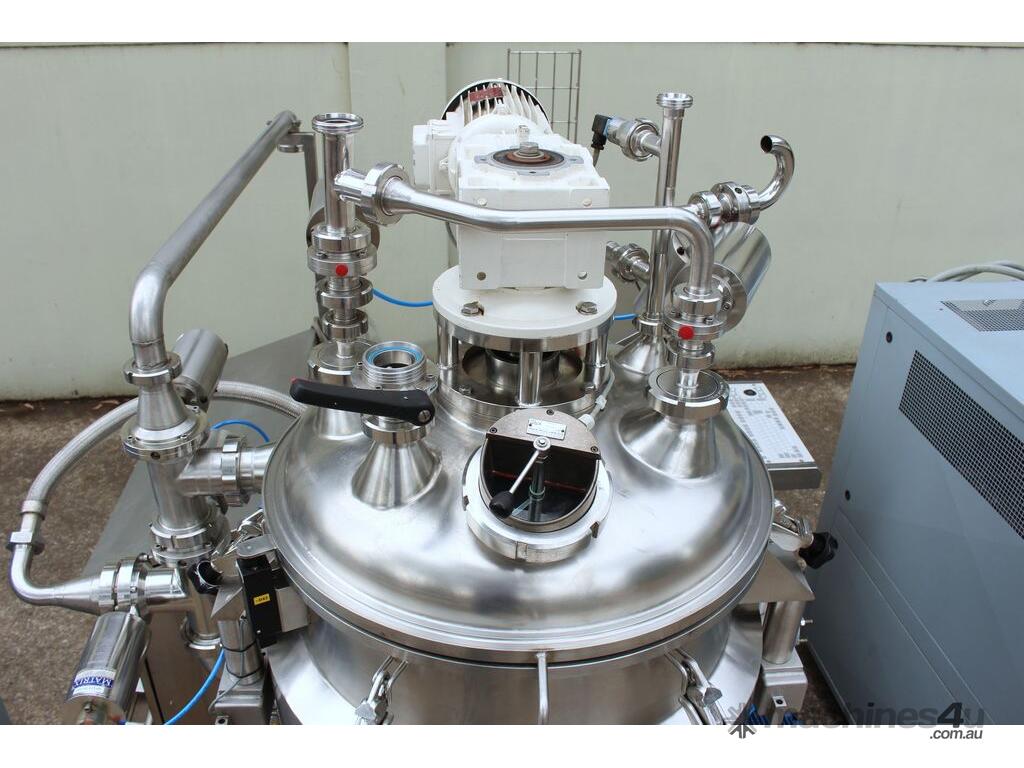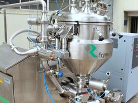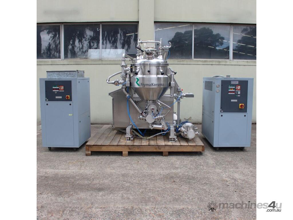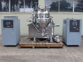 Vacuum Mixing Vessel, "Fryma Koruma" model MaxxD 200, 200 litre unit with 160 litre working capacity (minimum 30 litre), conical vacuum mixing tank with top entry 1.5kW 32rpm agitator and side scrapers feeding to inline 18.5kW tooth mill homogeniser operating 600–3000rpm, complete with 1.5kW vacuum pump, vessel rated vacuum -1 to 0 bar and double jacket pressure max 6 bar, all stainless steel wetted parts, 3 phase power supply, suitable for semi-solid products up to 80,000 cP viscosity, Vessell built in 2001 and upgraded in 2010 with the addition of Profesional "AZO" control system, supplied complete with "Dr Dinkelacker Energiesysteme" heater unit type TT135/PHE/LK S/N 01 1018 (hot water generator, 3 phase, 53VA, mobile) and chiller unit type TT23000/RB S/N 01 1019 (chilled water generator, 3 phase, 7.2VA, mobile