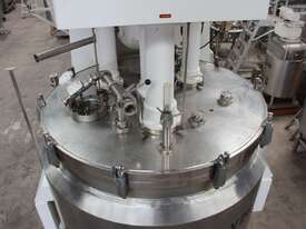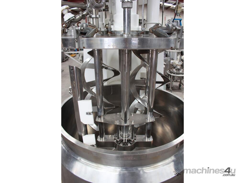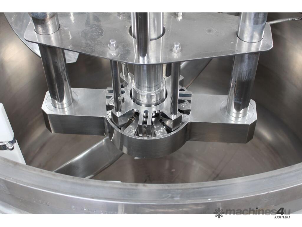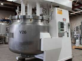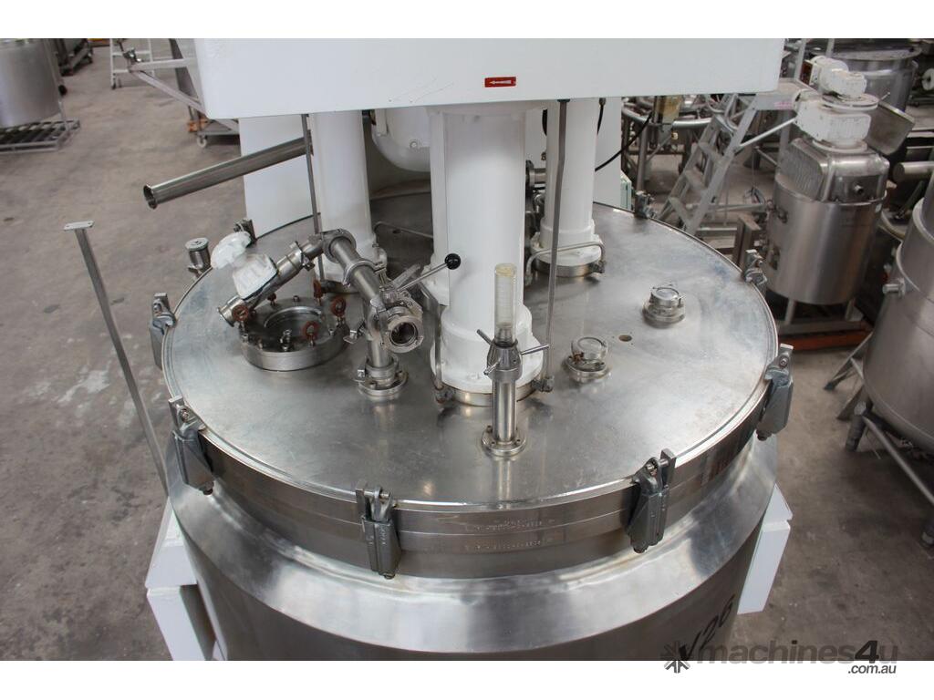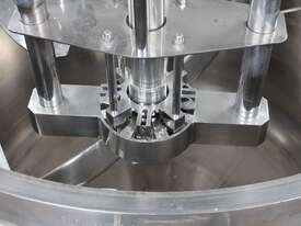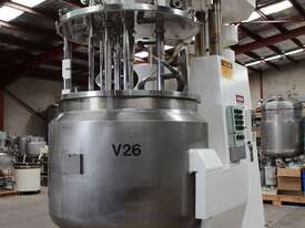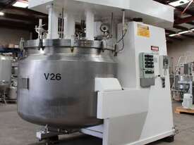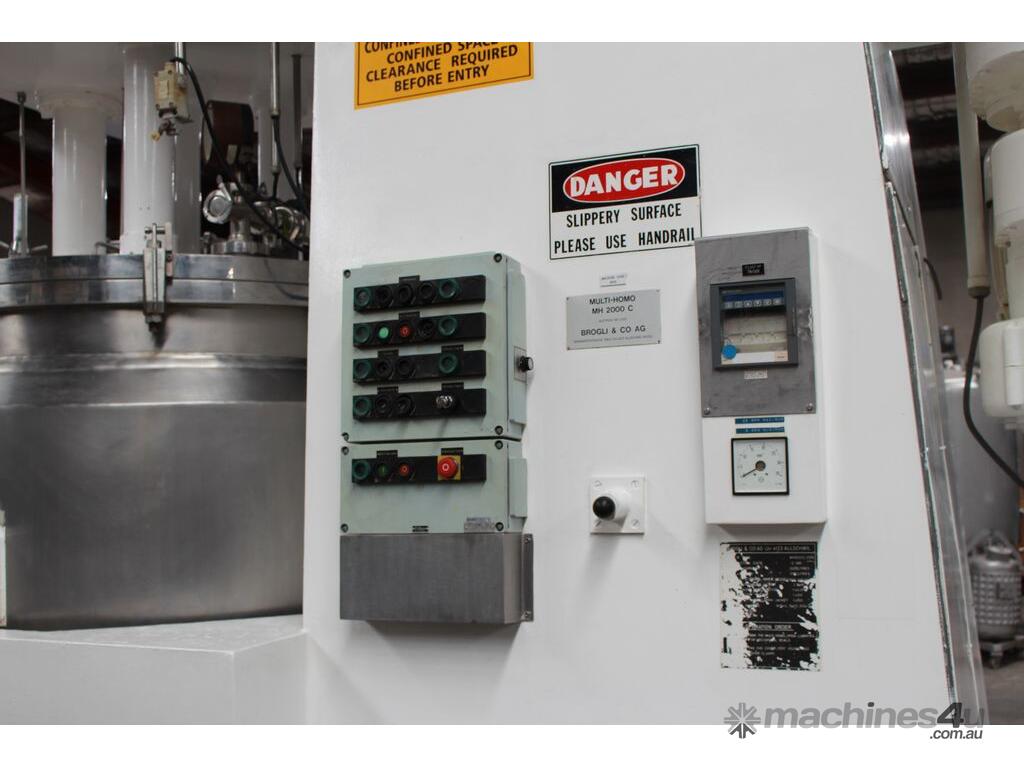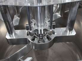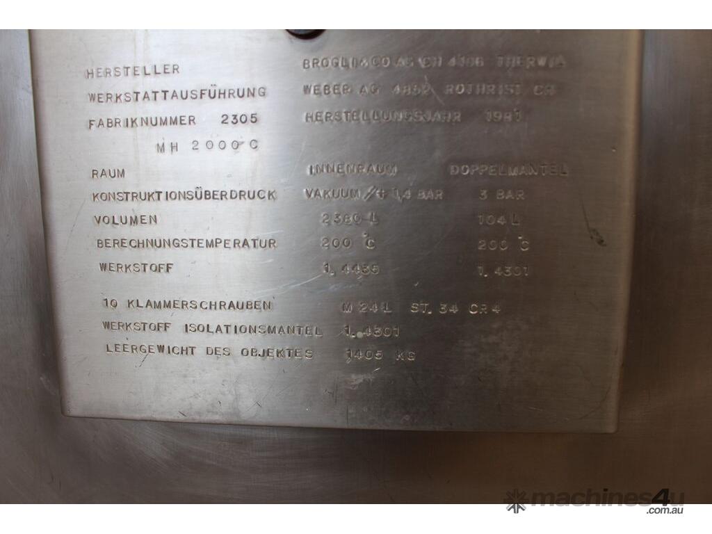 Vacuum Jacketed Processing Vessel, "Brogli" model MH-2000C, year: 1981, capacity: 2,380L, 200degC with internal vacuum and 1.4 bar pressure, 3 bar steam jacket, Stainless steel wetted parts, electrically lift out lid with clamps complete with sight view window, multiple inlets, scrape surface mixer, 2 x ribbon style rotary flow breakers, high shear batch emulsifier mixer with adjustable stator, dished bottom to a centre outlet with valve