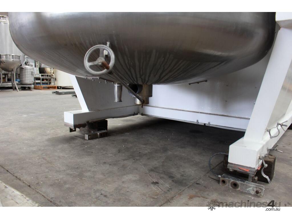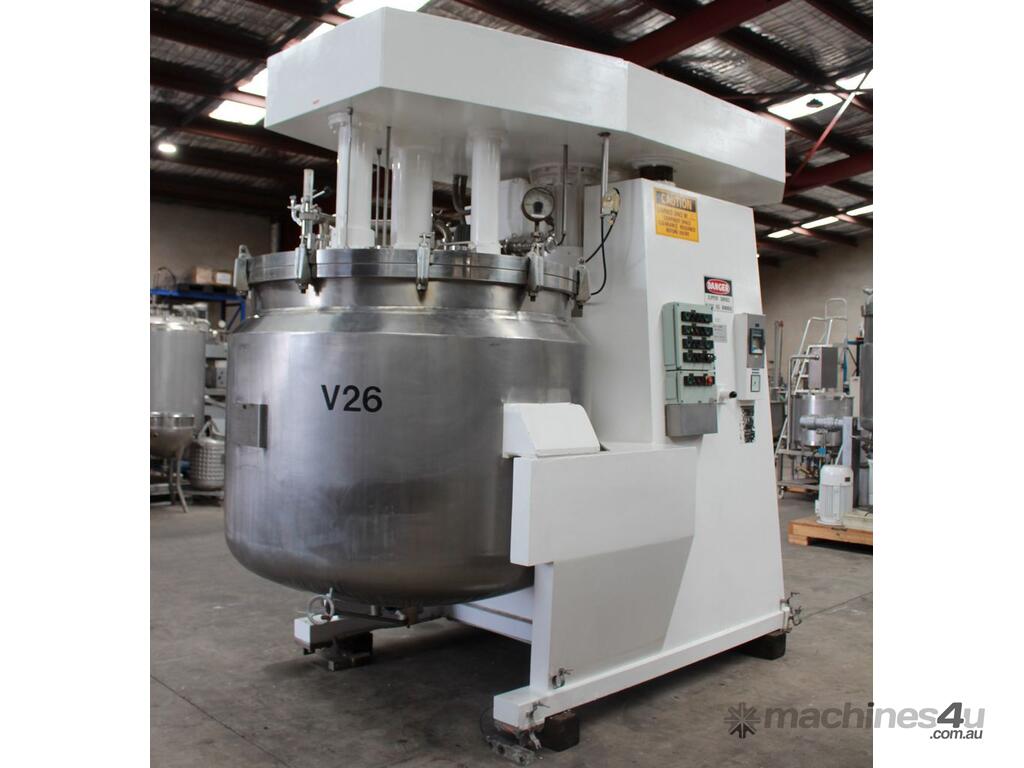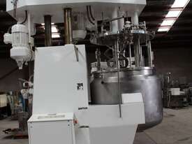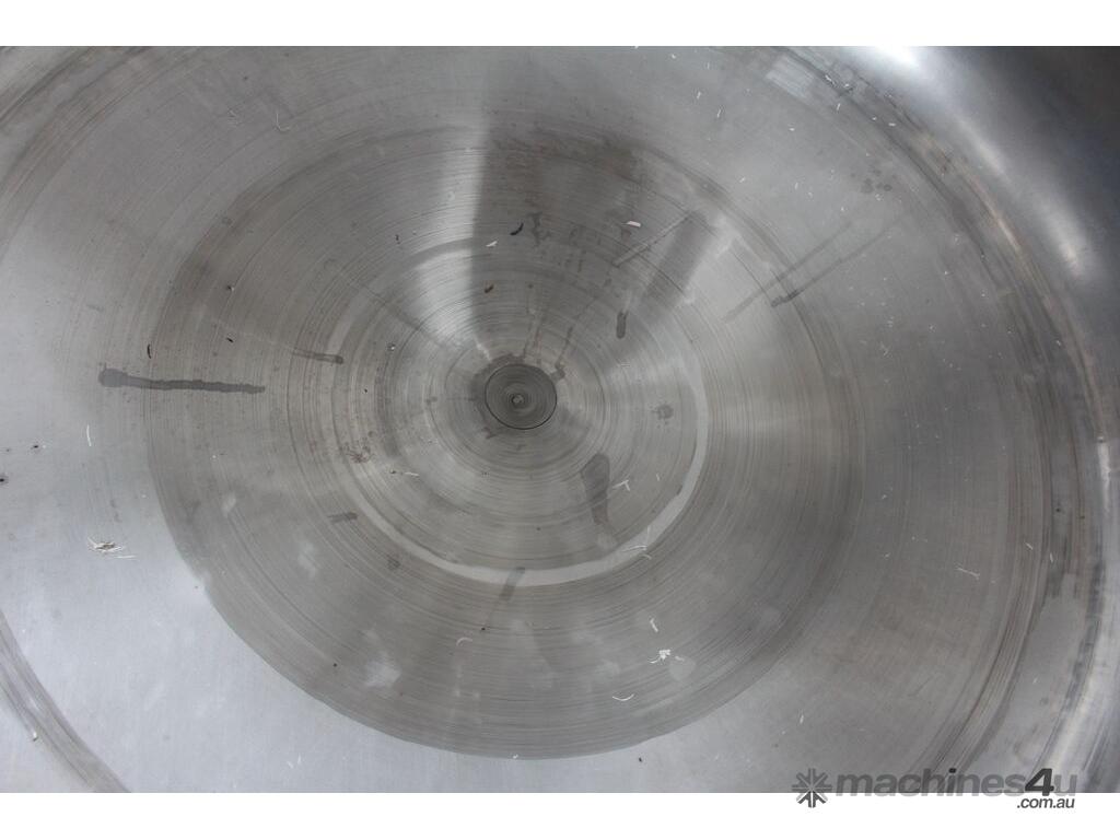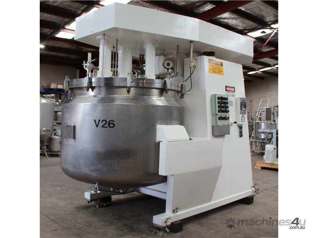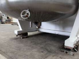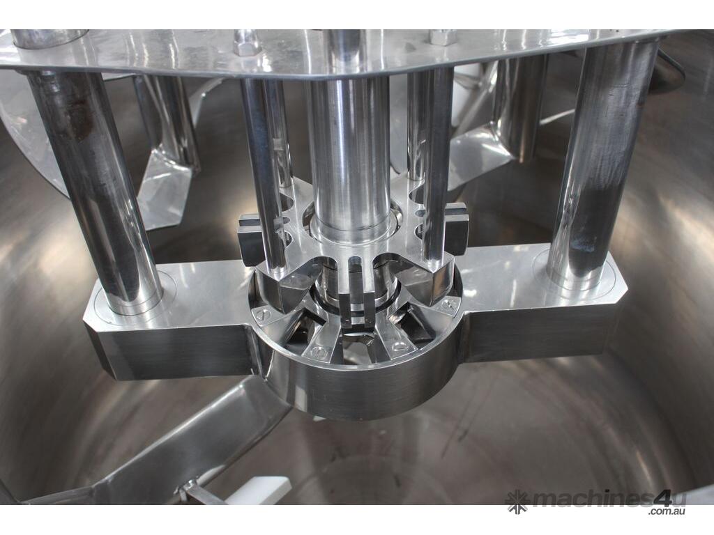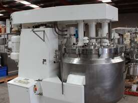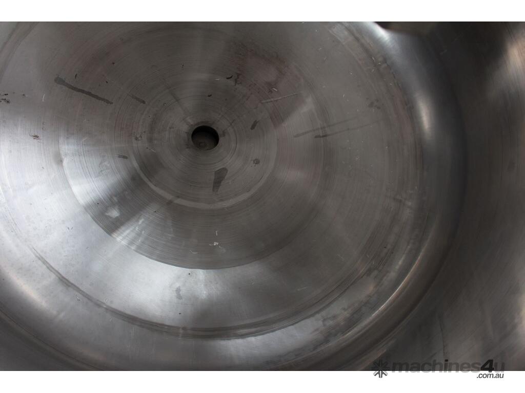 Vacuum Jacketed Processing Vessel, "Brogli" model MH-2000C, year: 1981, capacity: 2,380L, 200degC with internal vacuum and 1.4 bar pressure, 3 bar steam jacket, Stainless steel wetted parts, electrically lift out lid with clamps complete with sight view window, multiple inlets, scrape surface mixer, 2 x ribbon style rotary flow breakers, high shear batch emulsifier mixer with adjustable stator, dished bottom to a centre outlet with valve