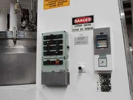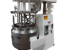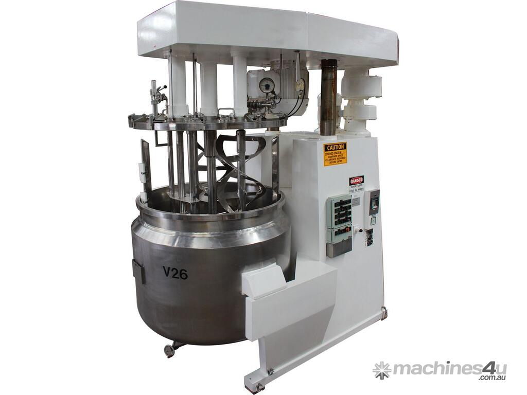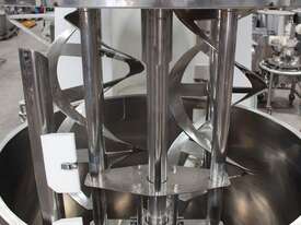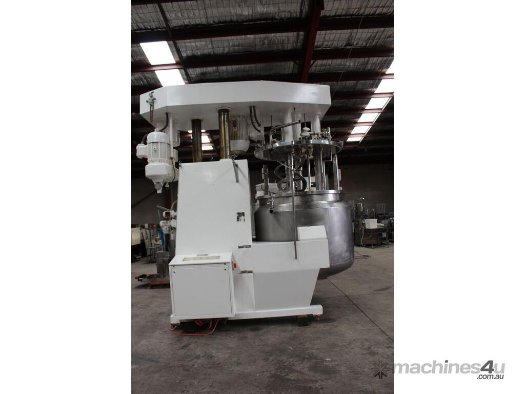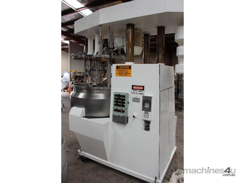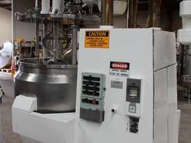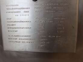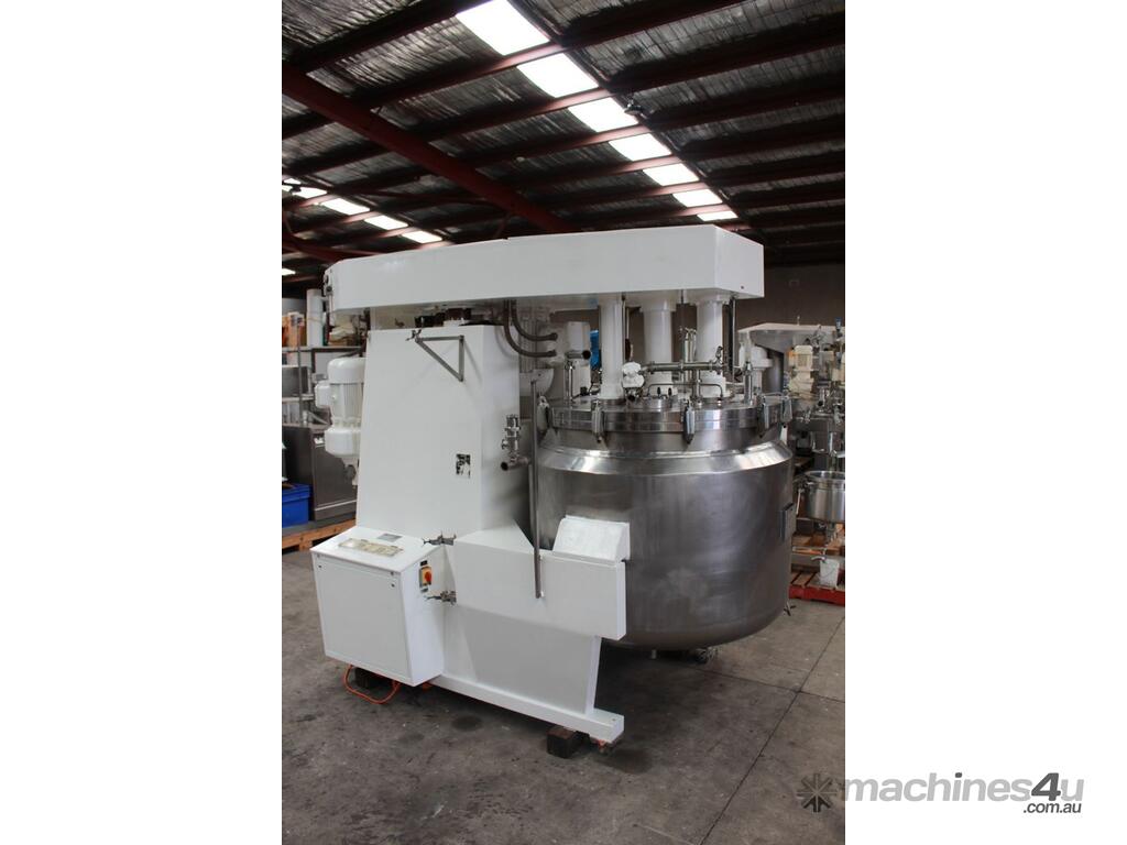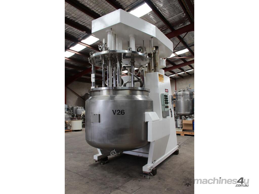 Vacuum Jacketed Processing Vessel, "Brogli" model MH-2000C, year: 1981, capacity: 2,380L, 200degC with internal vacuum and 1.4 bar pressure, 3 bar steam jacket, Stainless steel wetted parts, electrically lift out lid with clamps complete with sight view window, multiple inlets, scrape surface mixer, 2 x ribbon style rotary flow breakers, high shear batch emulsifier mixer with adjustable stator, dished bottom to a centre outlet with valve