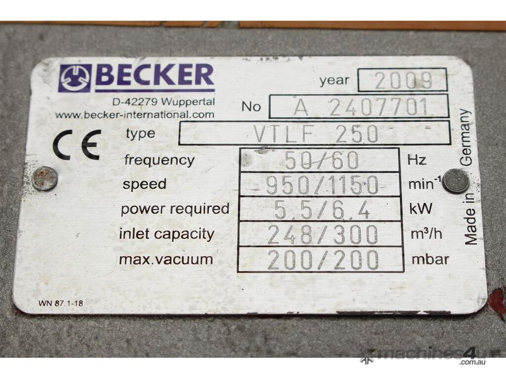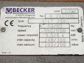 Vacuum Pump, "Becker" Model VTLF 250, capacity 248 cu m/hr, 200mbar, driven by 5three phase 5.5 kw 960rpm, mounted on a stainless steel frame, year of manufacture 2009