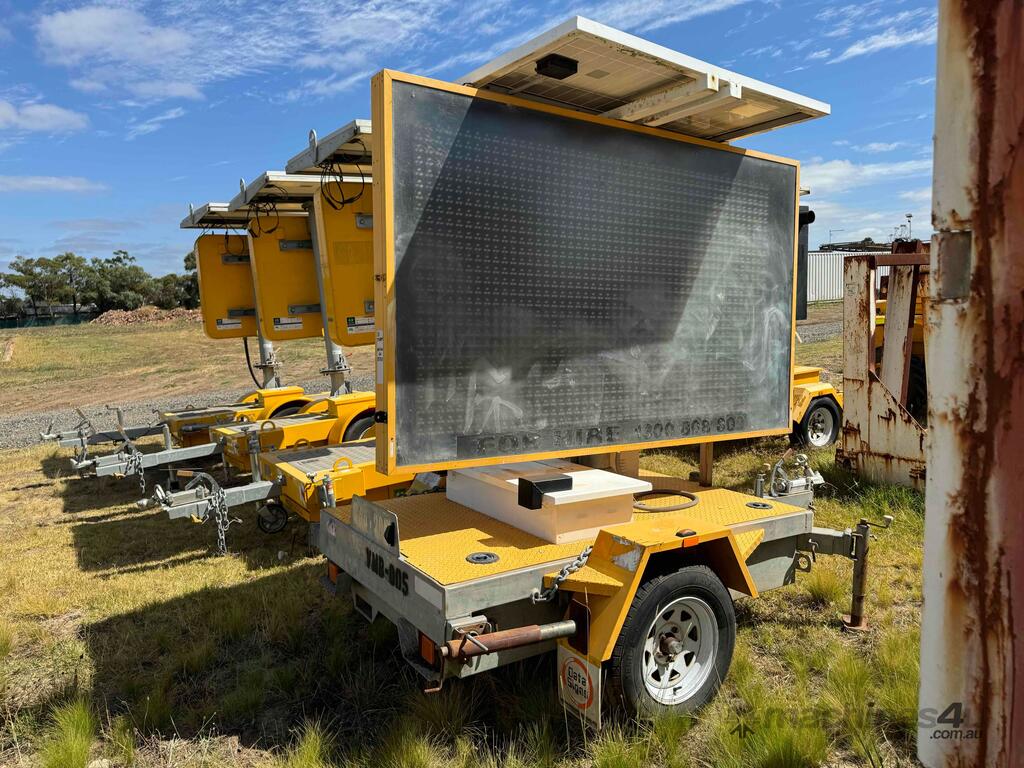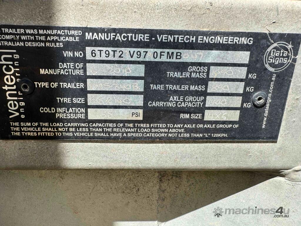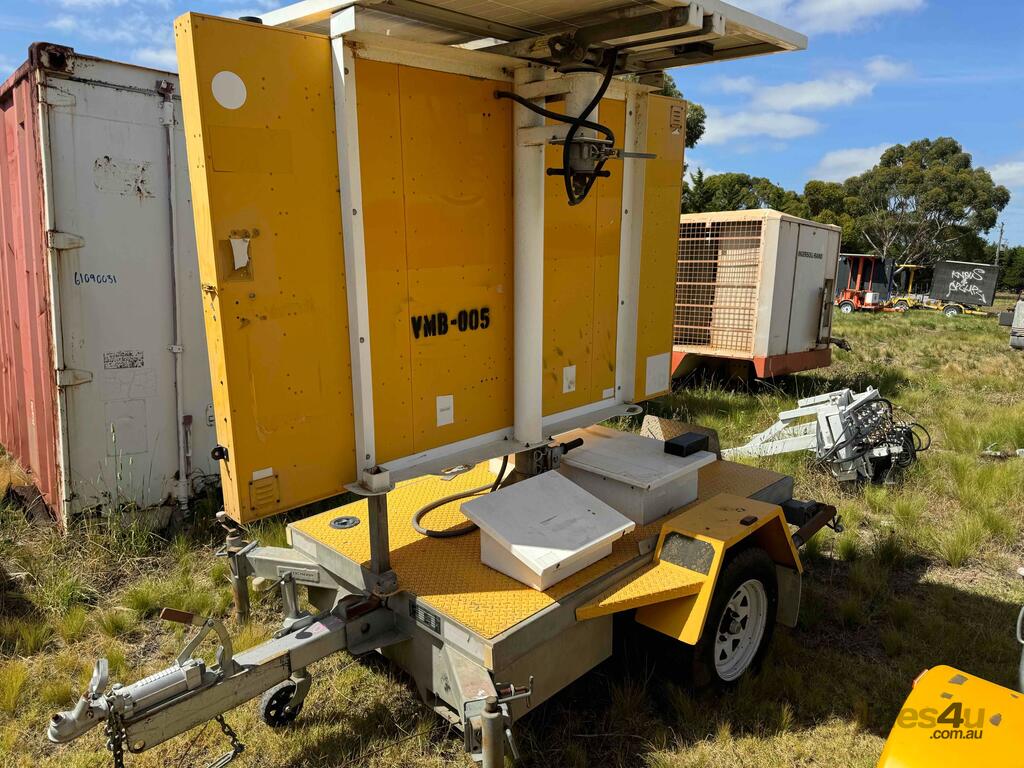 2010 Ventech VMS Board with Solar Panel. Model VMS340B. DOM 06/10. GTM 1090 kg. Tare 890 kg. Tyres 185R14 5 Stud Rims. Stabilisers. 50 mm Coupling. (VMB-005)