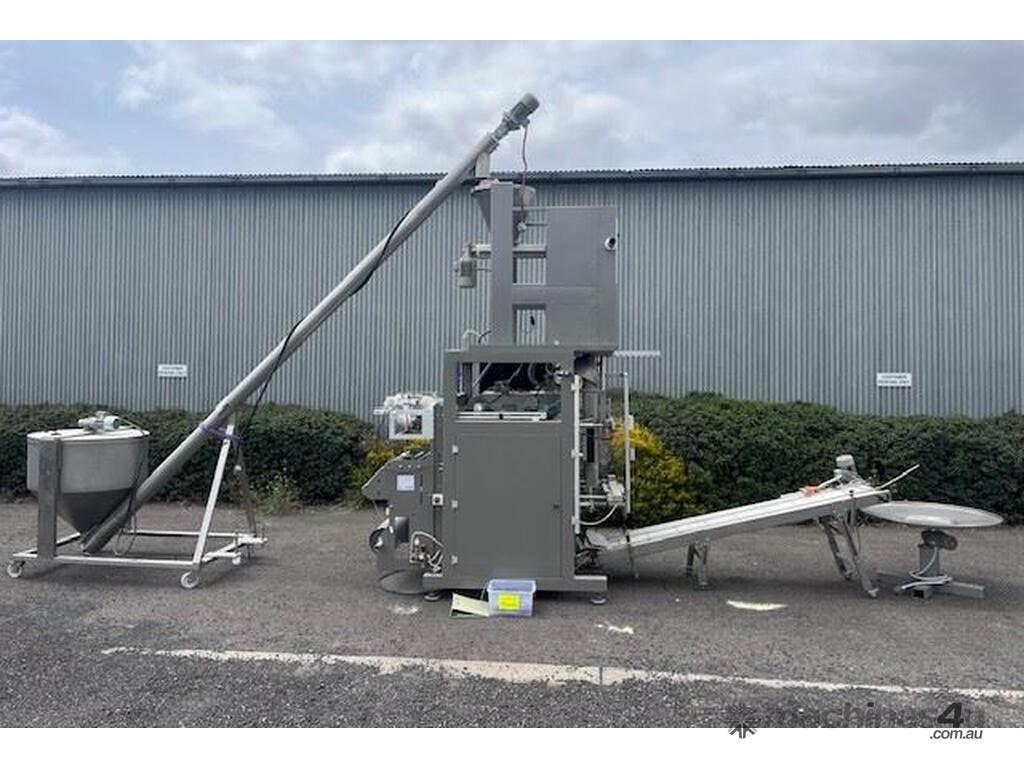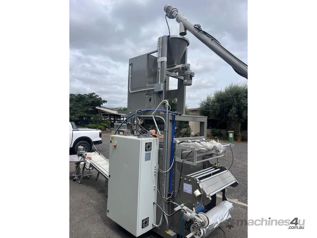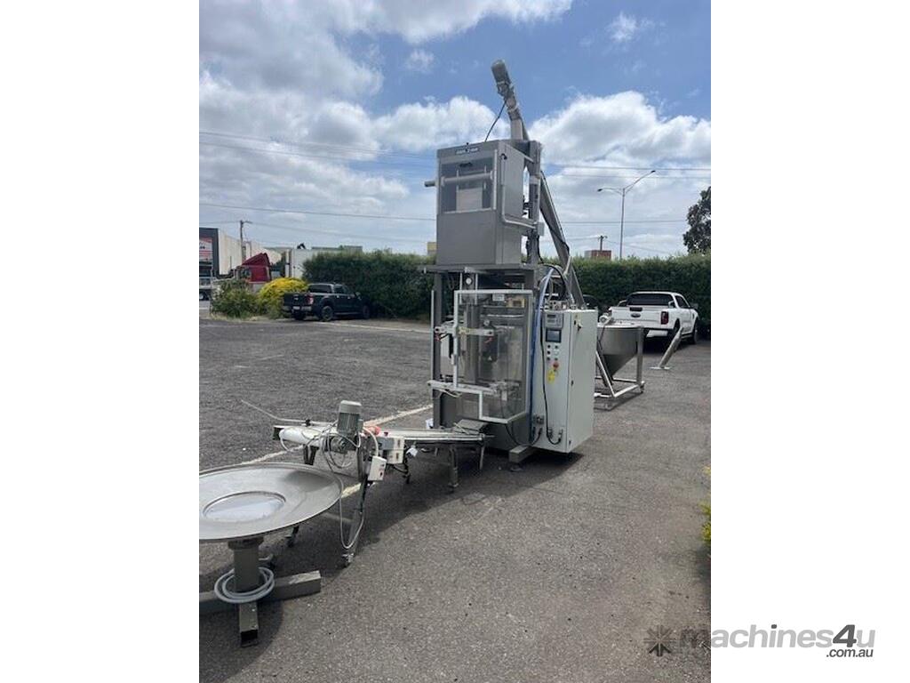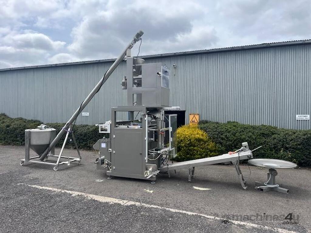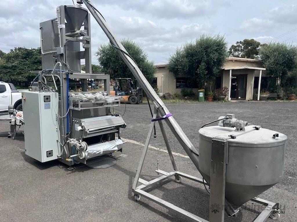 Packaging machine with linear weigh head and screw feed system, also includes infeed auger, outfeed conveyor and ss turntable.