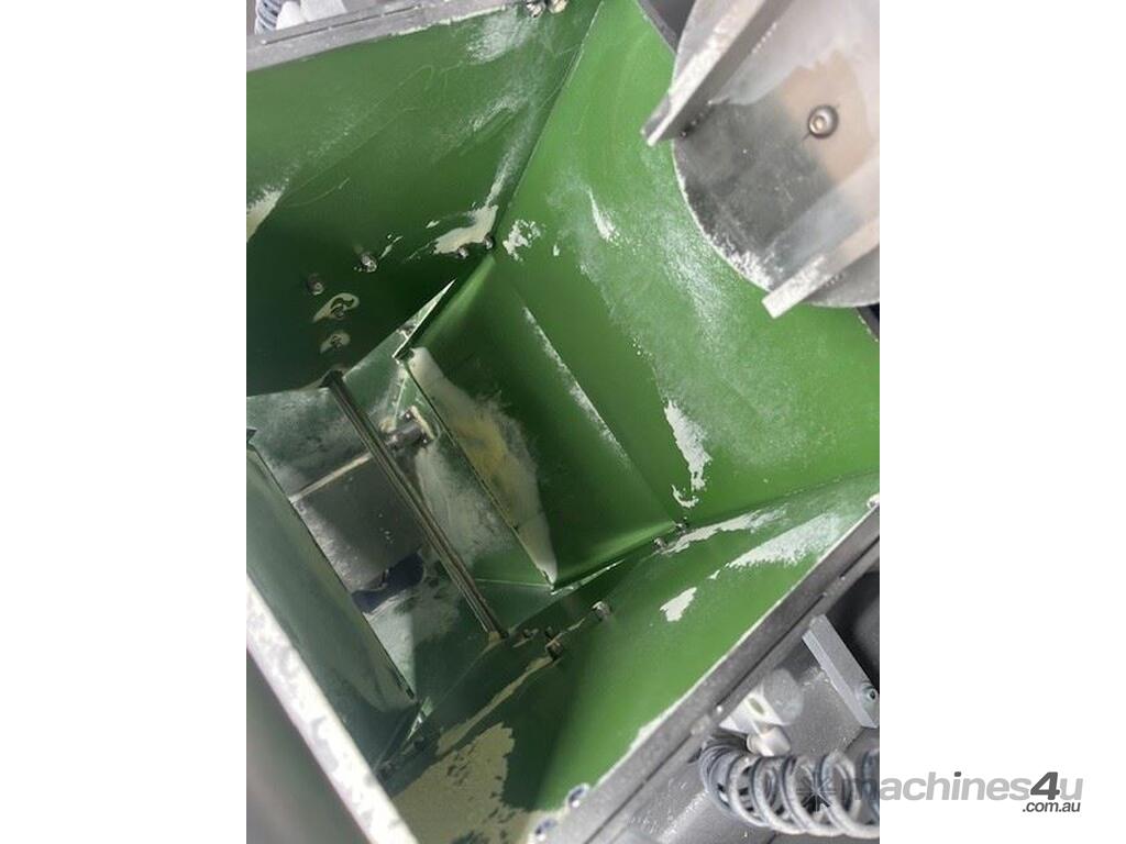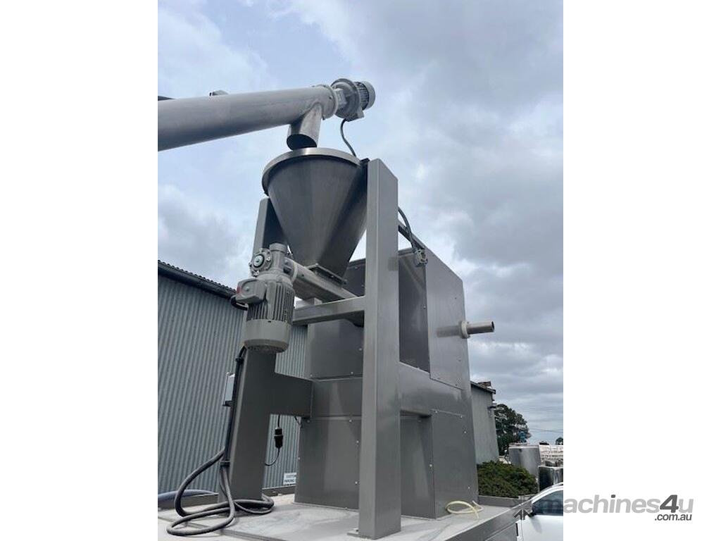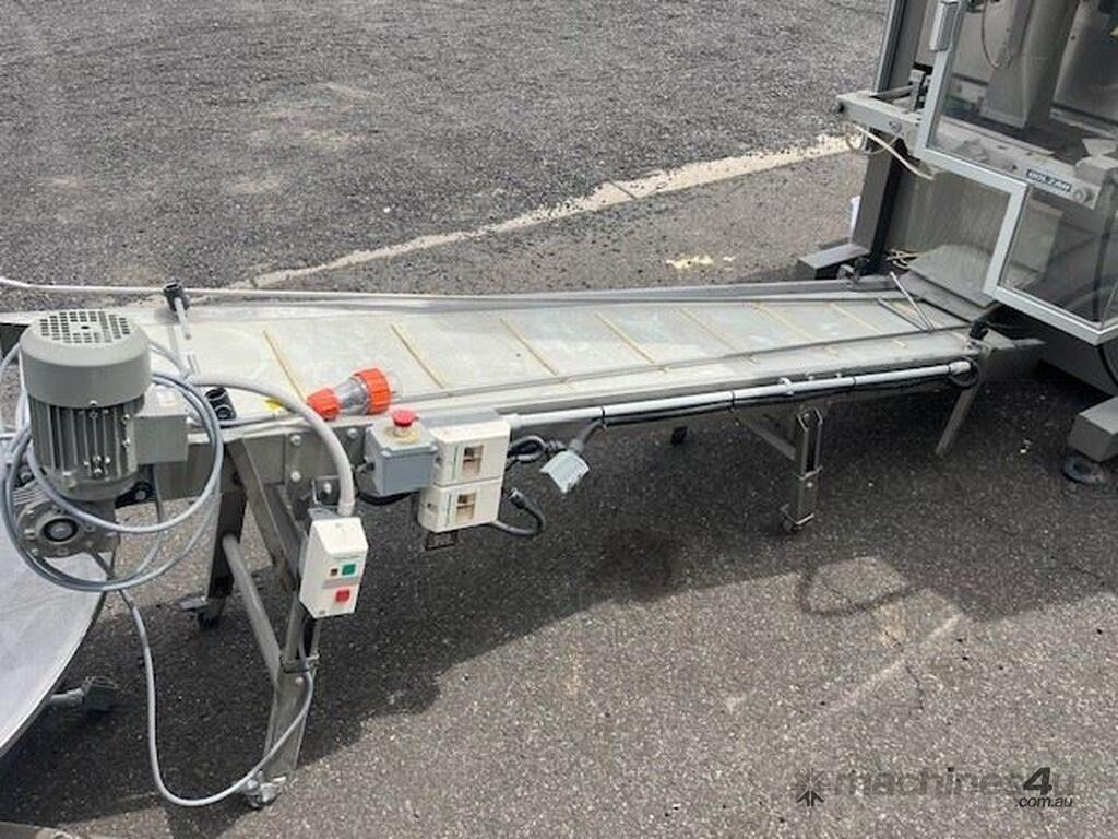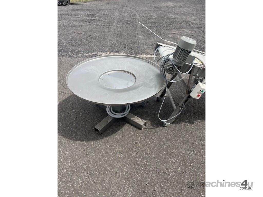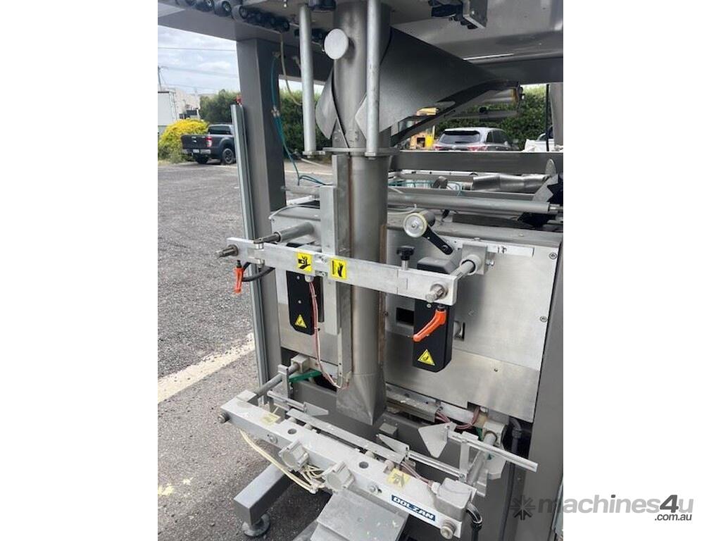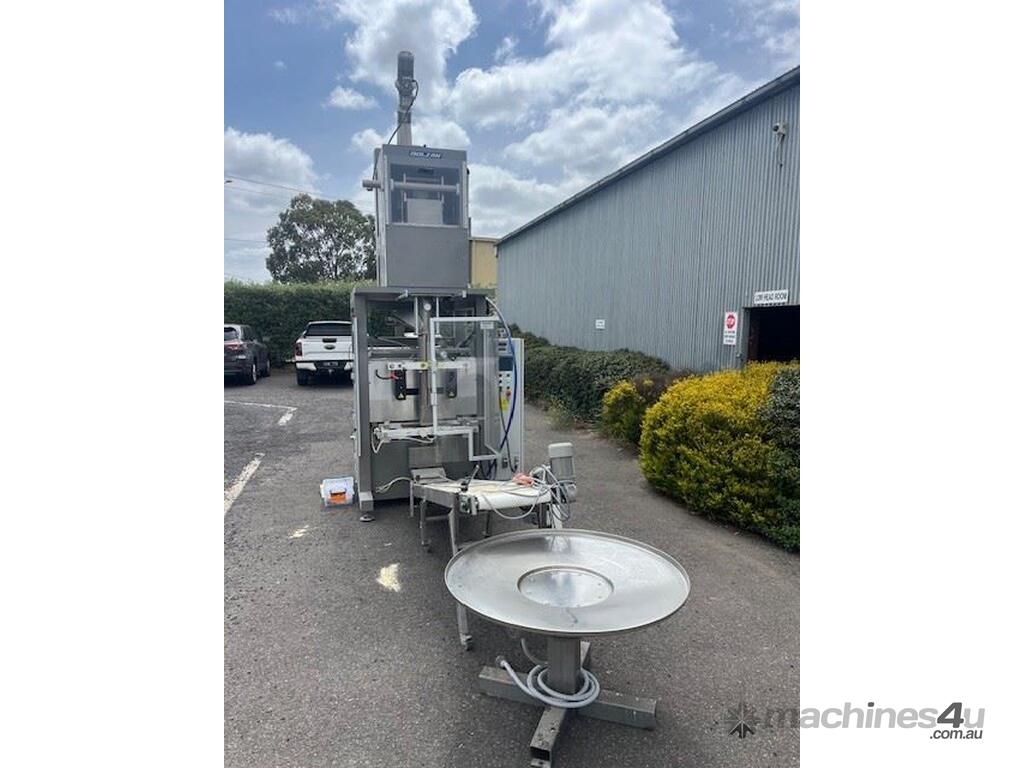 Packaging machine with linear weigh head and screw feed system, also includes infeed auger, outfeed conveyor and ss turntable.