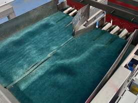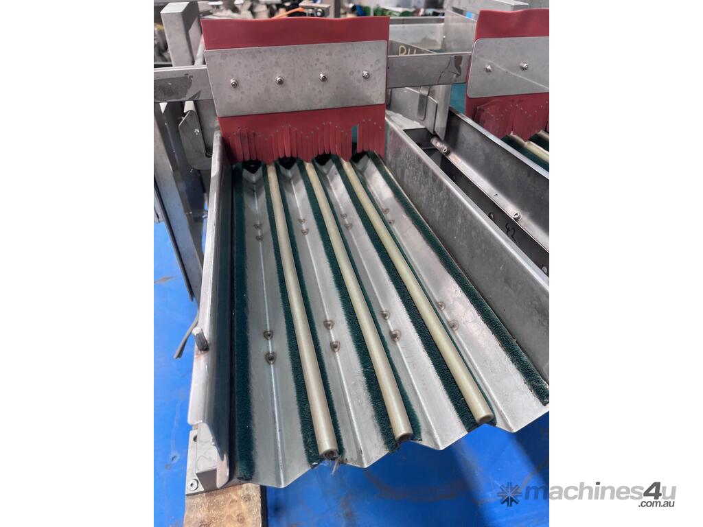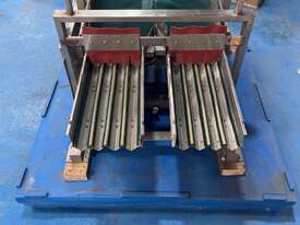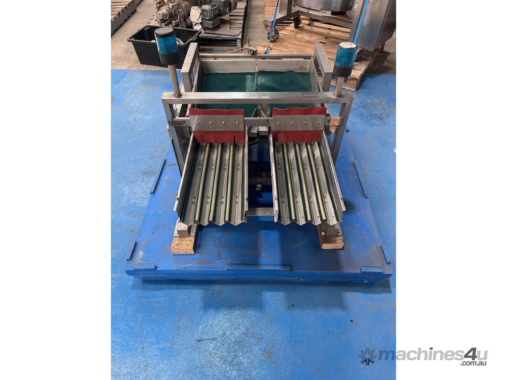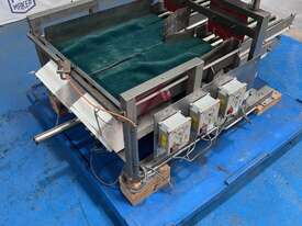 This feed system consists of 2 vibratory feeders with a single tray to collect product, which then feeds into two separate trays with four lanes on each tray.