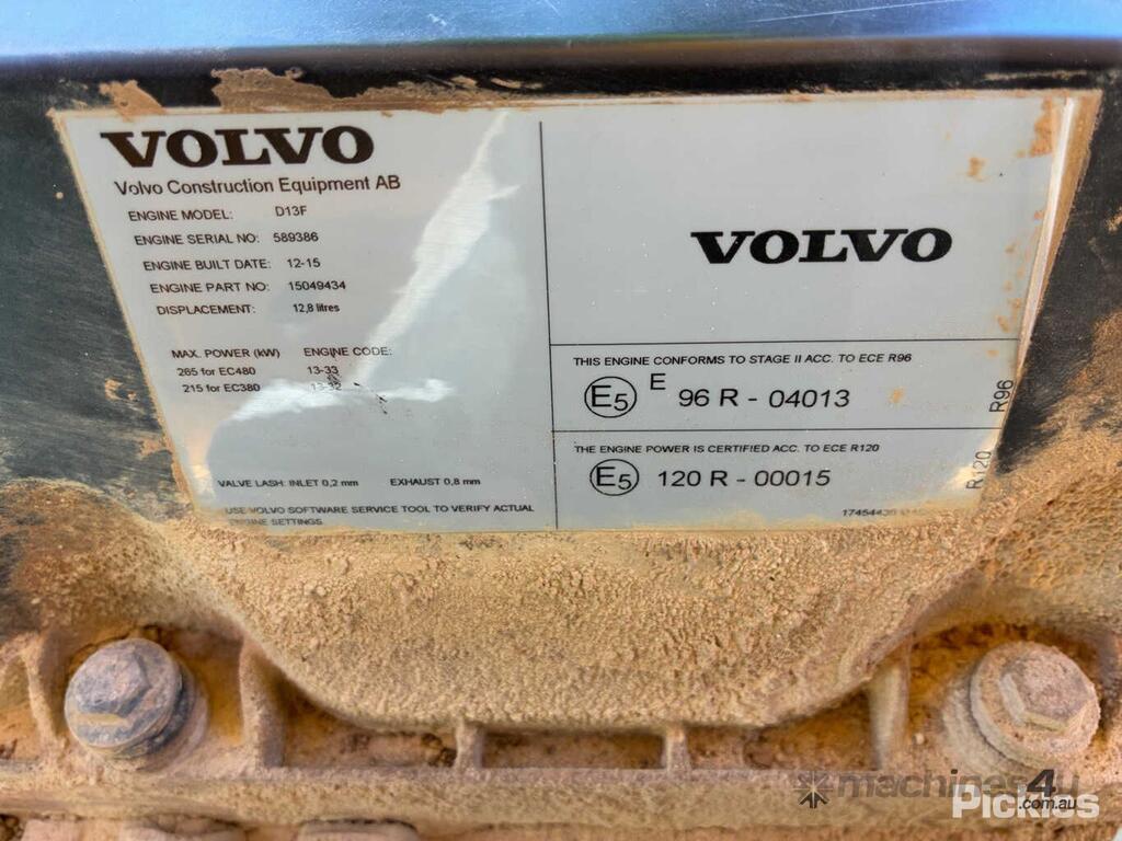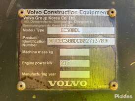 No C/P,Volvo,EC380DL,Excavator (Steel Tracked),Engine #: 589386,6 Cyl,Diesel,Odometer not visible,12951 (Hrs. Showing on Hour meter),Colour: Yellow Grey,Unregistered,Serial No: VCEC380DC00271370,ROPS No: 1466130,Sold with No Plates