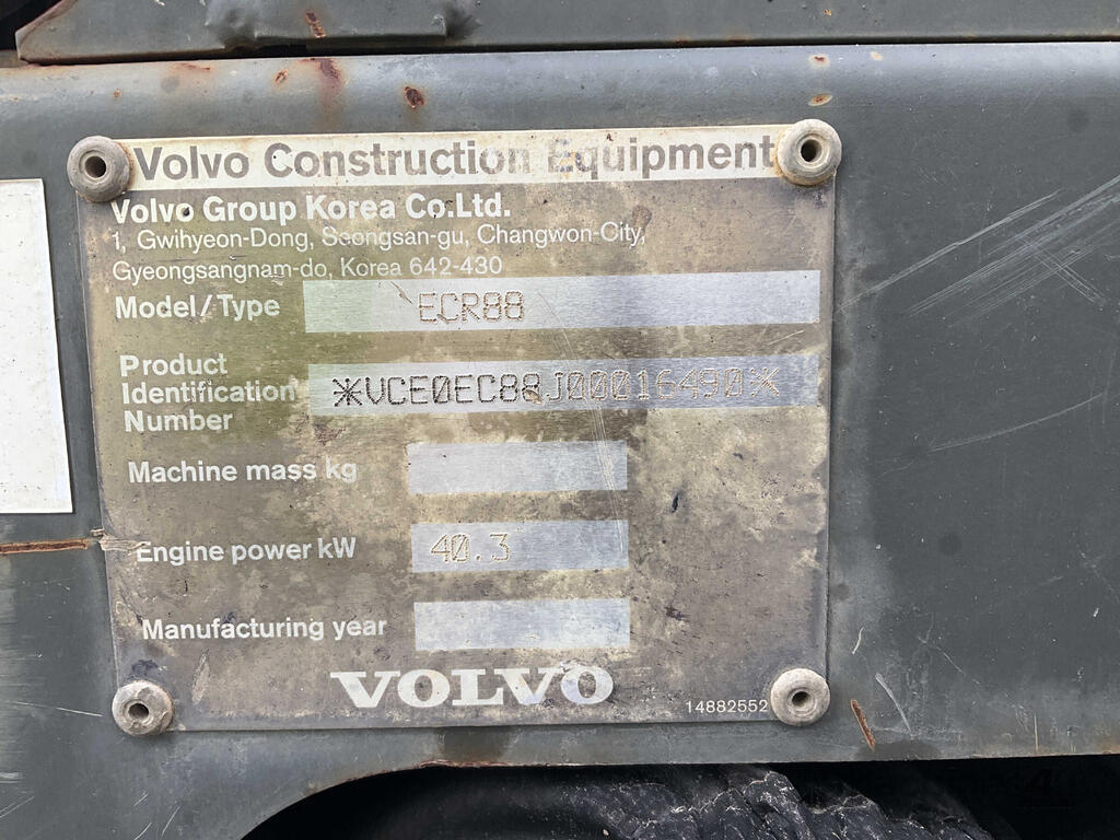No C/P,Volvo,ECR88 Plus,Excavator (Rubber Padded),Engine #: 10862,4 Cyl,Diesel,Odometer not visible,5467 (Hrs. Showing on Hour meter),Colour: Yellow,Unregistered,VIN: VCE0EC88J00016490,Serial No: NULL,Sold with No Plates,Key No: 422E