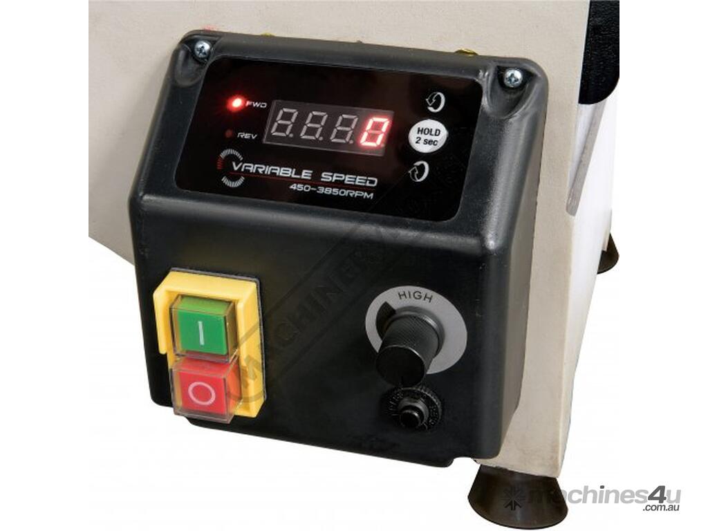 Fitted with a 2-step Electronic Variable Speed motor with a low range for slower speeds from 450rpm up to 1800rpm. The high speed range from 900rpm up to 3850rpm ideal for miniature turning work. The electronic variable speed allows for quick dial-in of the correct speed required for your job.