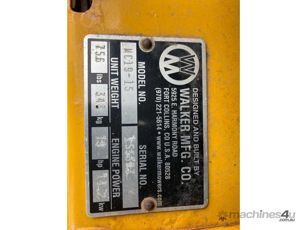 No C/P,Walker,MC19-15,Zero Turn Ride On Mower,1 Cyl,Petrol,Odometer not visible,791 (Hrs. Showing on Hour meter),Colour: Yellow,Unregistered,Serial No: 155303,Sold with No Plates