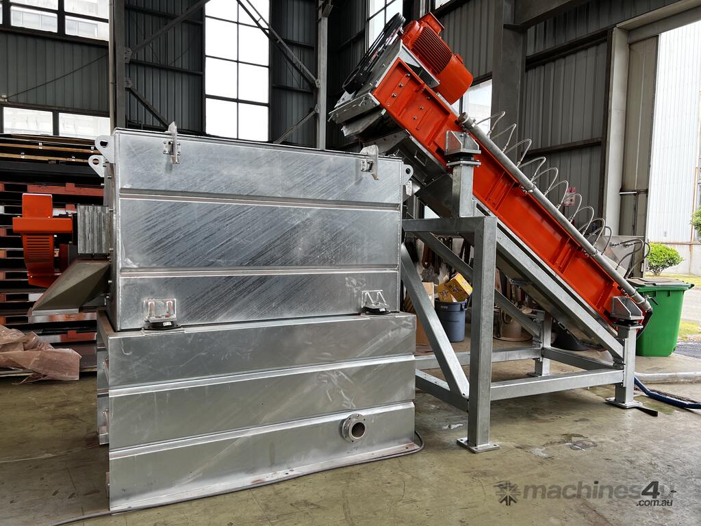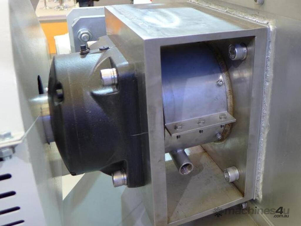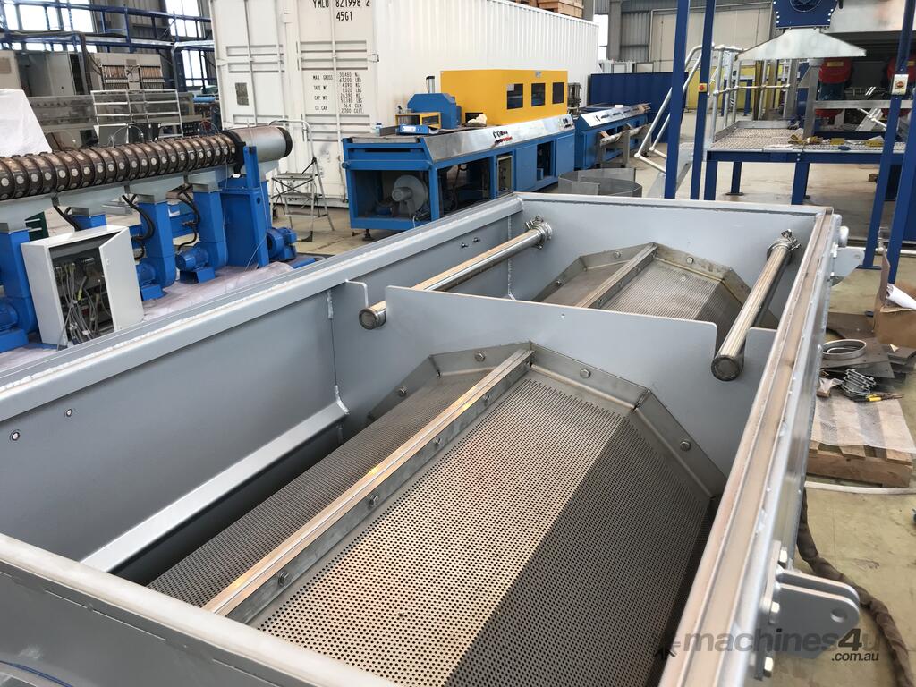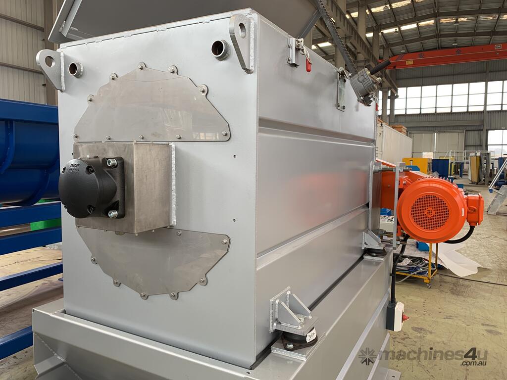 The Mechanical Dryer is used in a washing system with pre-shredded or in a wet granulator system for surface drying of plastics such as film, PET bottle flake, etc. The input material enters the upper end of the dryer by a transport screw, cyclone separator or other material handling equipment. The inner rotor of the mechanical dryer transports the material flake from the in-feed side to the discharge side. The specific angular degree of the rotor flights determines the total dwell travel time of the material inside the dryer and the final residual moisture content of the discharged material. During the material transport inside the dryer the material is forced against the rotor and screen surface to achieve a product contact surface cleaning. The water and residual water is forced out through the screen cage which surrounds the mechanical dryer rotor.