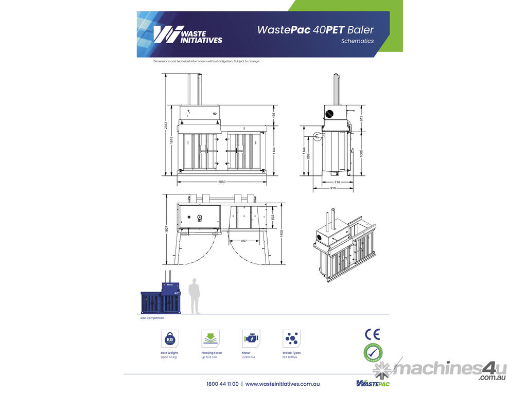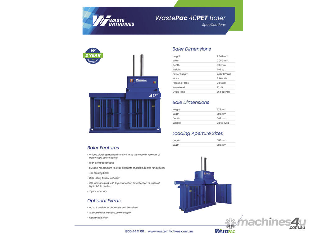 WastePac PET 40 Baler is a compact baler, suitable for lineside placement in production areas, yet can still handle medium to large volumes of plastic bottles with ease. The unique perforating head eliminates the need to remove bottle caps prior to baling and the machine can even be used for product destruction of filled bottles.