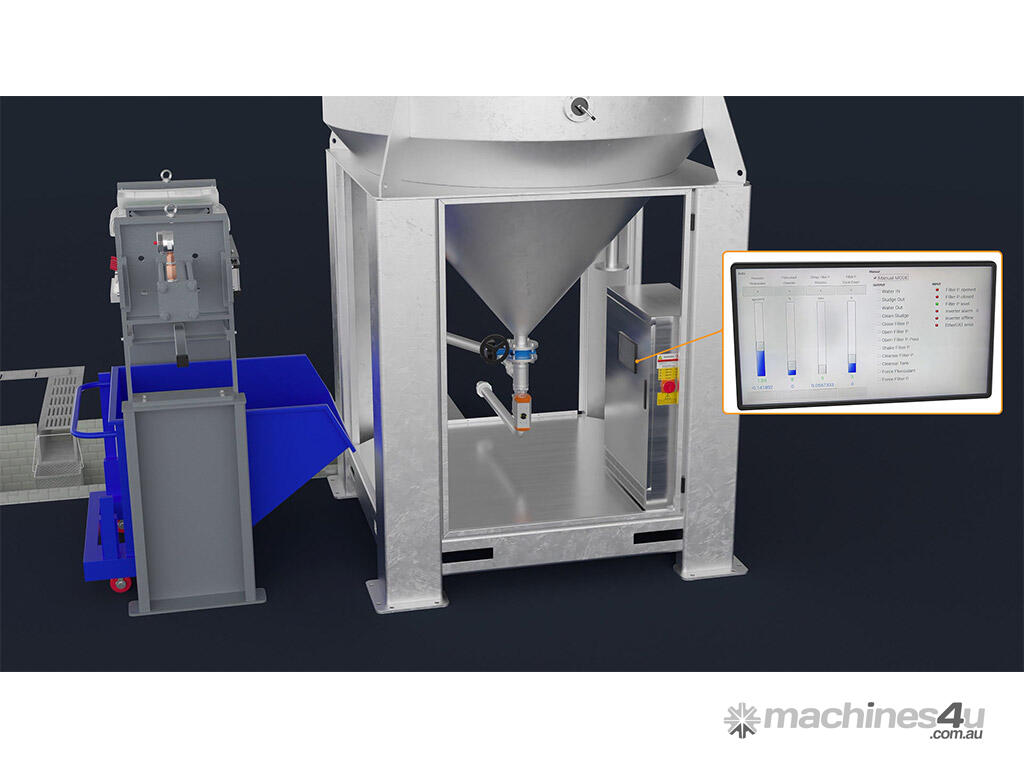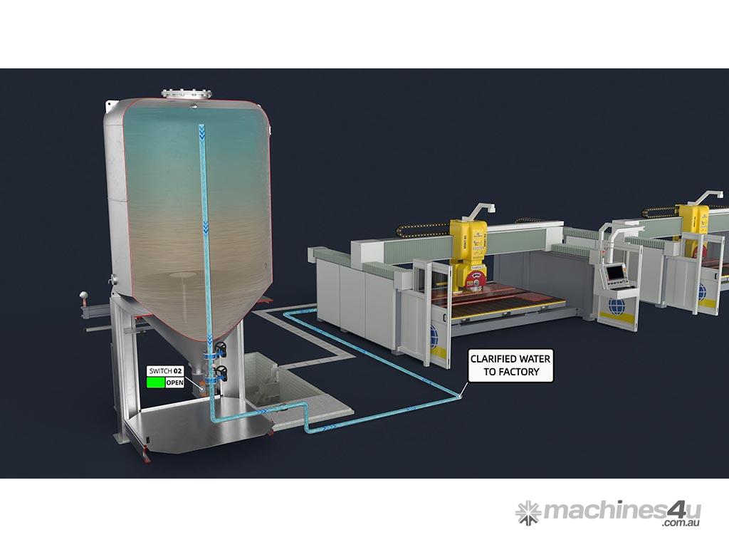 This is a Water Recycling system for stone and glass fabrication shops. The system occupies 2.2 x 2.2 meters of floor space (Not Including Filter Press) and is capable of processing 400+ liters per minute.