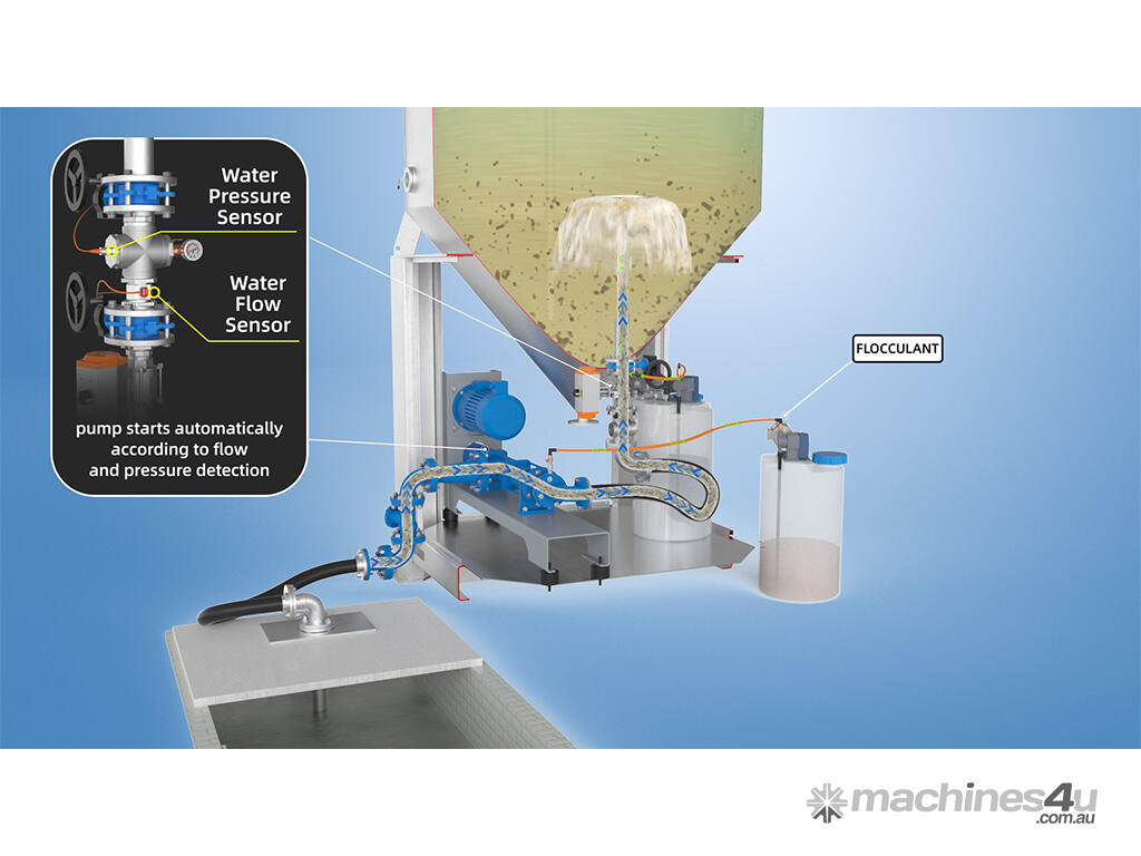 This water treatment plant is equipped with a Smart Control unit that manages all the unit functions, including dynamically dosing the Flocculant according to the amount of water being processed through the system. The entire system is pressurised solely by a single wastewater suction pump, which is operated by an inverter that dynamically controls and maintain a constant water pressure throughout the system.