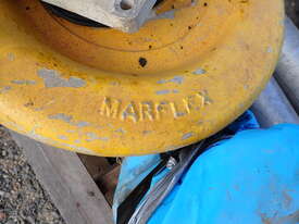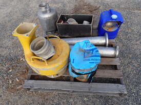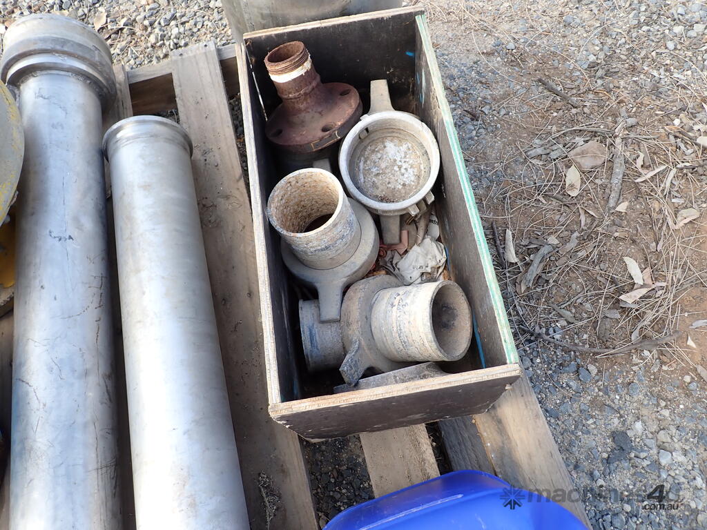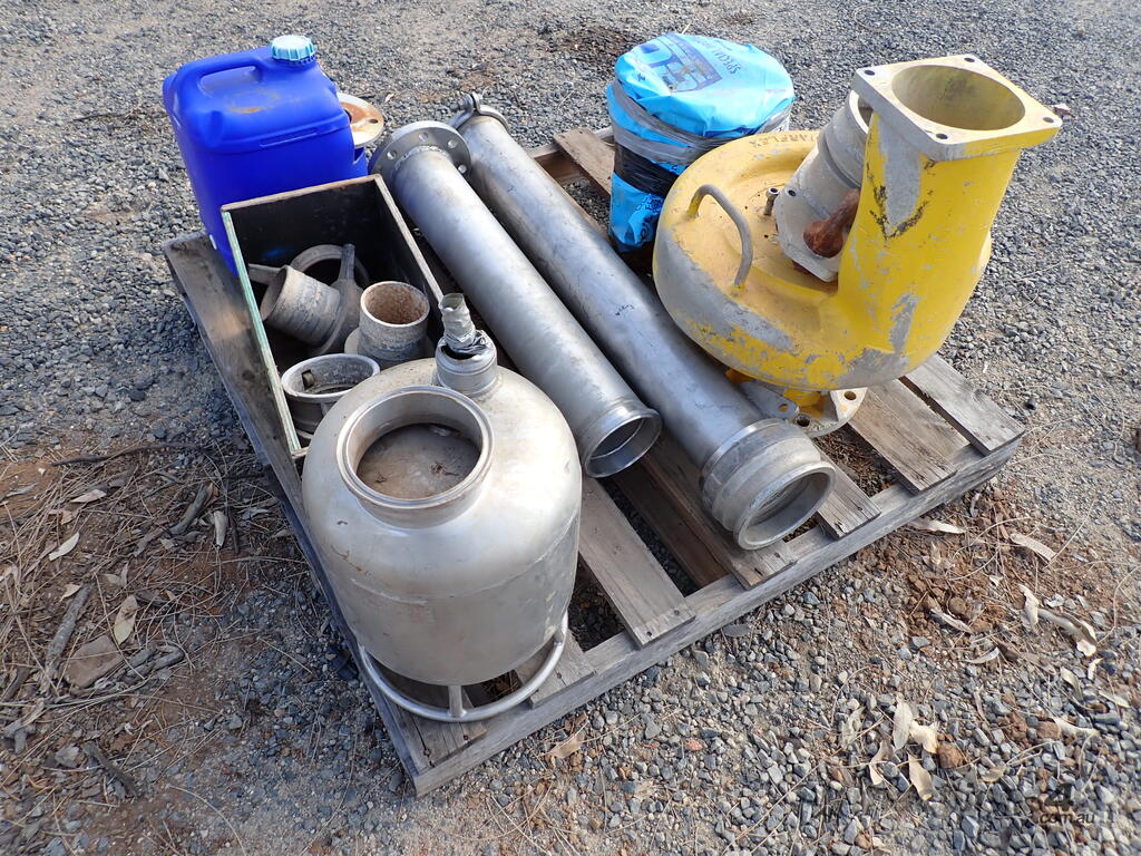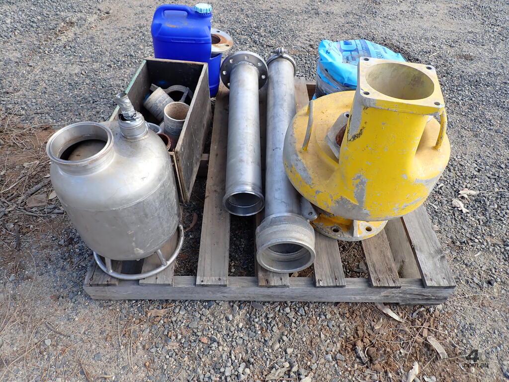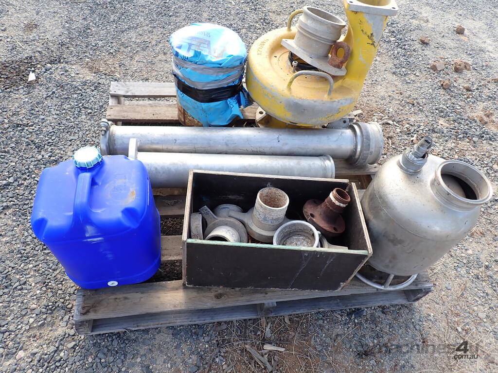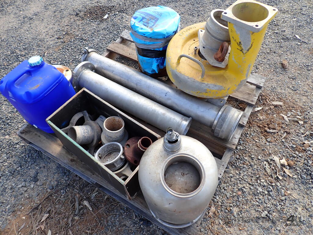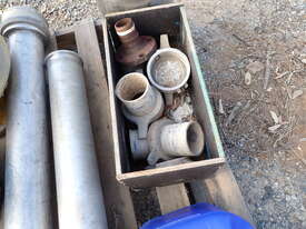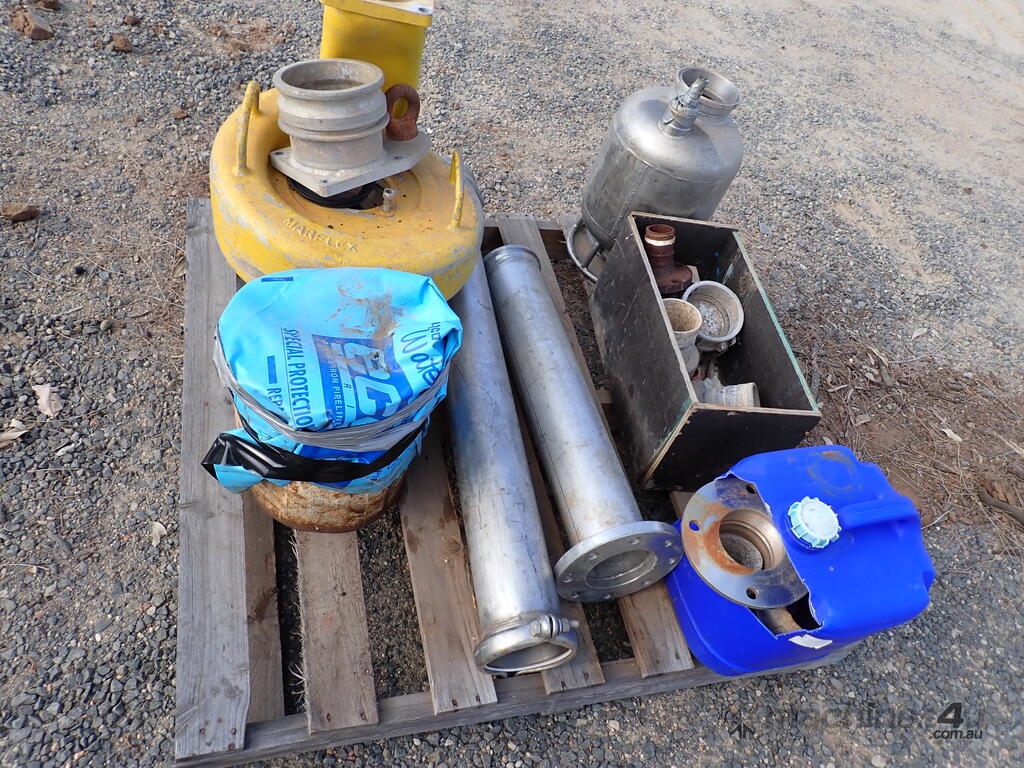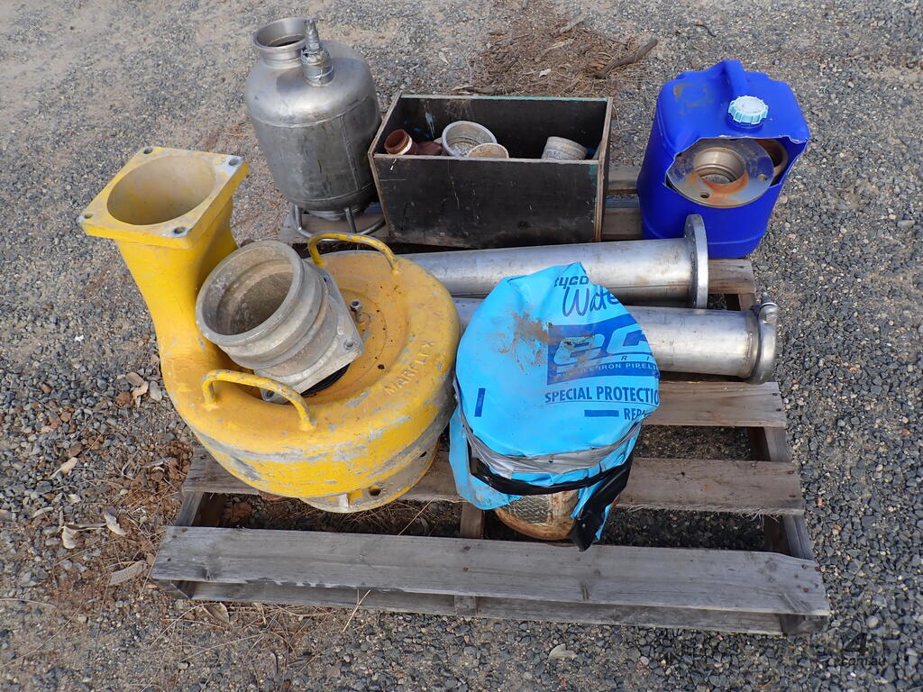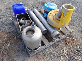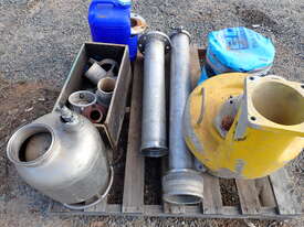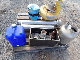 Pallet of water pumps and fittings and parts, including a Marflex 6 inch pump with alloy housing and stainless steel impellor with hydraulic drive motor (pump and motor are in pieces)plus a Marflex submersible 4 inch pump in stainless steel, plus various fittings and parts.