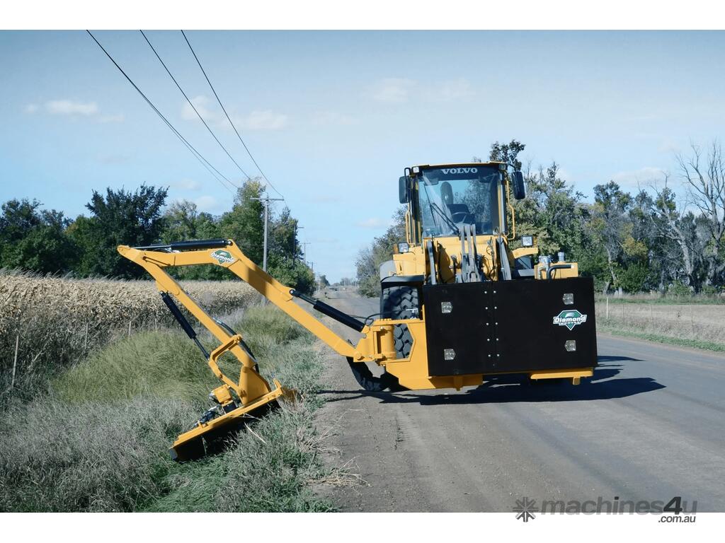 Diamond Mowers Wheeled Loader Boom Mower attachments, like all their products, are tough, reliable units are designed for clearing grasses, brush and trees from along fence lines, over fences and roadside guard railing, clearing undergrowth and cutting back overhanging branches. They are also perfect for terraces, drains, ditches, waterways and other hard to access areas. Engineered for Wheeled Loaders over 11 tonnes, the booms come in two styles: self-contained powered units and loader powered unit. These units hook up to the Wheeled Loader the same as you would hook up a bucket. Diamond Mowers uses premium cast steel pumps and motors in a fully self-contained hydraulic system, which prevents any cross contamination between the mower and the tractor. All Diamond Mowers boom mowers come standard with an easy to install 4-function proportional joystick.