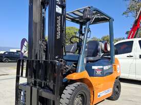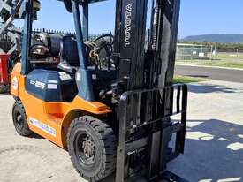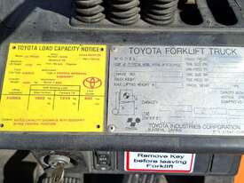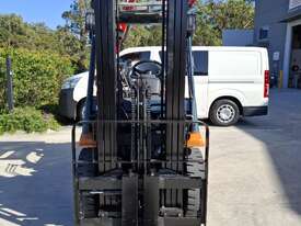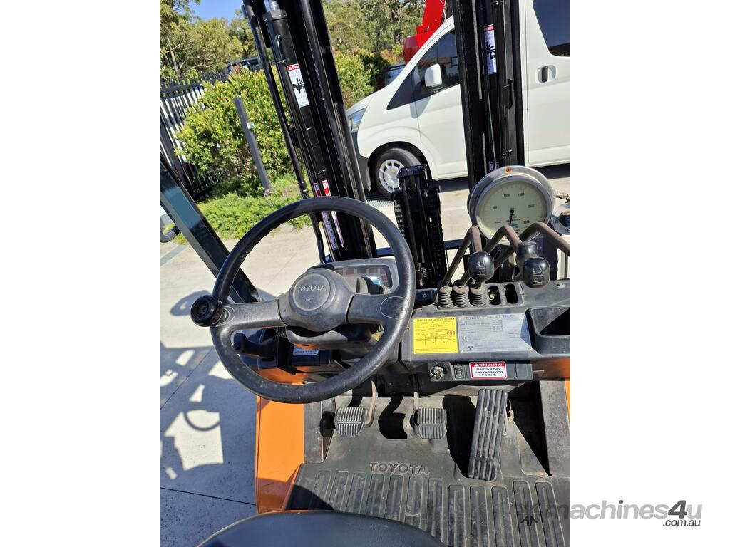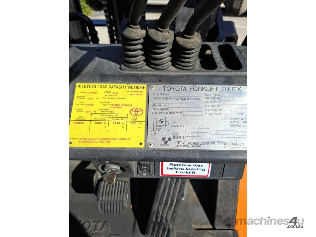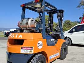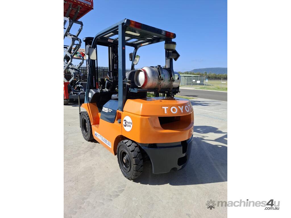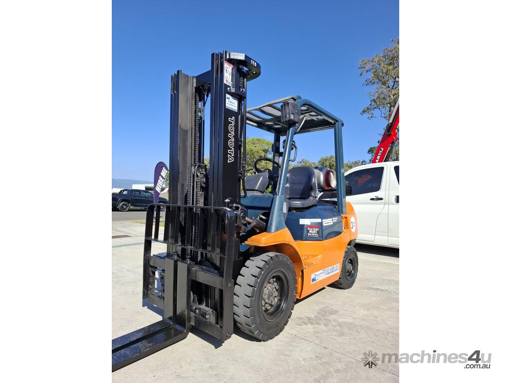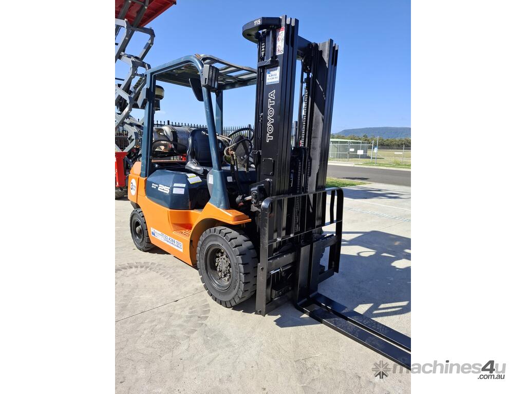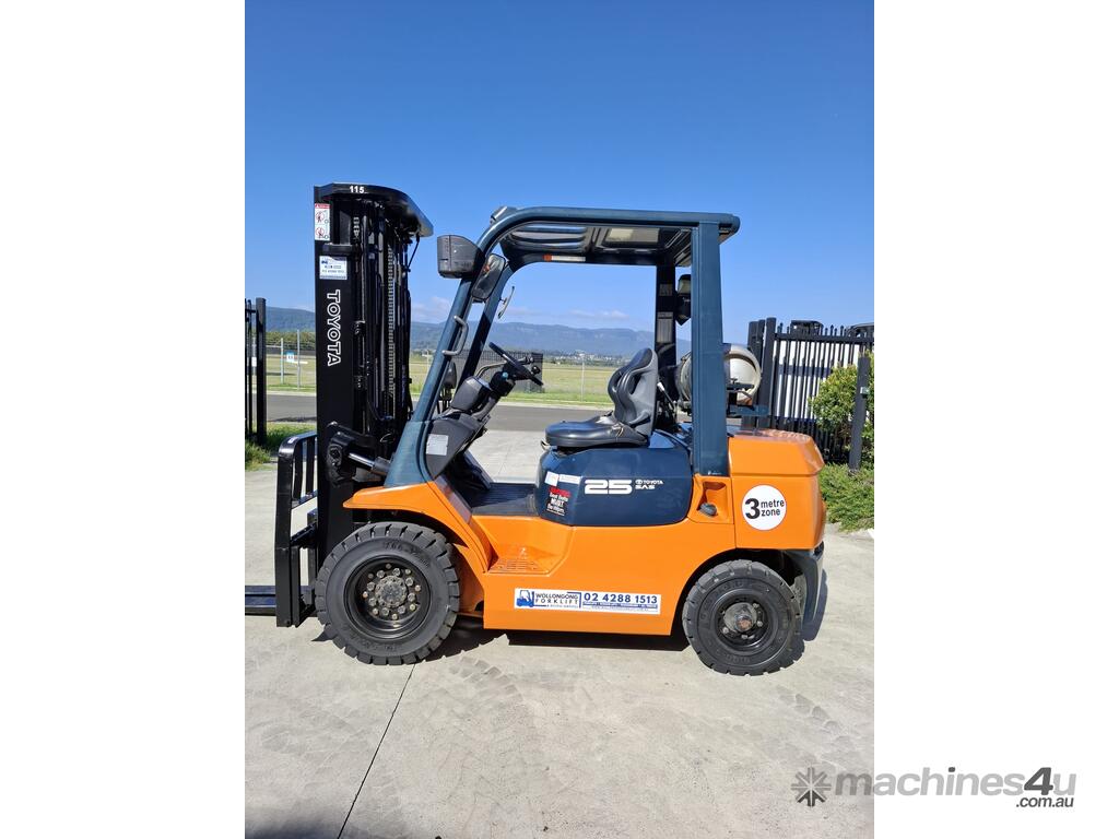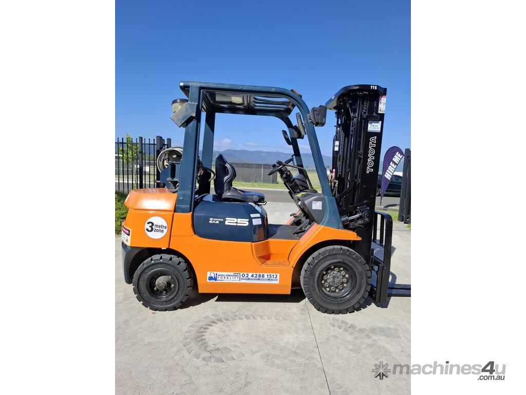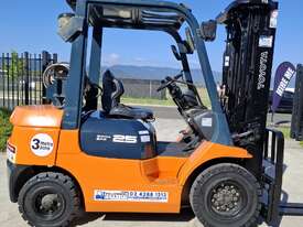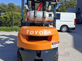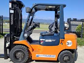 2002 Toyota 7FG25, 2.5 Tonne LPG with a 3-stage container mast and 4.7m lift. Fitted with side shift and new solid tyres. This machine has low hours