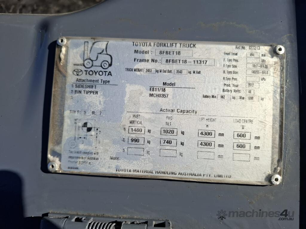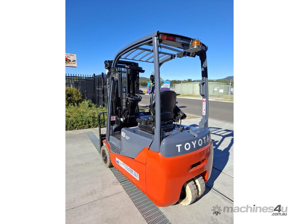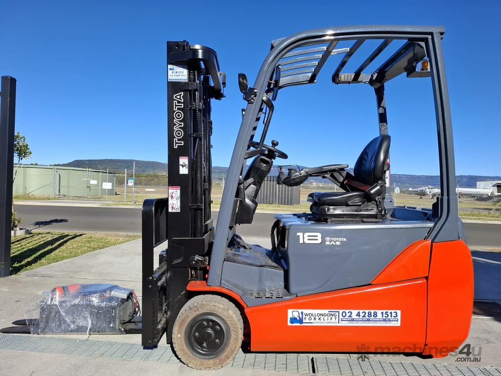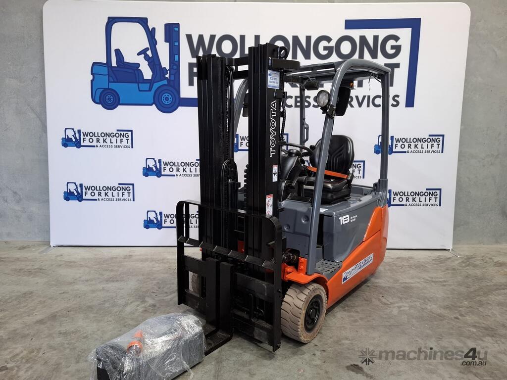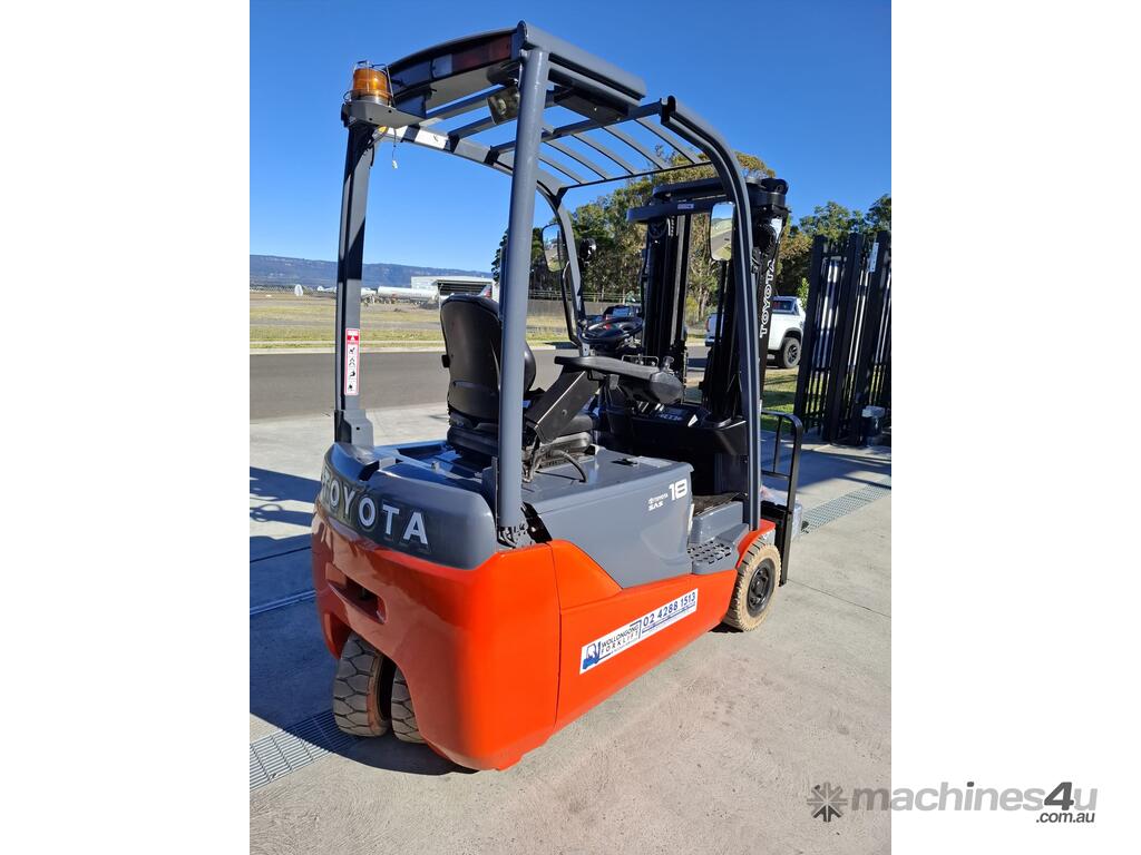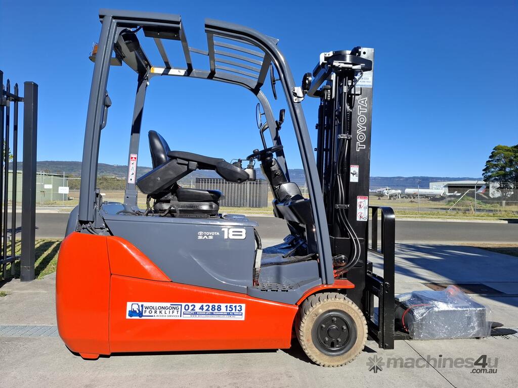 2012 Toyota 8FBET18, 1.8 Tonne Electric with a 3-stage container mast with lifting capacity of 4.3m. This 3-Wheel forklift is fitted with fingertips controls, side shift and solid non-marking tyres.