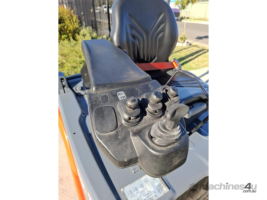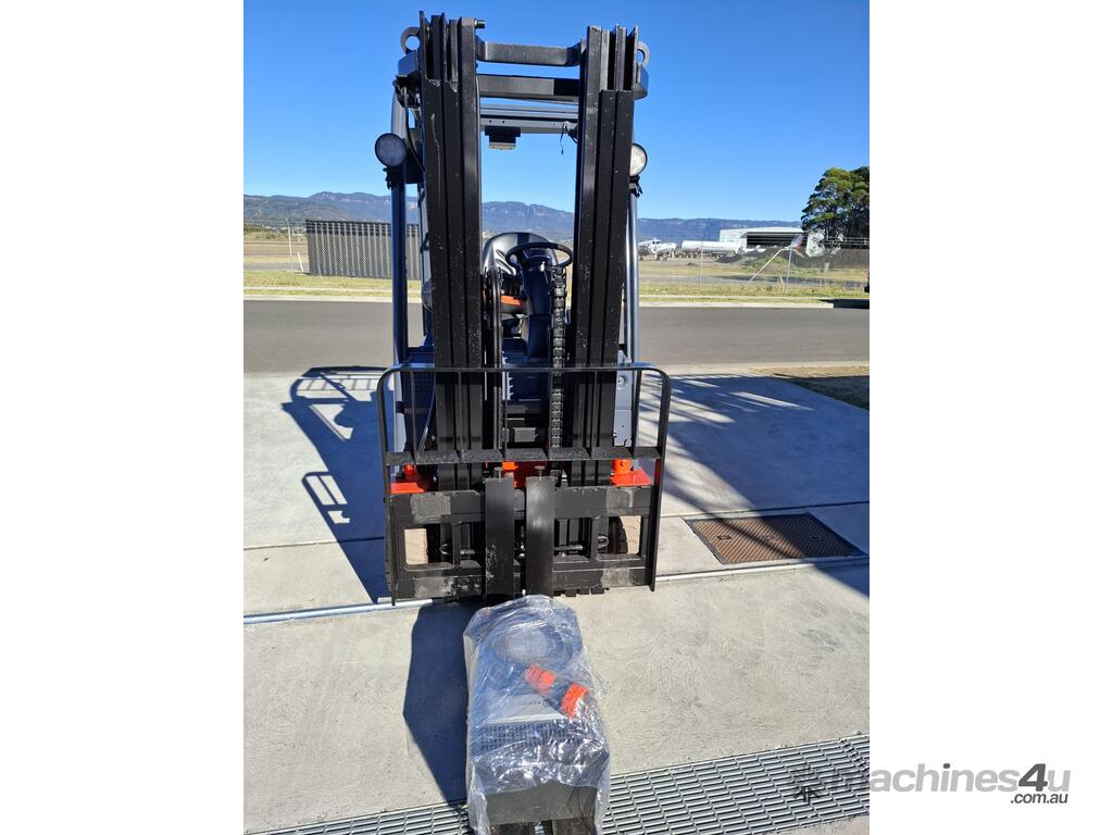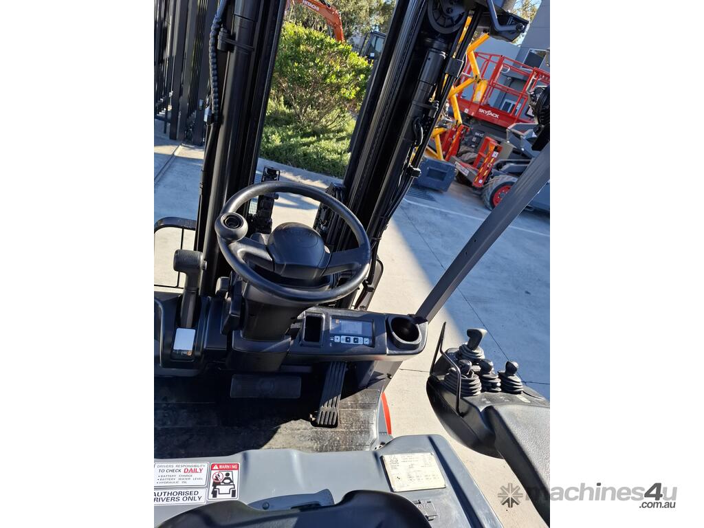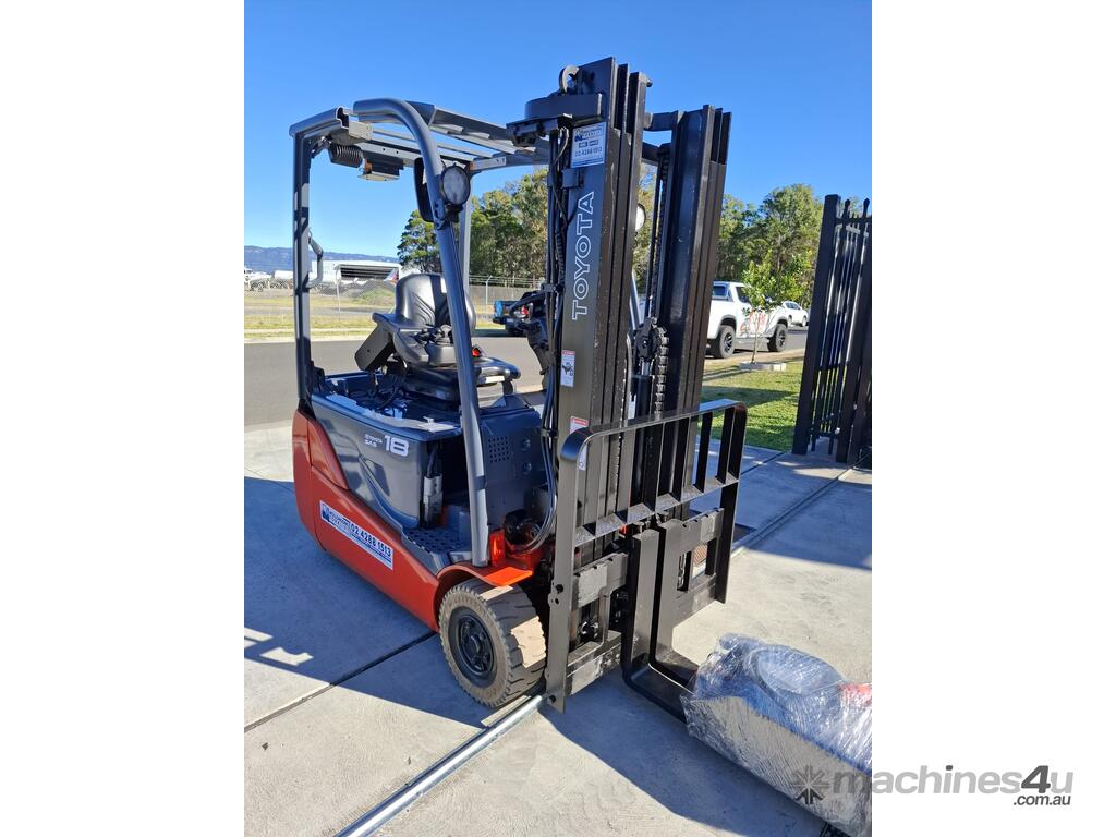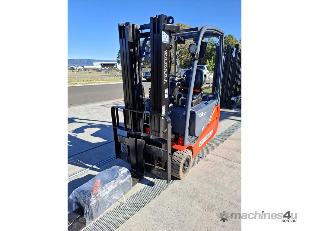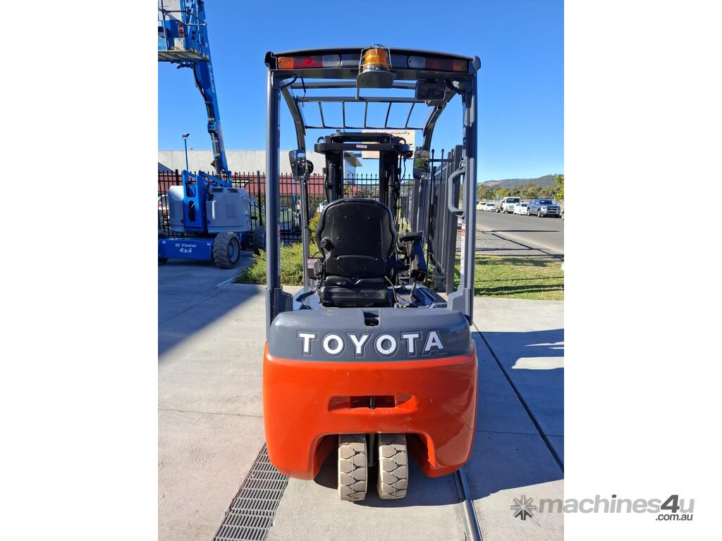 2012 Toyota 8FBET18, 1.8 Tonne Electric with a 3-stage container mast with lifting capacity of 4.3m. This 3-Wheel forklift is fitted with fingertips controls, side shift and solid non-marking tyres.