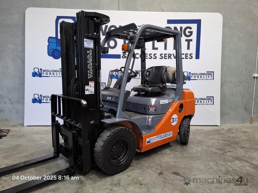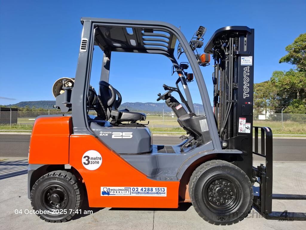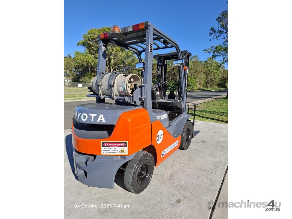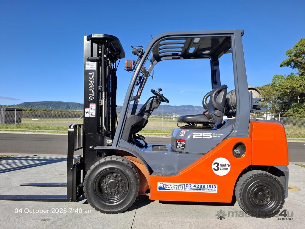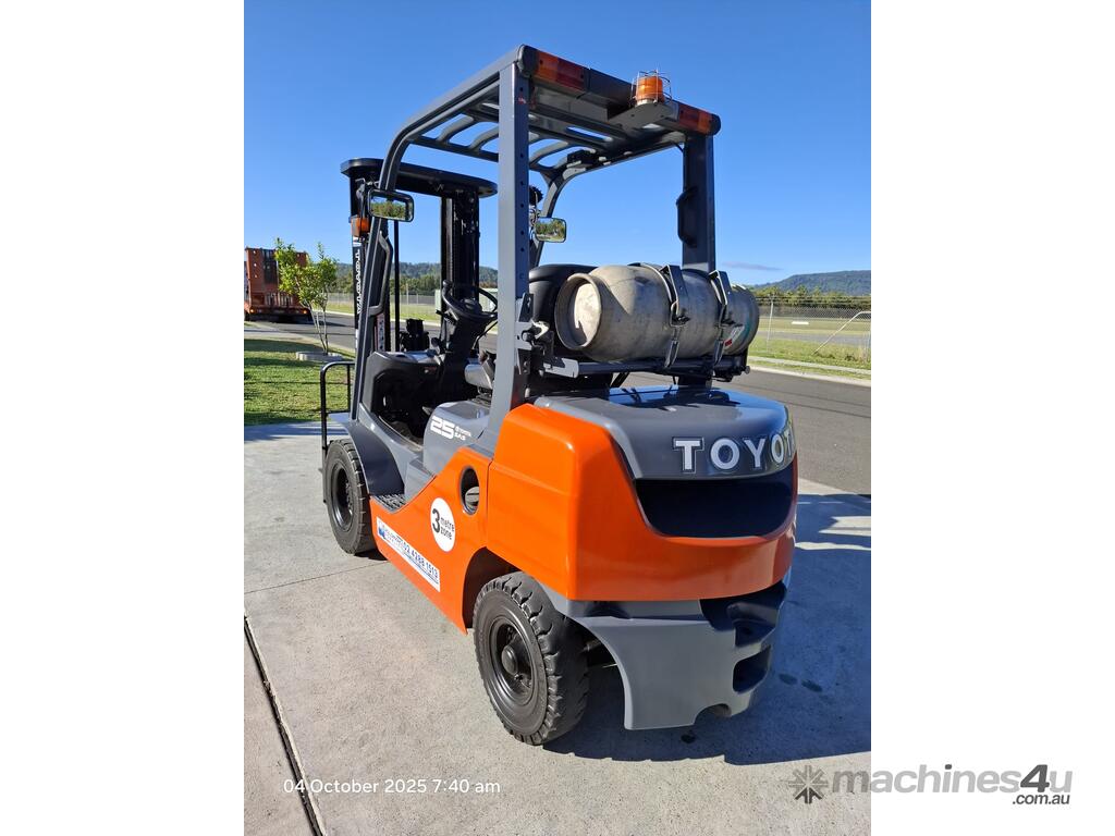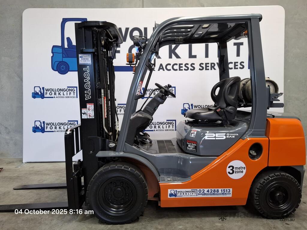 2015 Toyota 8FG25, 2.5 Tonne LPG with a 3-stage container mast with a 4.5 m lift. Fitted with side shift and good solid tyres. Blue proximity lights, also known as blue safety lights or spotlights, are installed on this forklift to warn pedestrians and other forklift operators of the forklift's presence and movement. It is freshly painted.