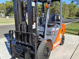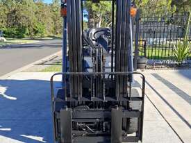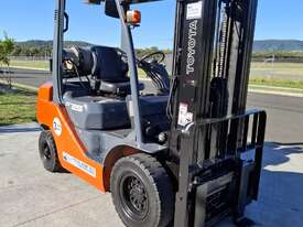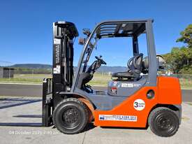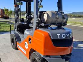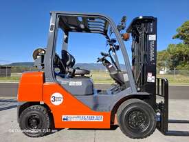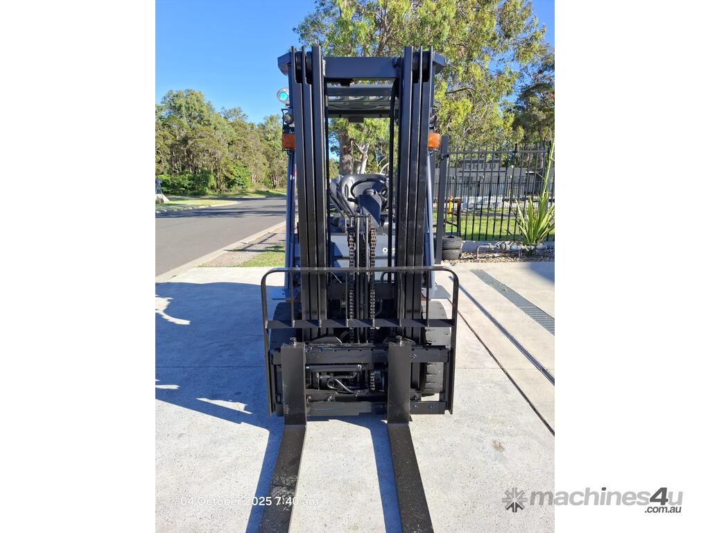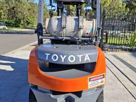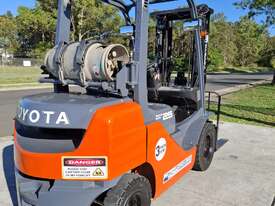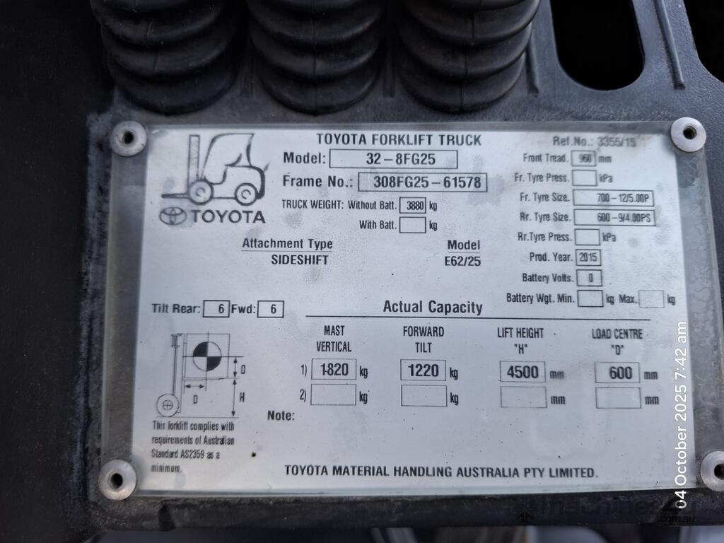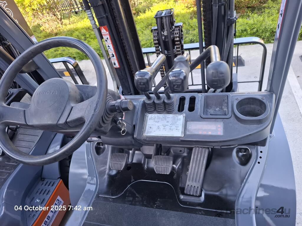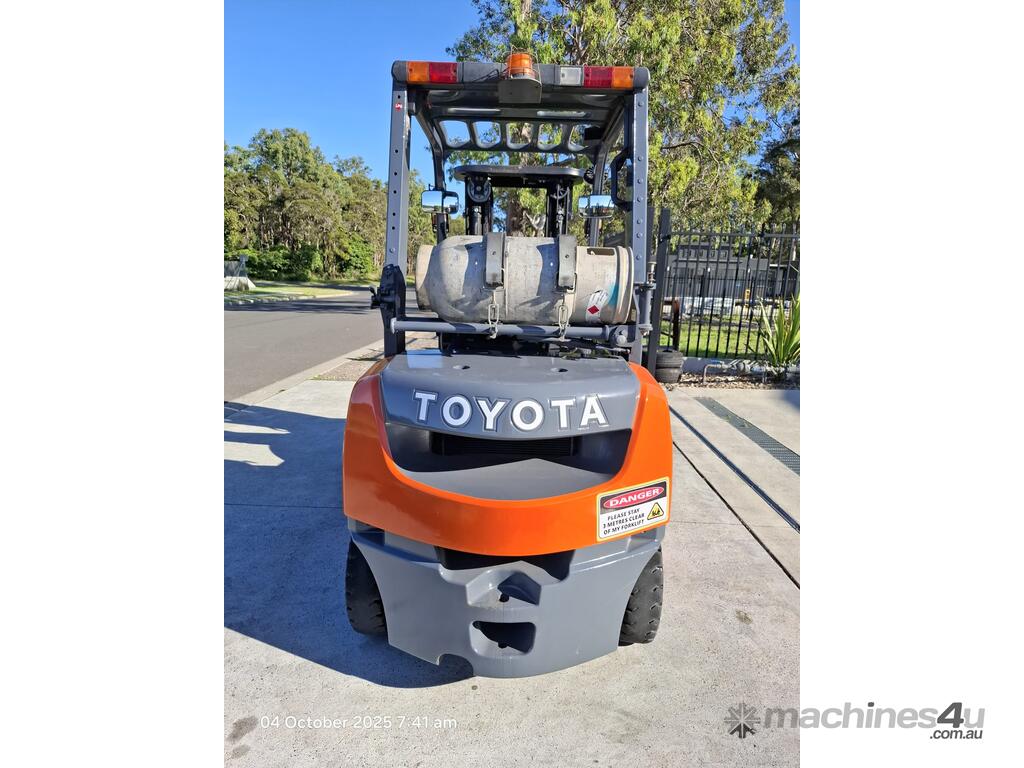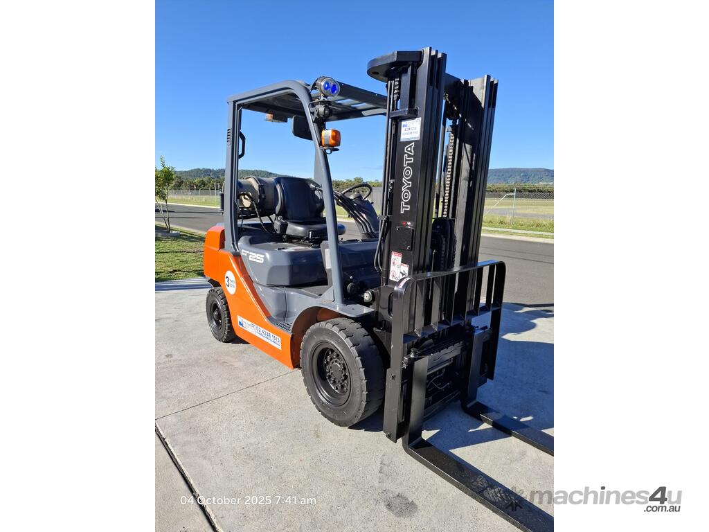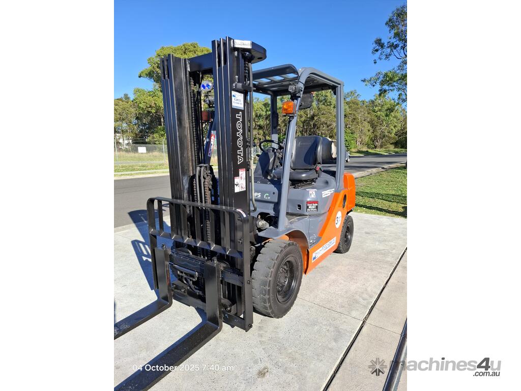 2015 Toyota 8FG25, 2.5 Tonne LPG with a 3-stage container mast with a 4.5 m lift. Fitted with side shift and good solid tyres. Blue proximity lights, also known as blue safety lights or spotlights, are installed on this forklift to warn pedestrians and other forklift operators of the forklift's presence and movement. It is freshly painted.