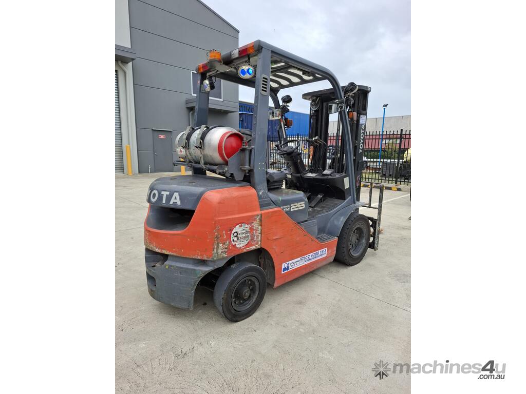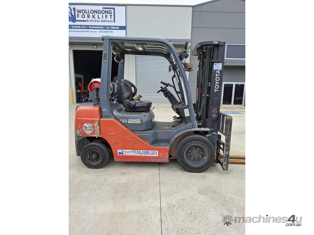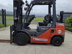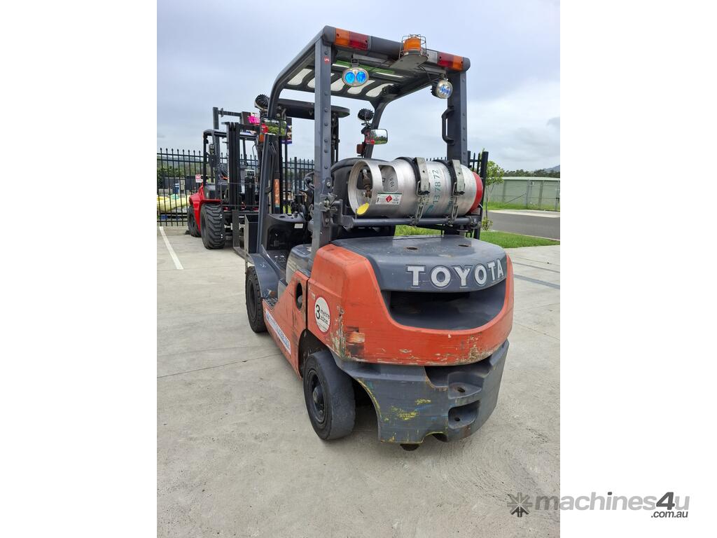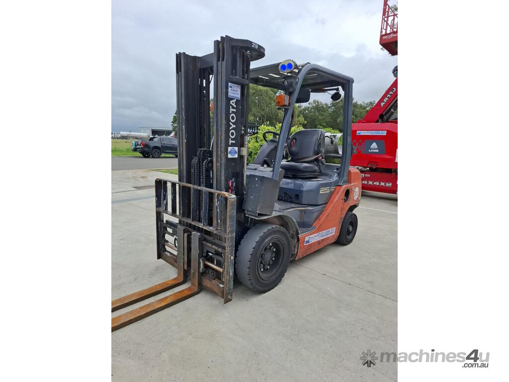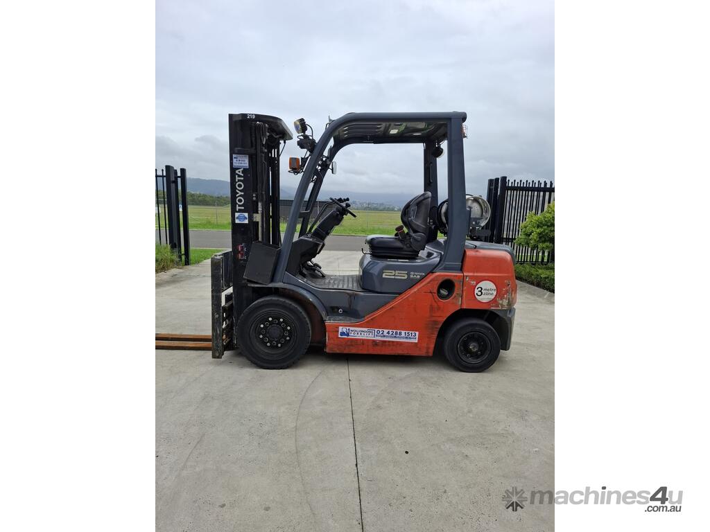 2017 Toyota 8FG25, 2.5 Tonne LPG with a 3-stage container mast with lifting capacity of 4.5m. Fitted with side shift, fork positioners and blue safety lights.