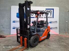 2018 Toyota 8FG25, 2.5 Tonne LPG with a 3-stage standard mast with a 5.5 m lift. Fitted with side shift, in-build digital scale and good solid tyres. It is freshly painted.
