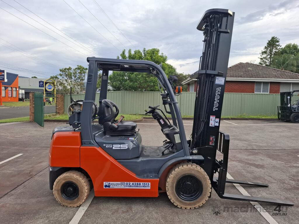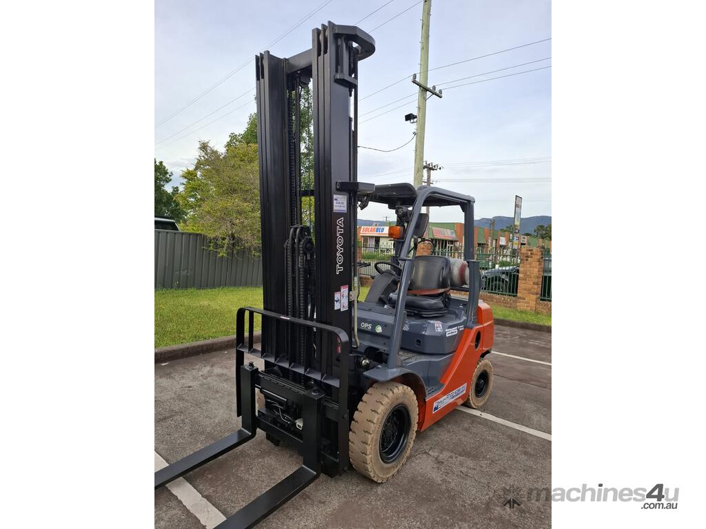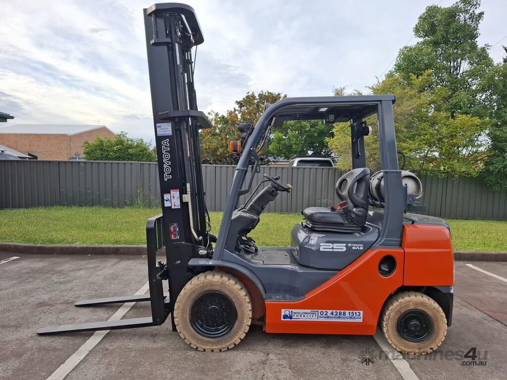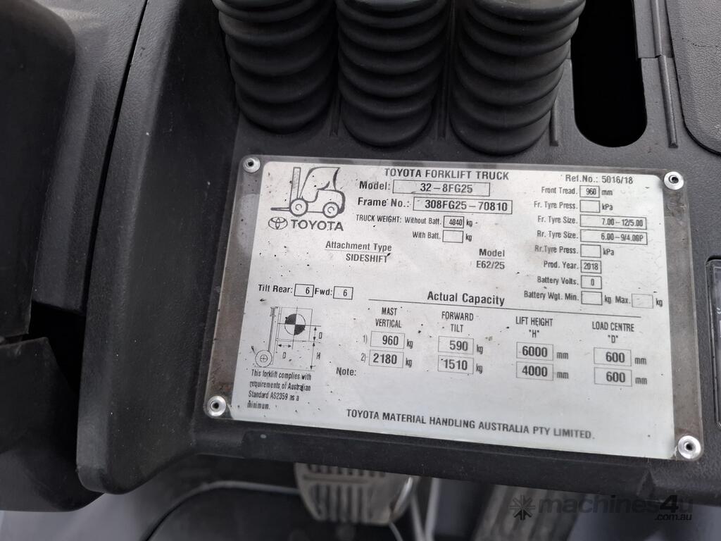 2018 Toyota 8FG25, 2.5 Tonne LPG with a 3-stage standard mast with desirable lifting capacity of 6.5m. Fitted with side shift, in-build digital scale and good non-marking solid tyres.