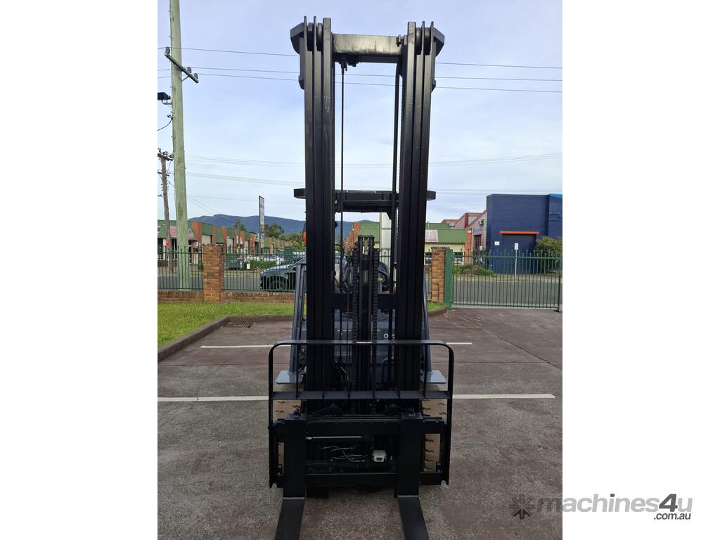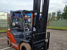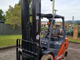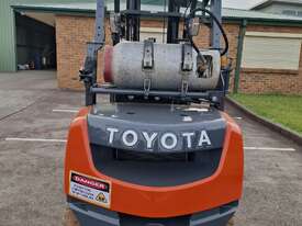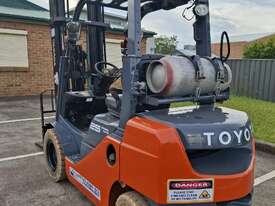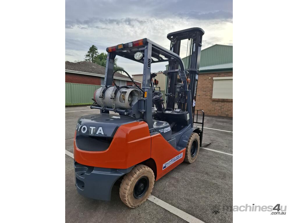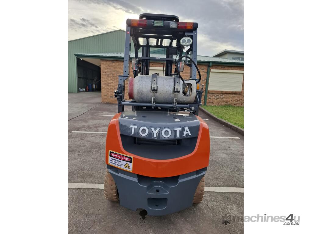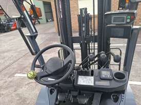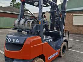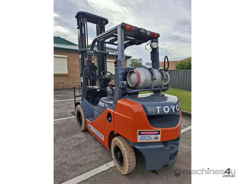 2018 Toyota 8FG25, 2.5 Tonne LPG with a 3-stage standard mast with desirable lifting capacity of 6.5m. Fitted with side shift, in-build digital scale and good non-marking solid tyres.