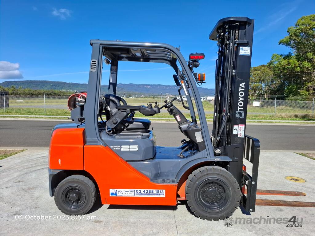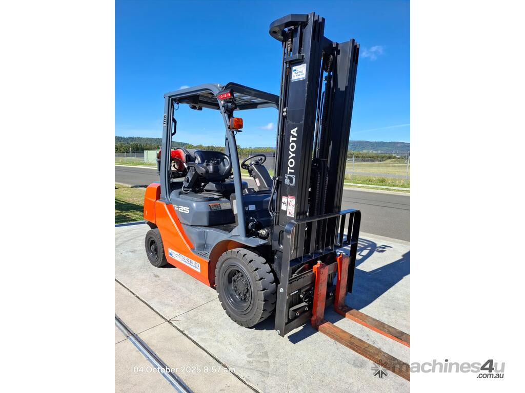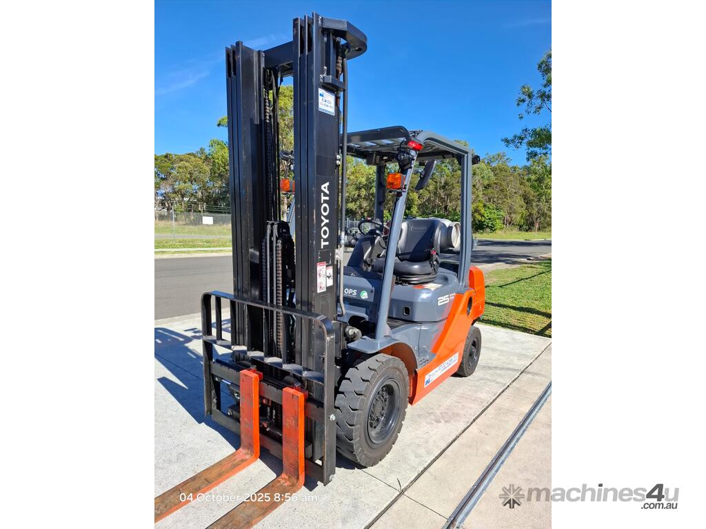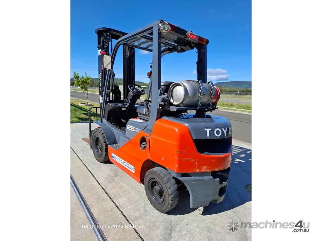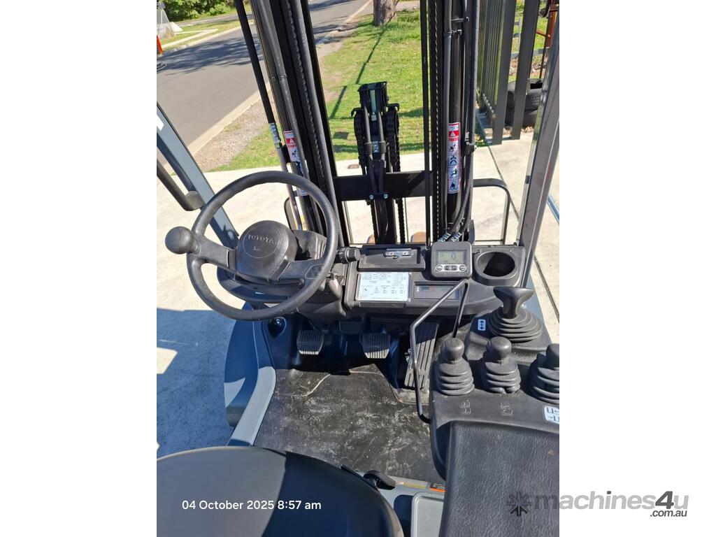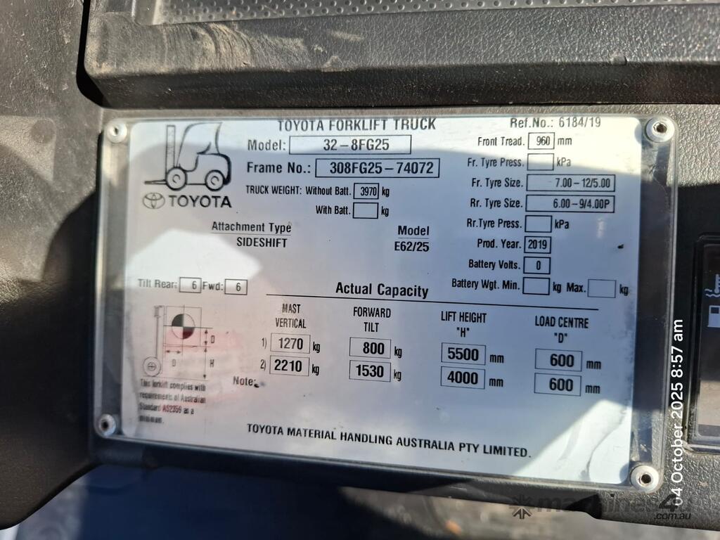 2019 Toyota 8FG25, 2.5 Tonne LPG with a 3-stage standard mast with a 5.5 m lift. Fitted with side shift, in-build digital scale and good solid tyres. It is freshly painted.