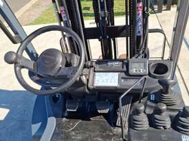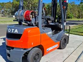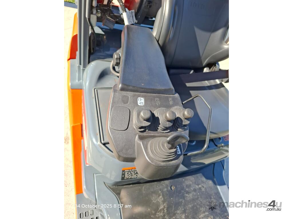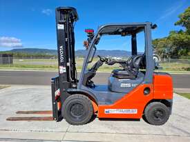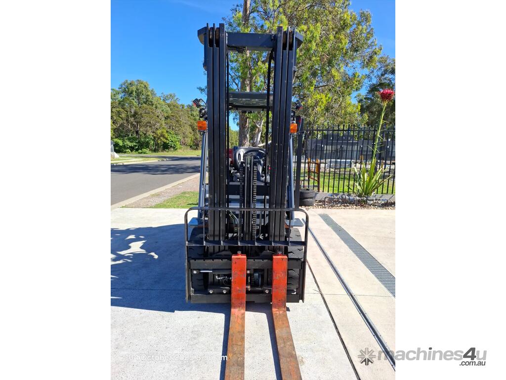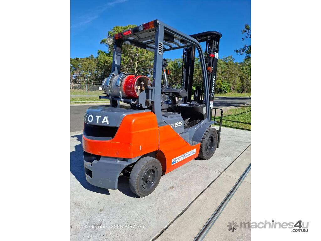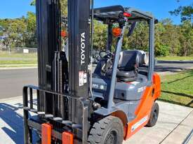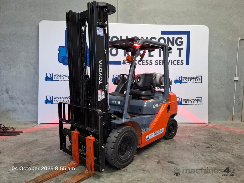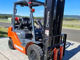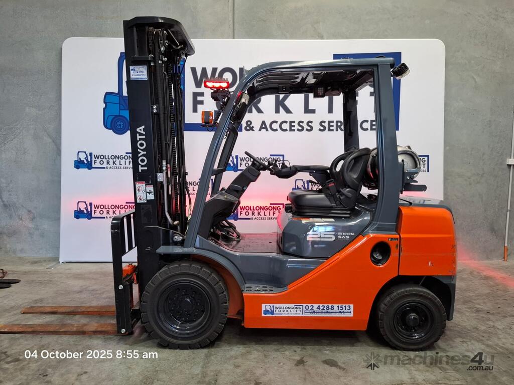 2019 Toyota 8FG25, 2.5 Tonne LPG with a 3-stage standard mast with a 5.5 m lift. Fitted with side shift, in-build digital scale and good solid tyres. It is freshly painted.