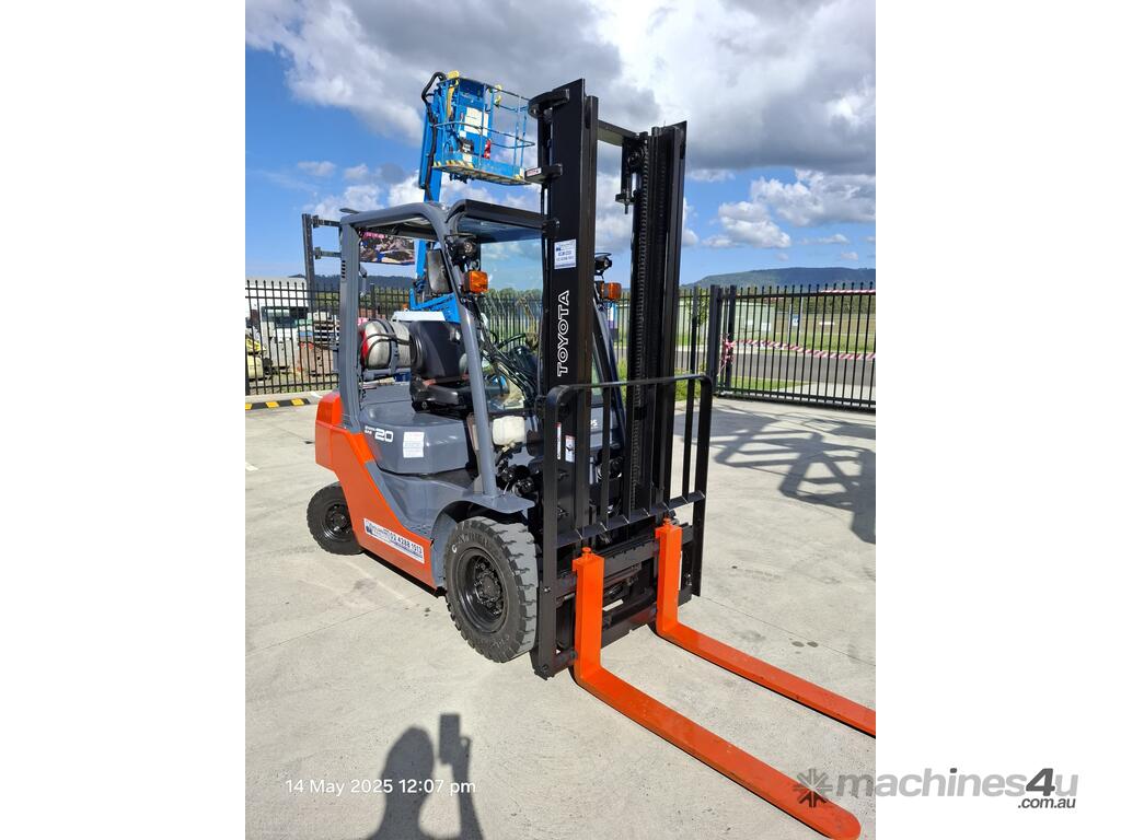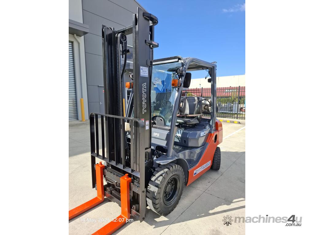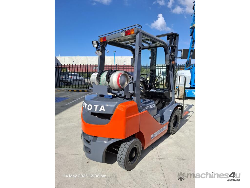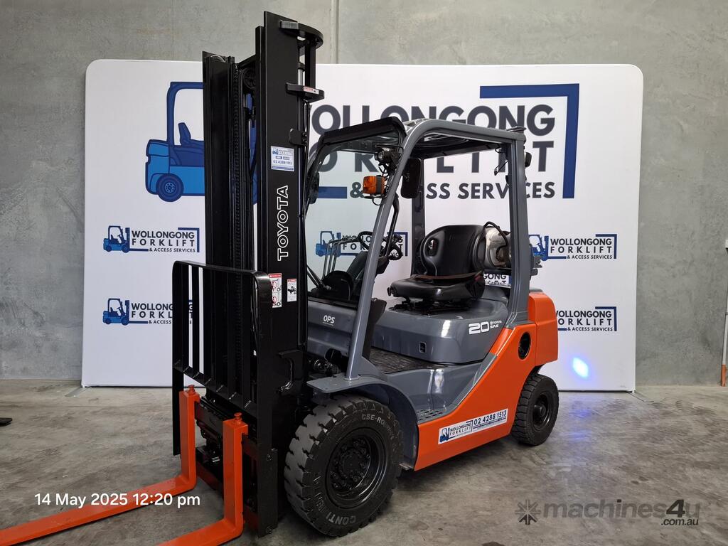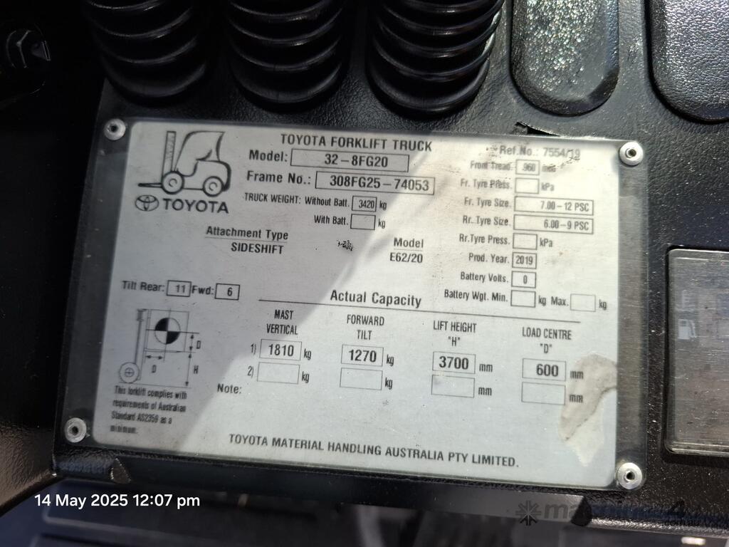 2019 Toyota 8FG20, 2 Tonne LPG with a 2-stage standard mast with lifting capacity of 3.7m. Fitted with side shift and good new solid tyres. The machine has glass cover at the front protecting the operator from rain.
